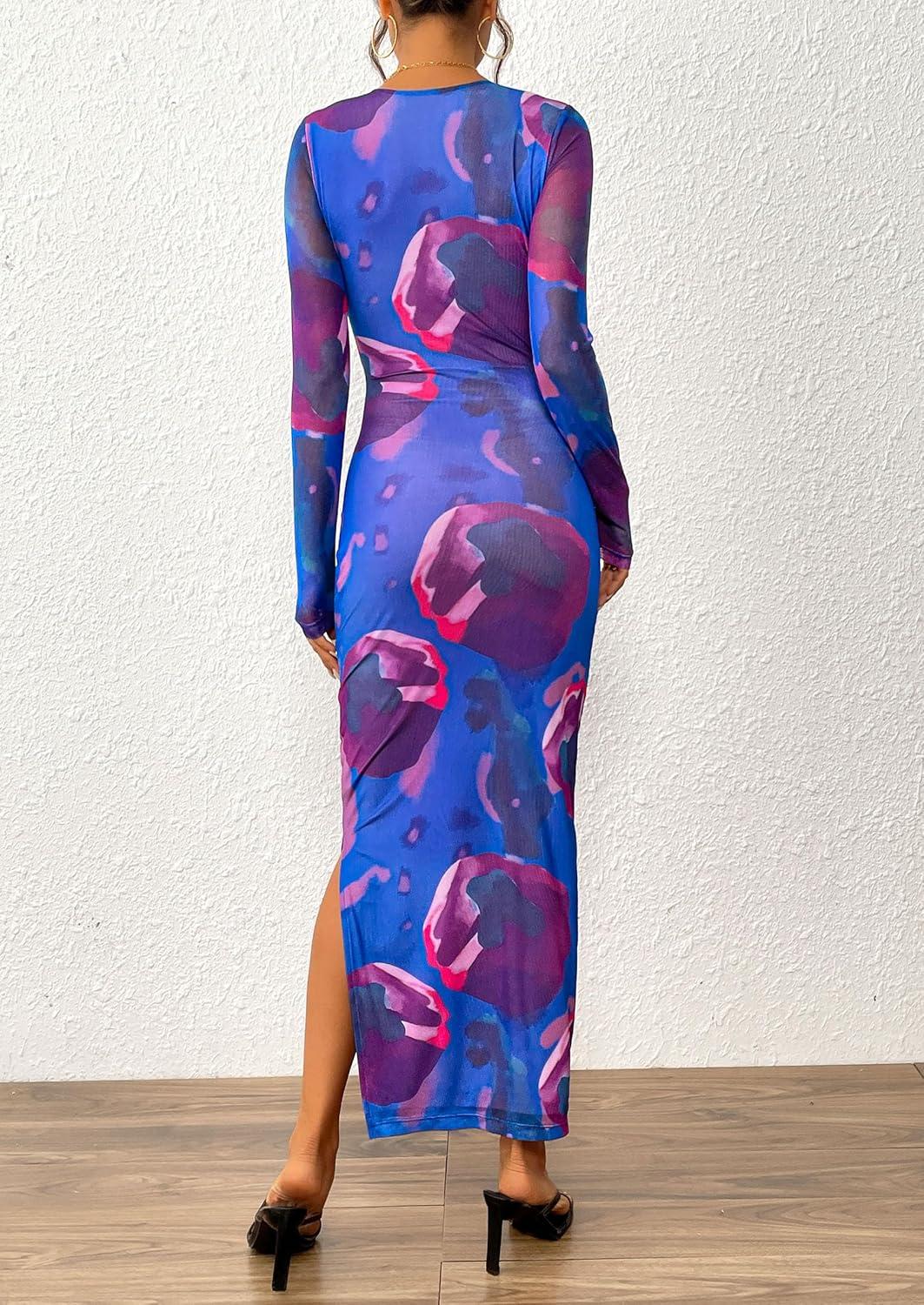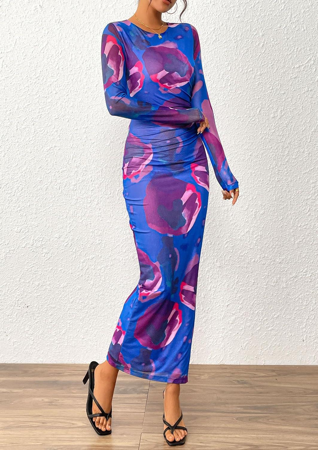 PRETTYGARDEN Women's Bodycon Maxi Dress Fall Spring Fashion Long Sleeve Floral Print Tight Fitted Party Club Ruched Dresses(Purple Blue)