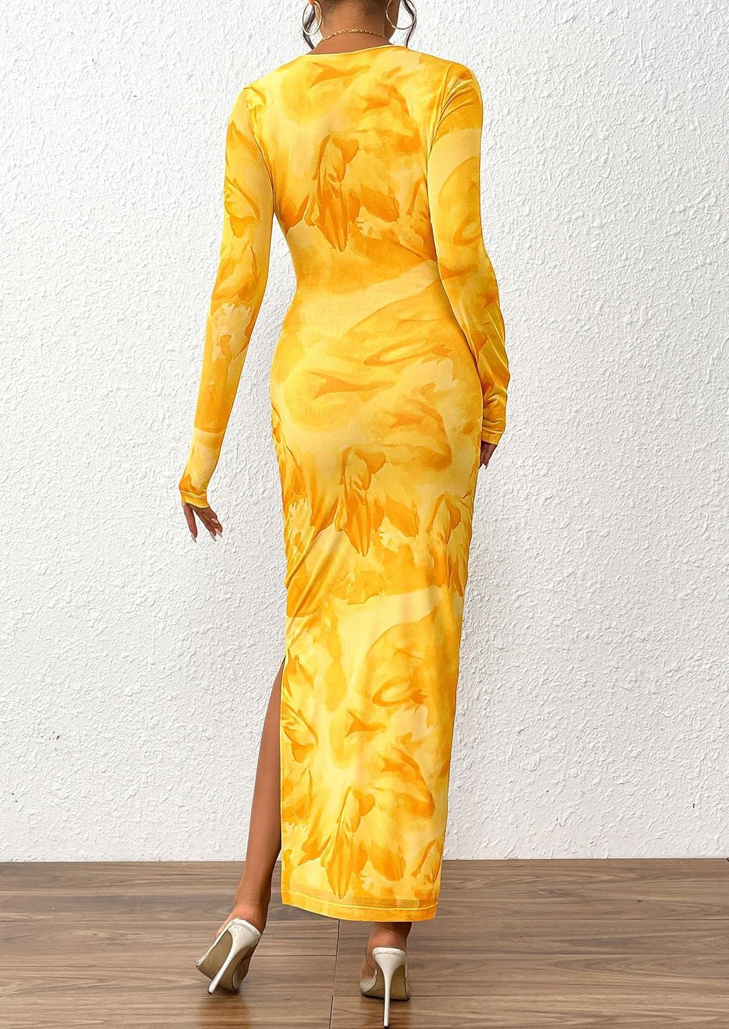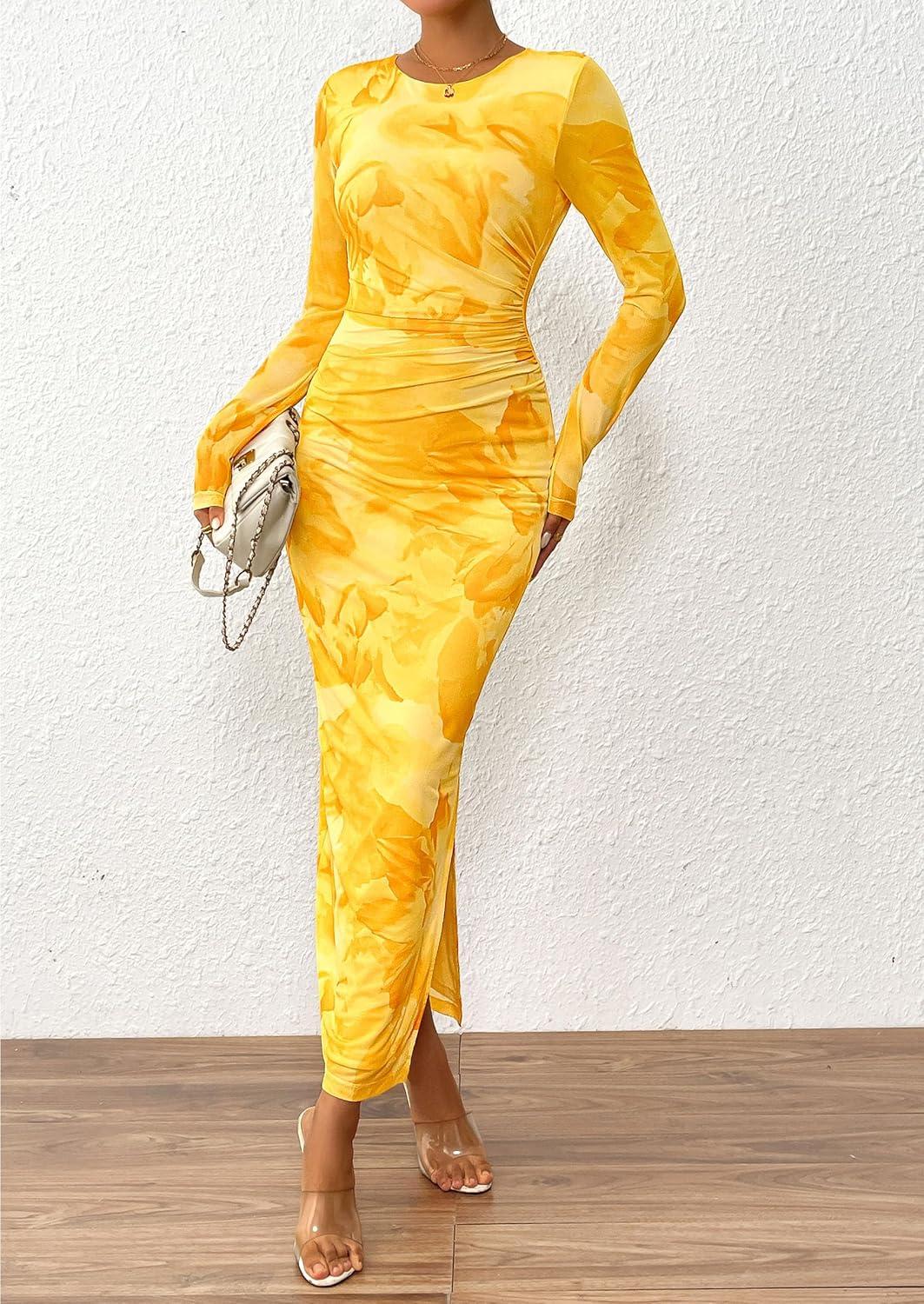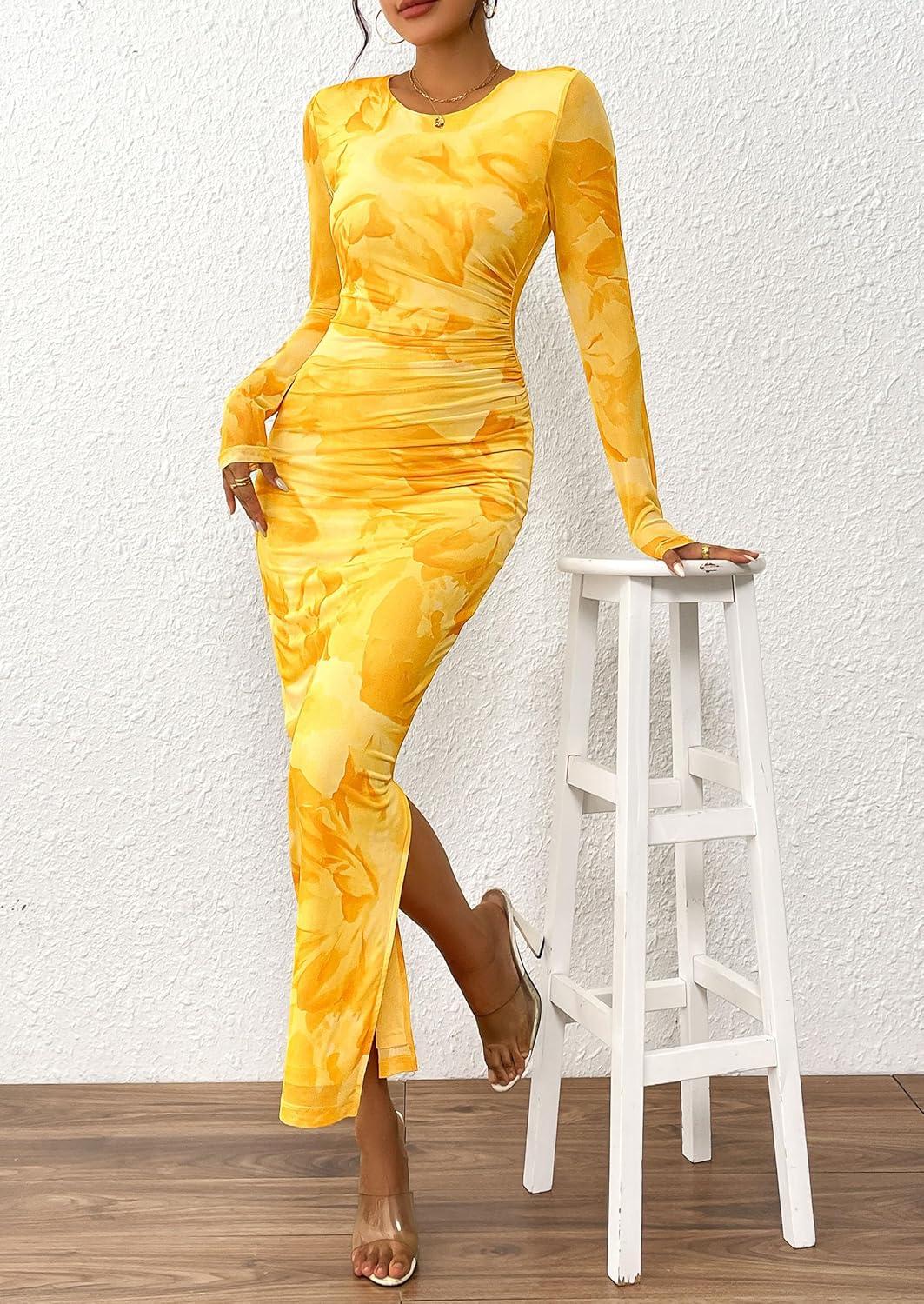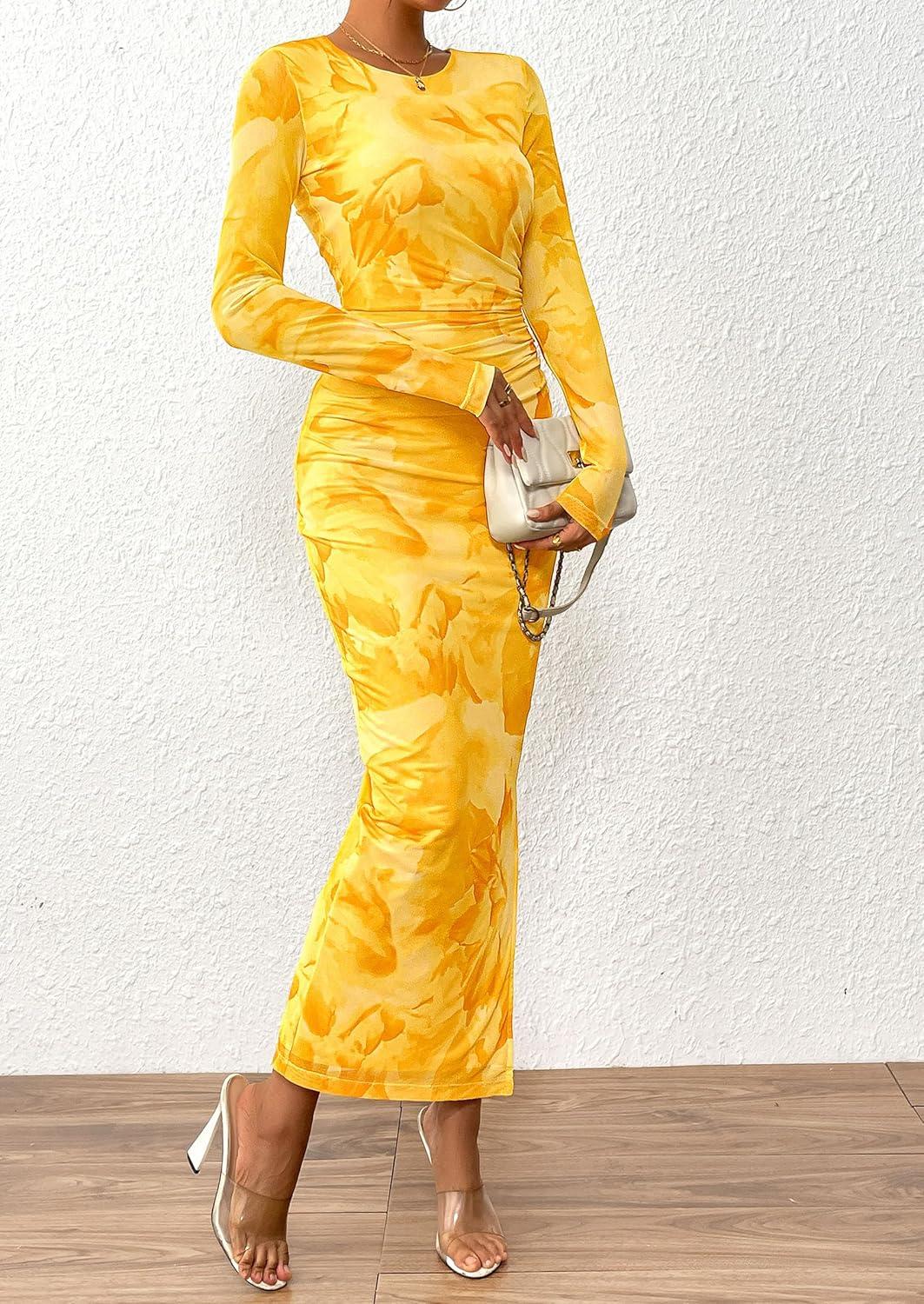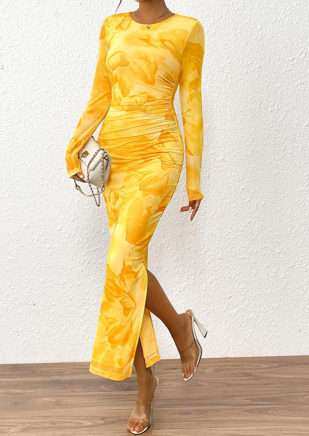 PRETTYGARDEN Women's Bodycon Maxi Dress Fall Spring Fashion Long Sleeve Floral Print Tight Fitted Party Club Ruched Dresses(Yellow Big Floral)