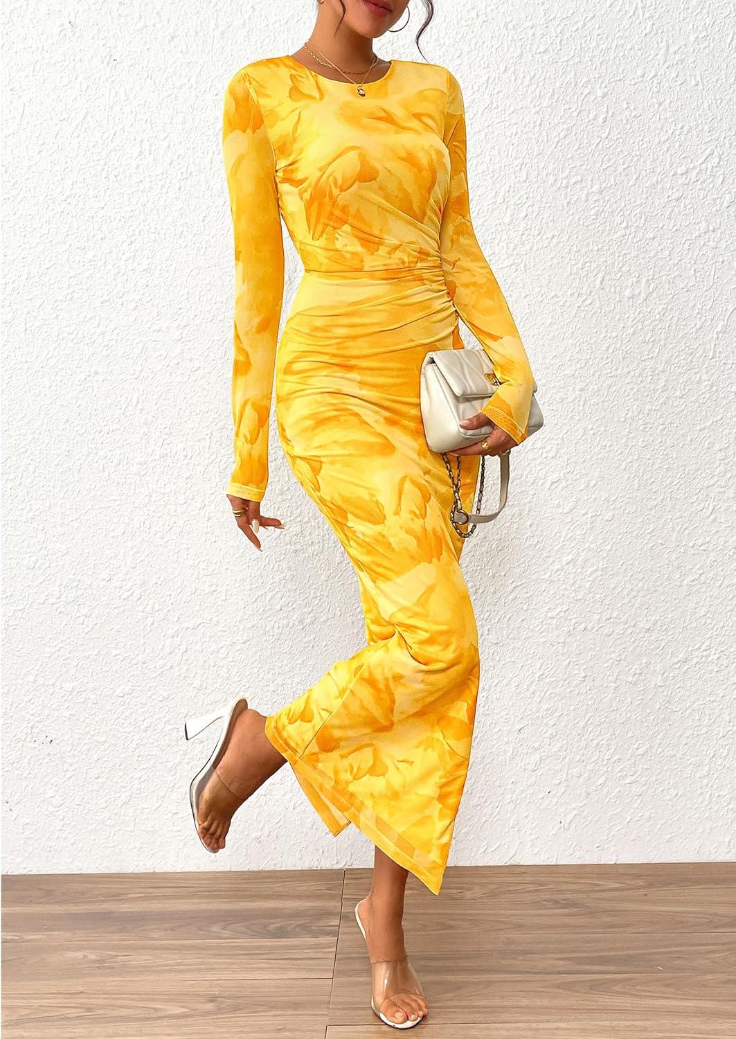 imagePRETTYGARDEN Womens Bodycon Maxi Dress Fall Spring Fashion Long Sleeve Floral Print Tight Fitted Party Club Ruched DressesYellow Big Floral