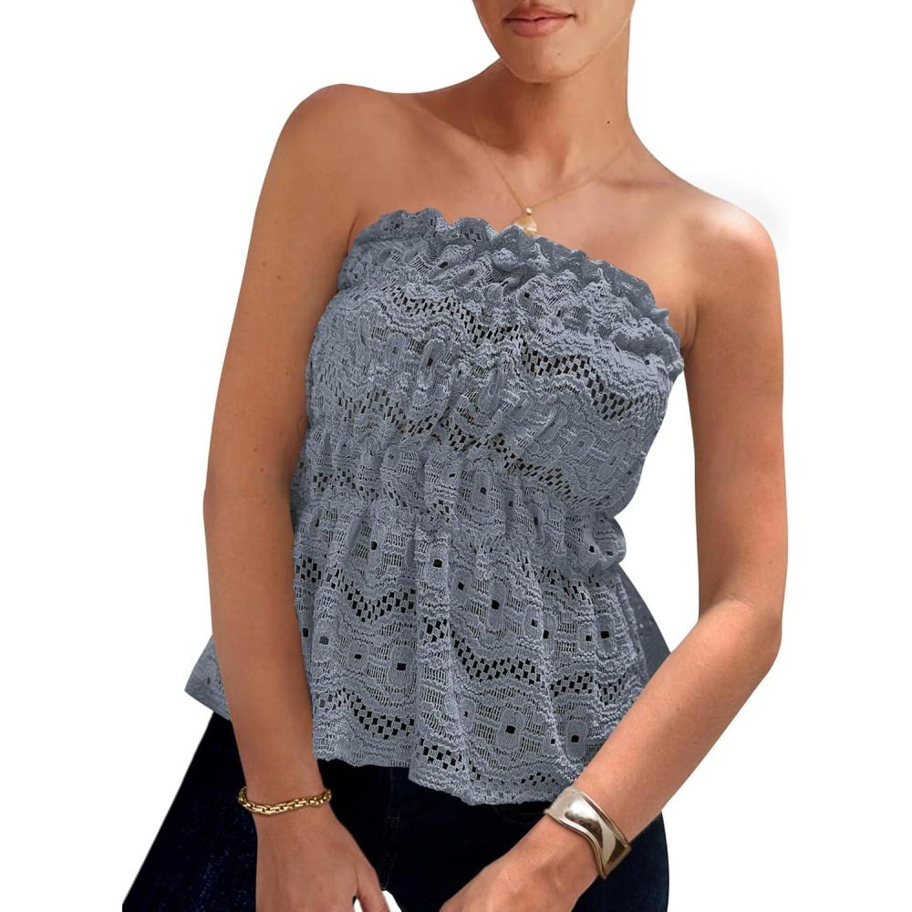imagePRETTYGARDEN Womens Boho Tube Tops 2025 Summer Strapless Off Shoulder Eyelet Smocked Peplum Trendy Going Out Bandeau TopGrey Blue
