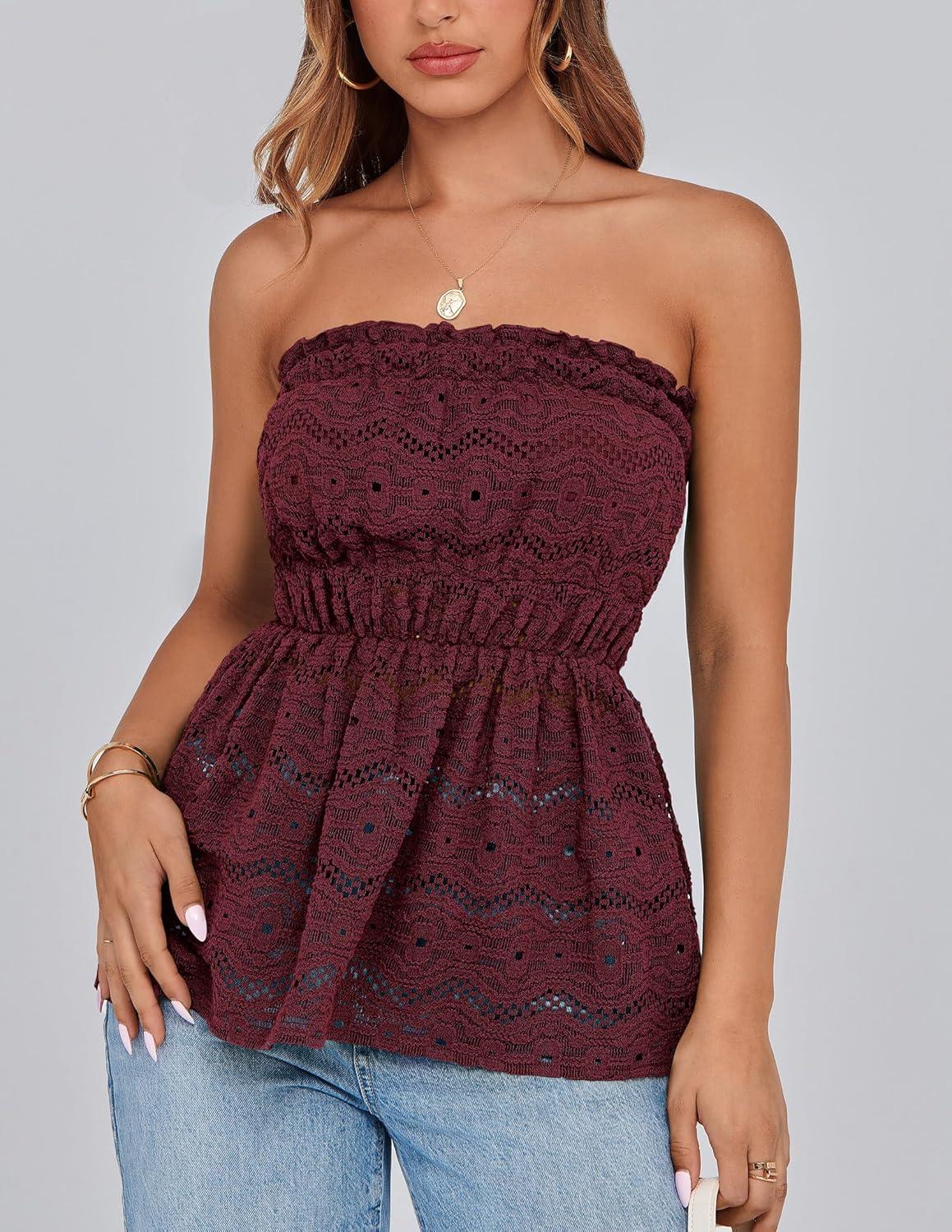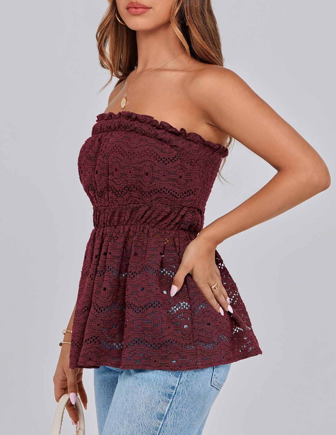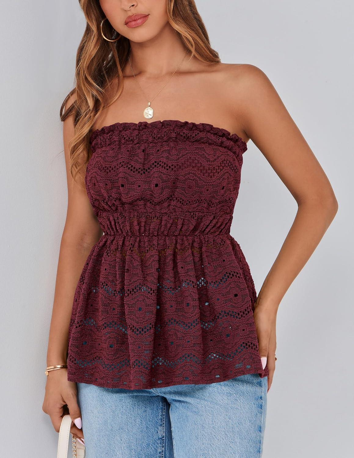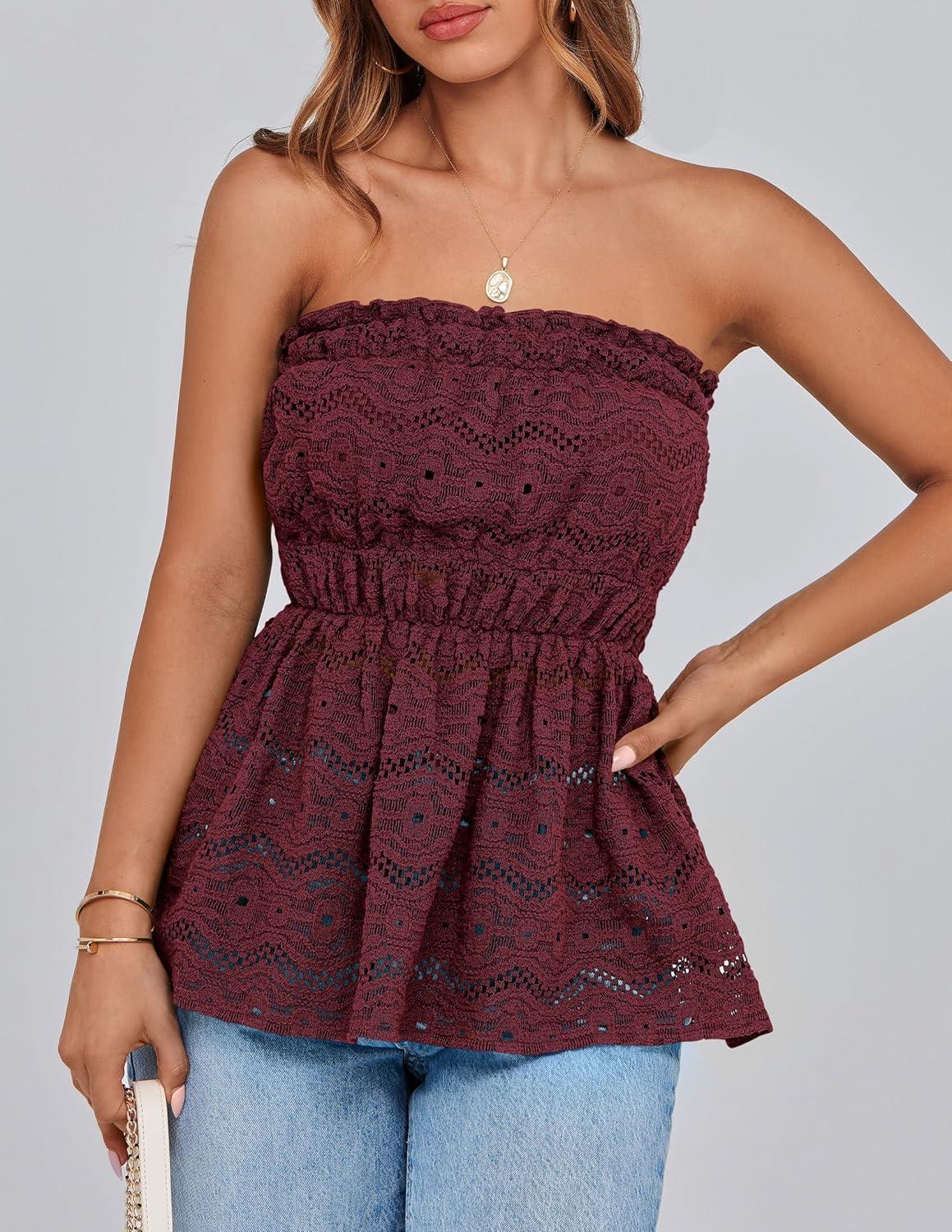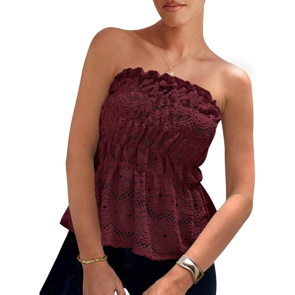 PRETTYGARDEN Women's Boho Tube Tops 2025 Summer Strapless Off Shoulder Eyelet Smocked Peplum Trendy Going Out Bandeau Top(Wine Red)