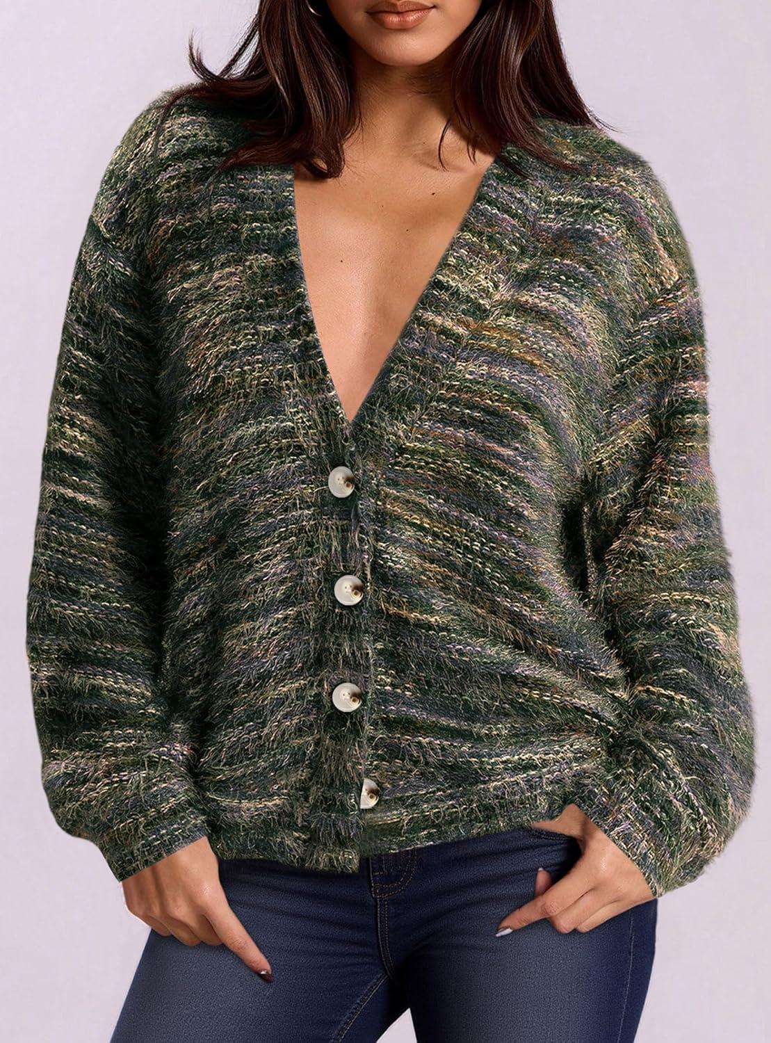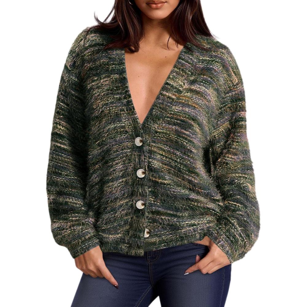 PRETTYGARDEN Womens Cardigan Sweaters Fall Fashion 2025 Striped Long Sleeve Button V Neck Knit Fuzzy Outerwear Winter Clothes(Army Green)