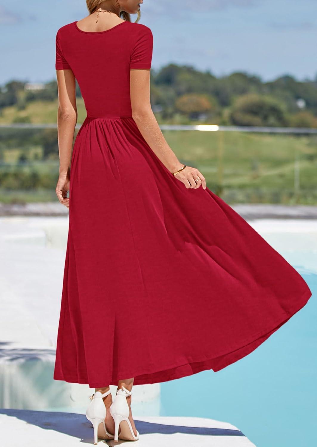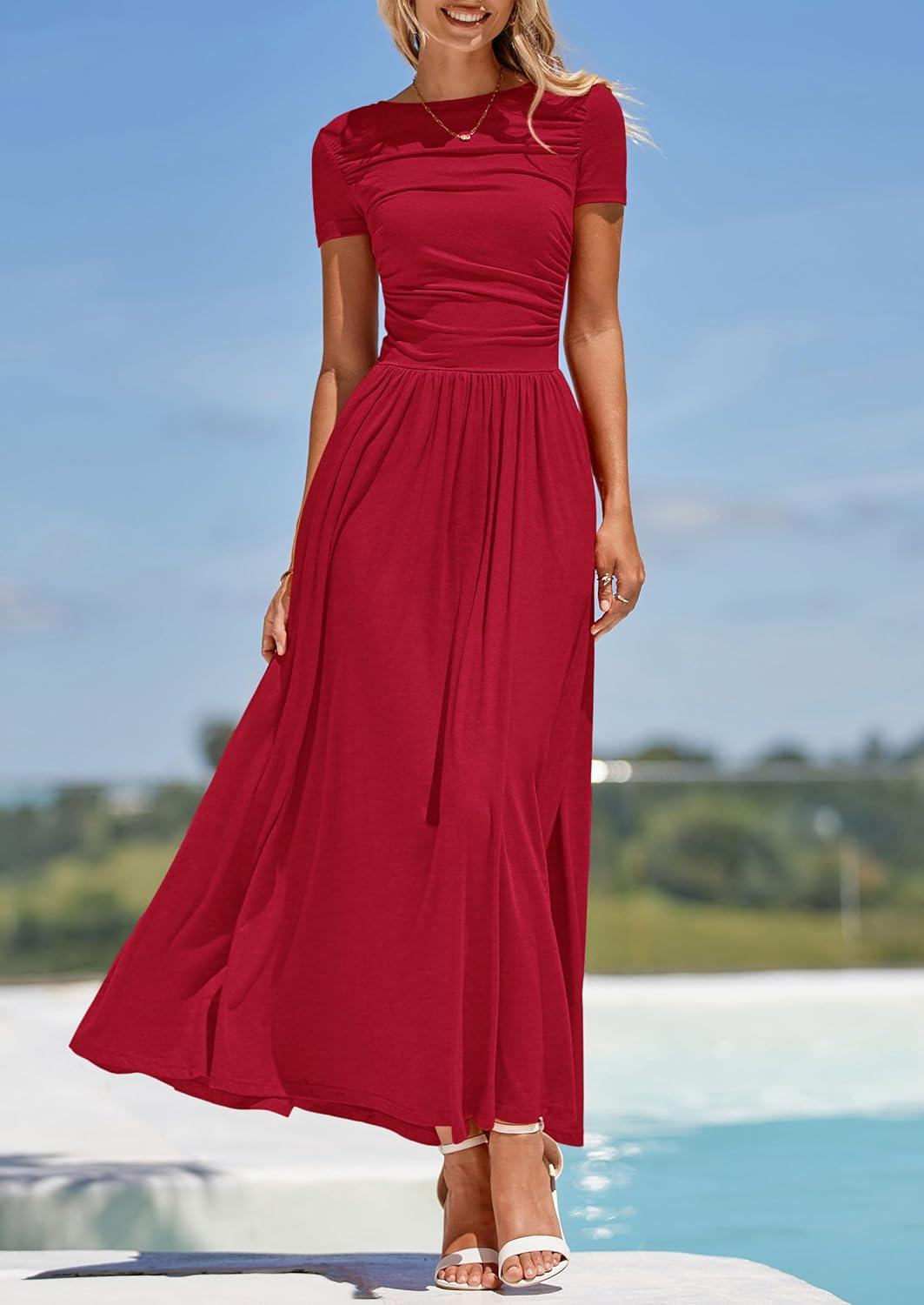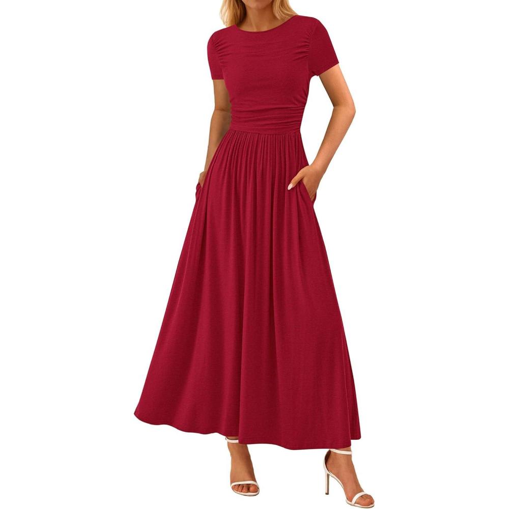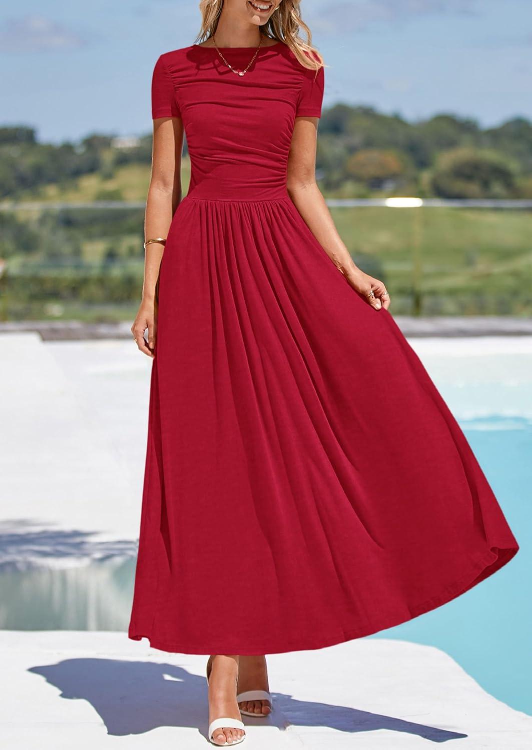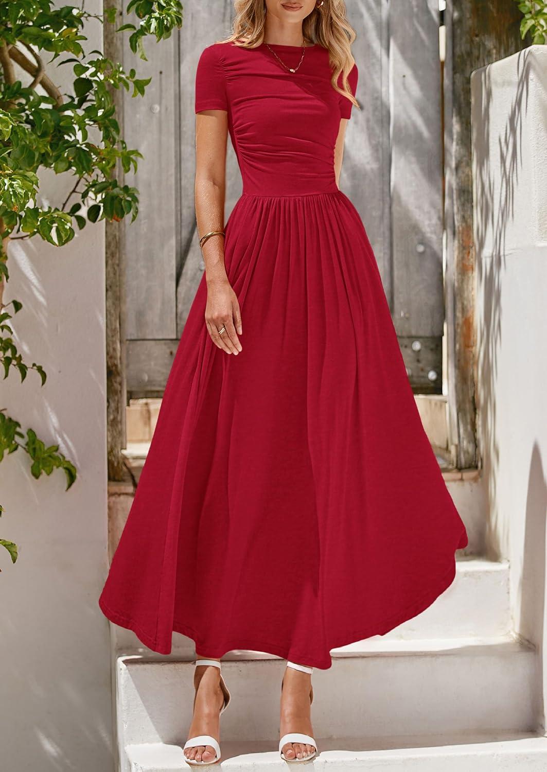 PRETTYGARDEN Women's Casual Dresses 2025 Summer Short Sleeve Ruched Patchwork A Line Pleated Swing Maxi Dress with Pockets(Red)