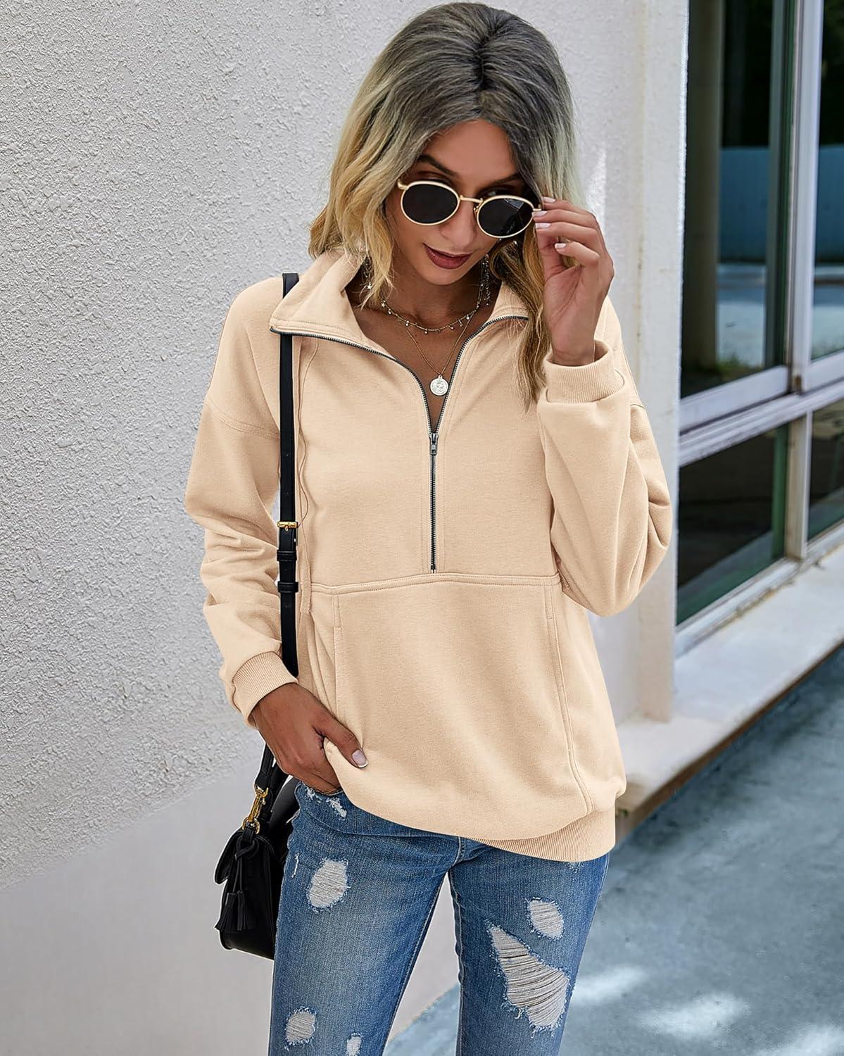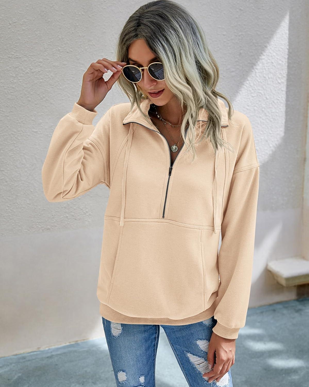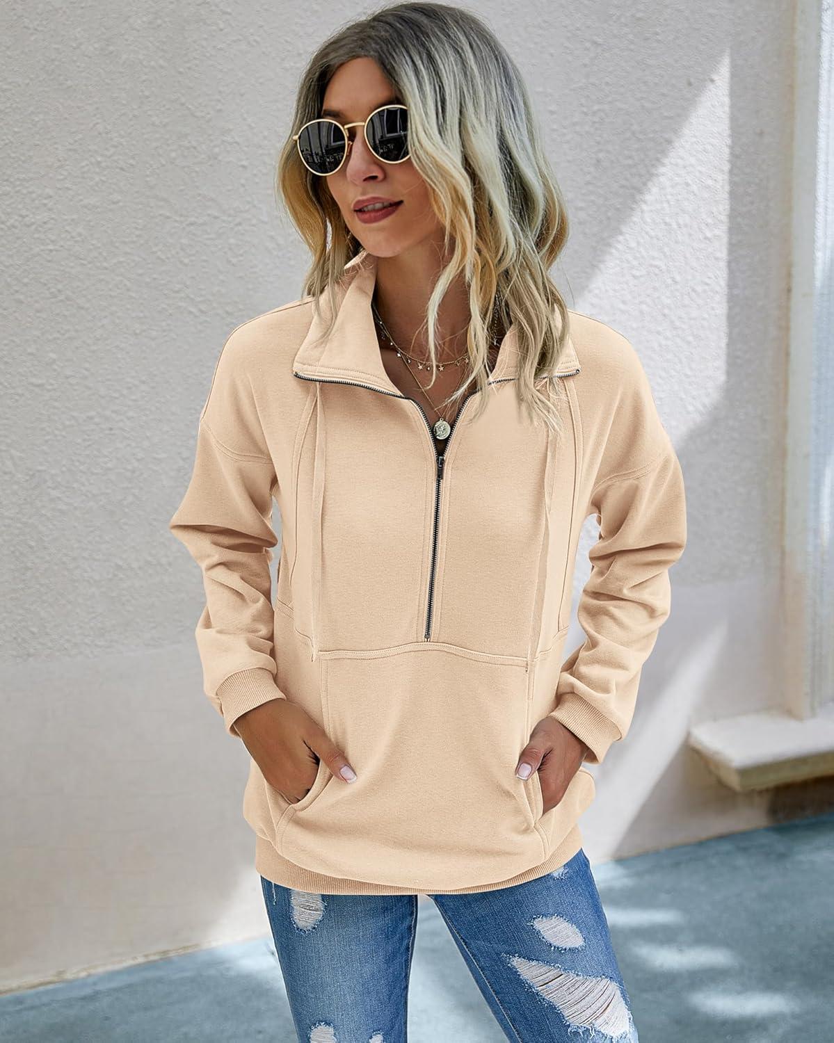 PRETTYGARDEN Women's Casual Long Sleeve Lapel Zipper Sweatshirt Drawstring Loose Pullover Tops(Apricot)
