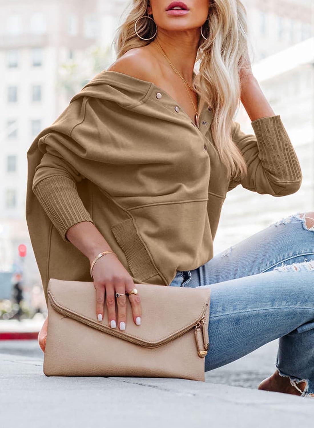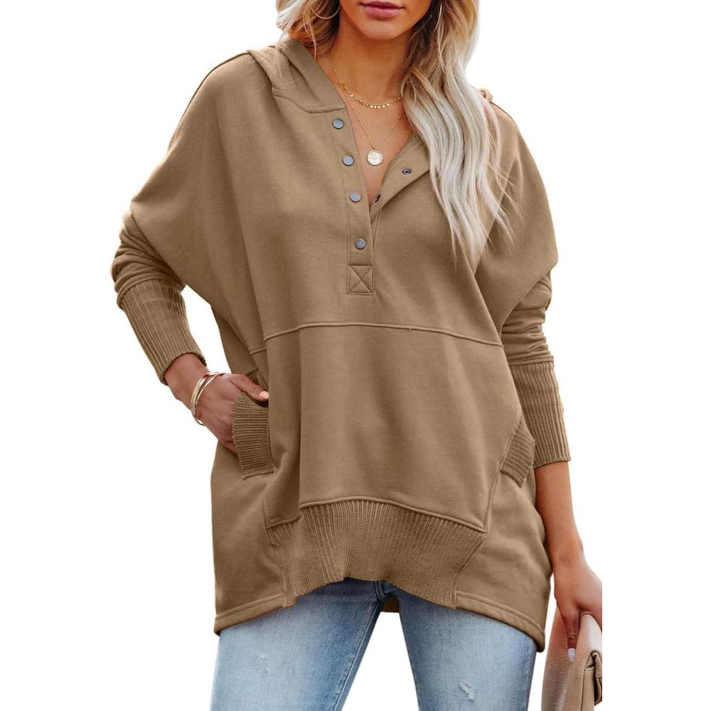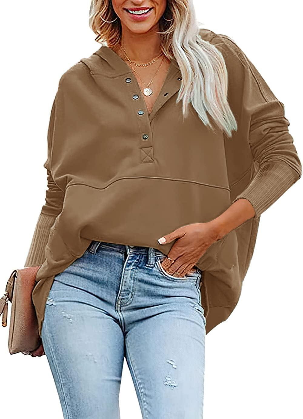 PRETTYGARDEN Women's Casual Long Sleeve Lapel Zipper Sweatshirt Drawstring Loose Pullover Tops(Button Coffee)
