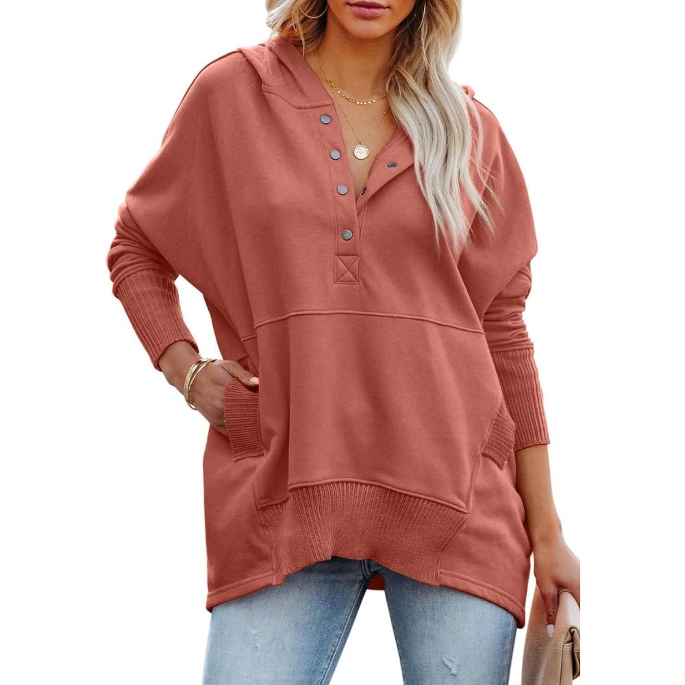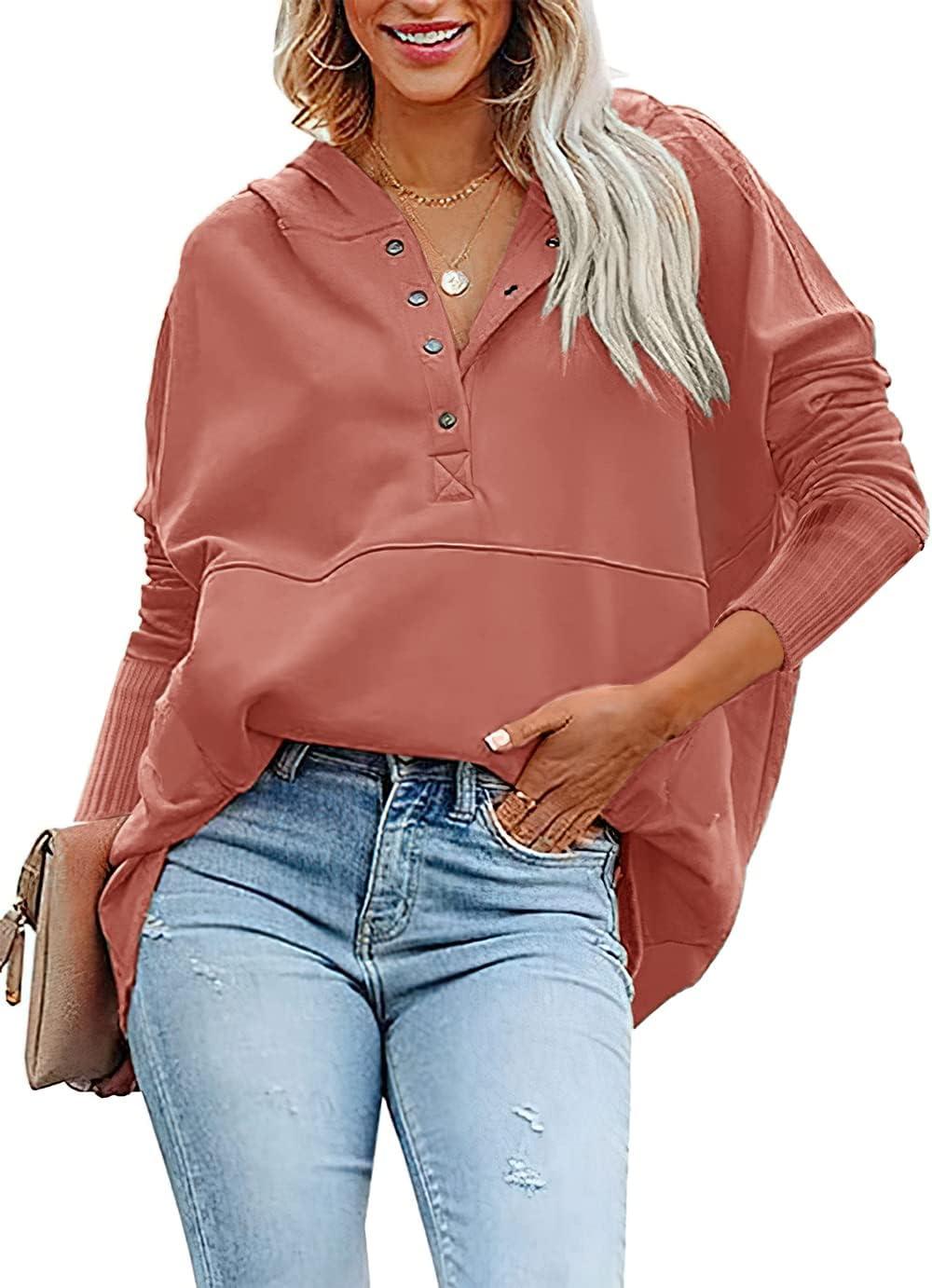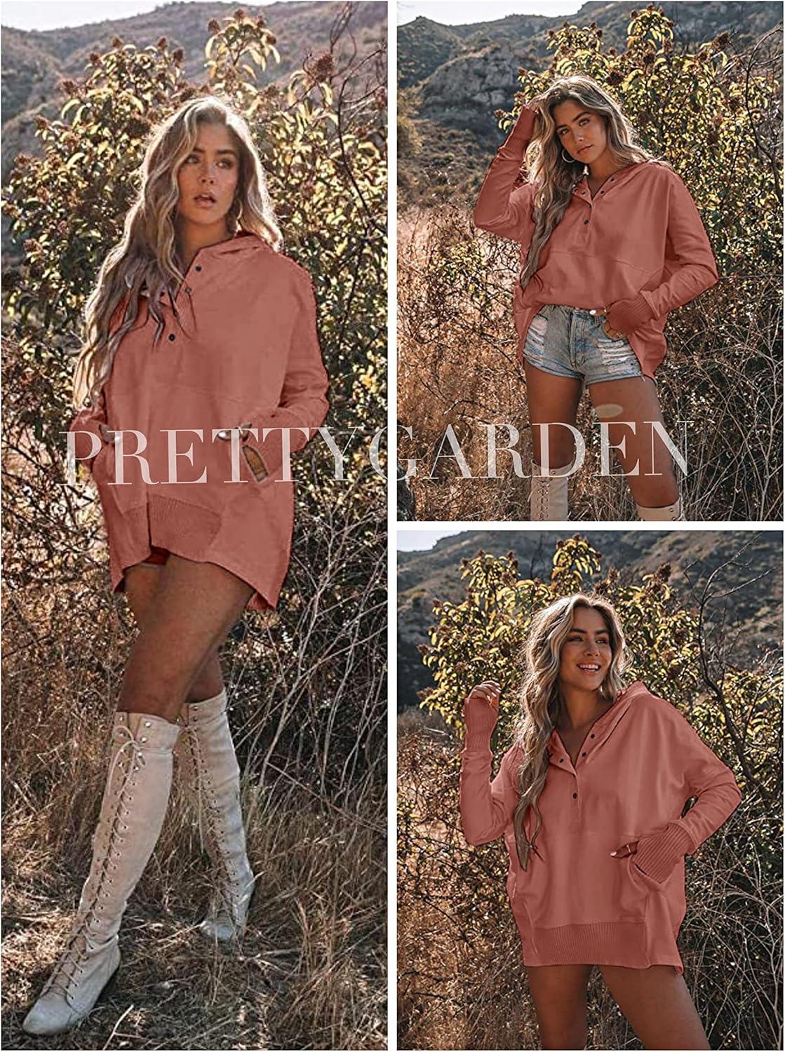 PRETTYGARDEN Women’s Casual Long Sleeve Lapel Zipper Sweatshirt Drawstring Loose Pullover Tops(Button Orange Pink)