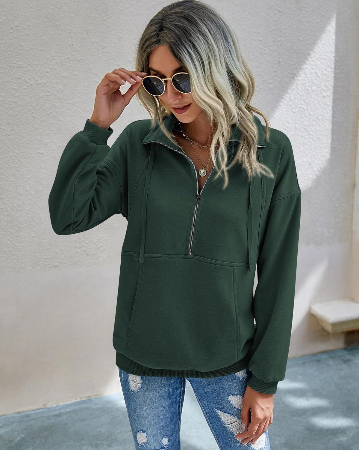 PRETTYGARDEN Women's Casual Long Sleeve Lapel Zipper Sweatshirt Drawstring Loose Pullover Tops(Dark Green)