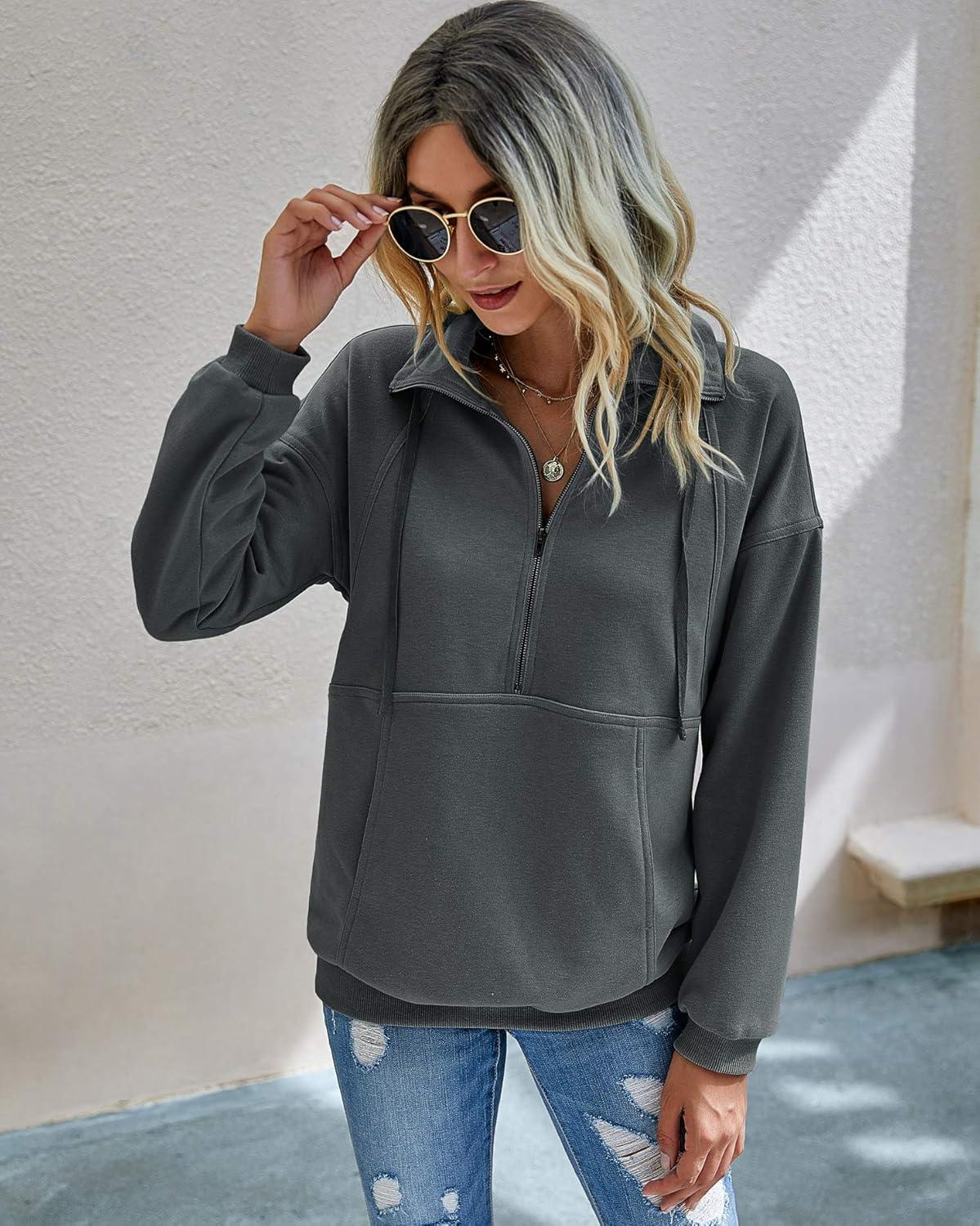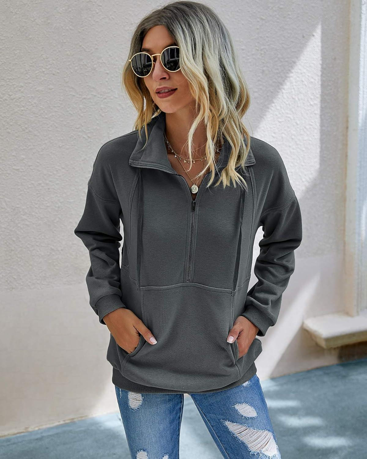 PRETTYGARDEN Women's Casual Long Sleeve Lapel Zipper Sweatshirt Drawstring Loose Pullover Tops(Dark Grey)