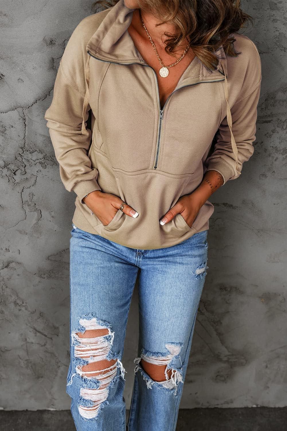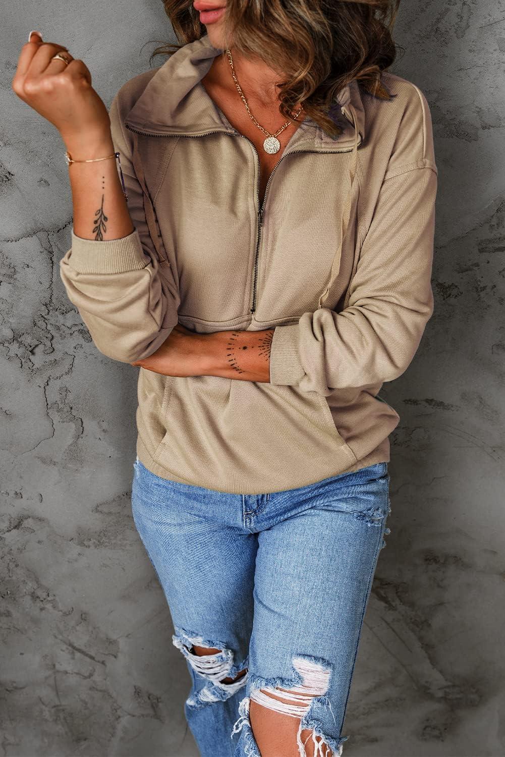 PRETTYGARDEN Women's Casual Long Sleeve Lapel Zipper Sweatshirt Drawstring Loose Pullover Tops(Khaki)