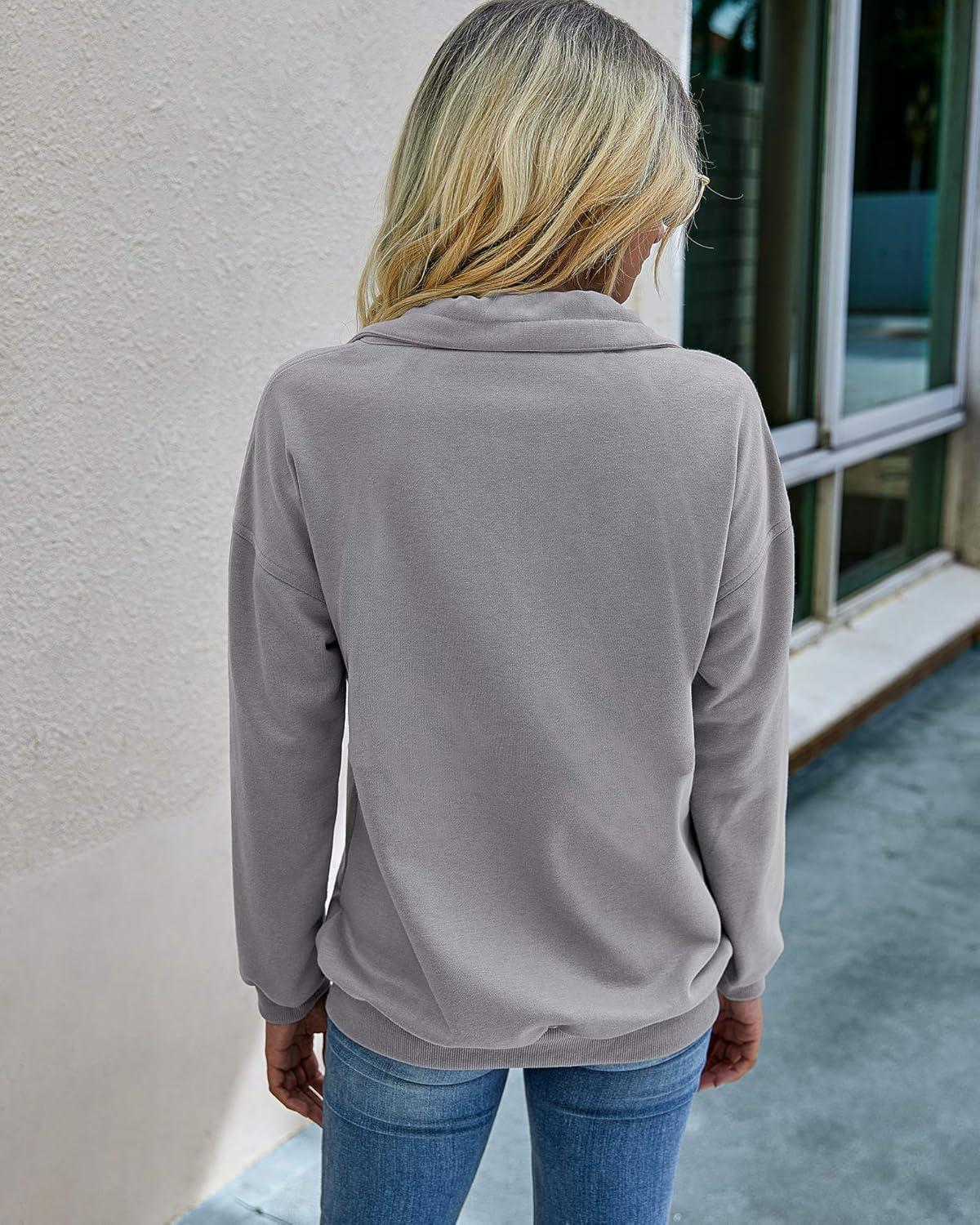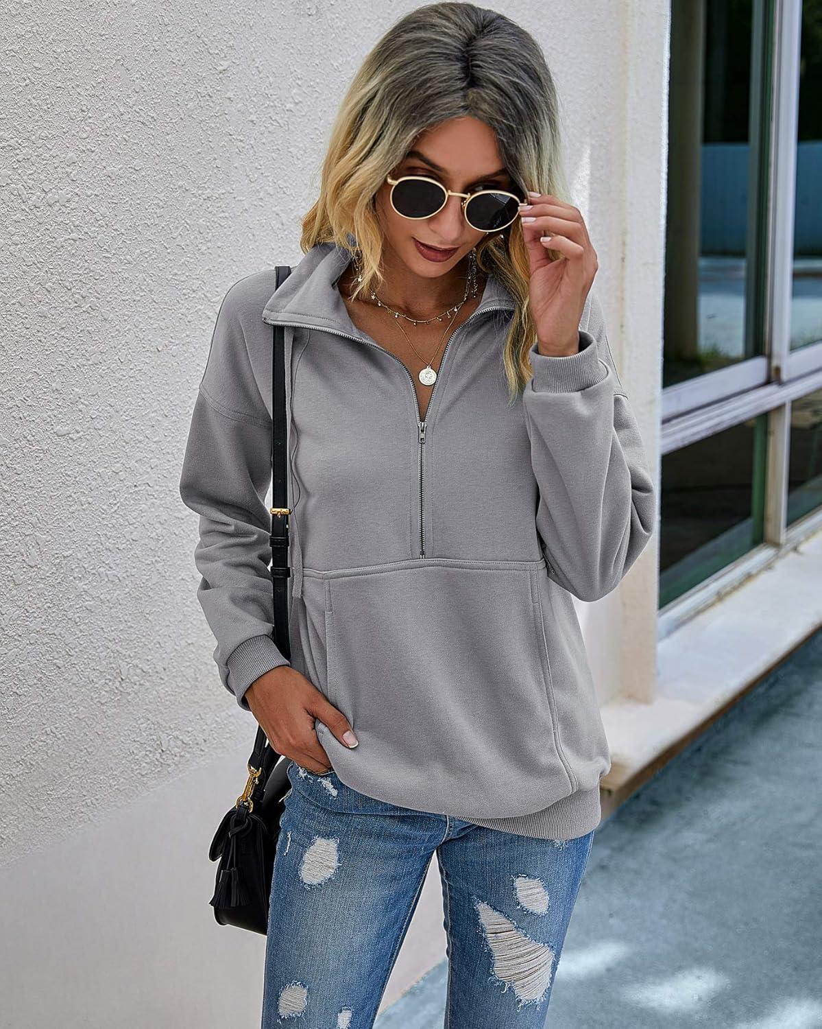 PRETTYGARDEN Women's Casual Long Sleeve Lapel Zipper Sweatshirt Drawstring Loose Pullover Tops(Light Grey)