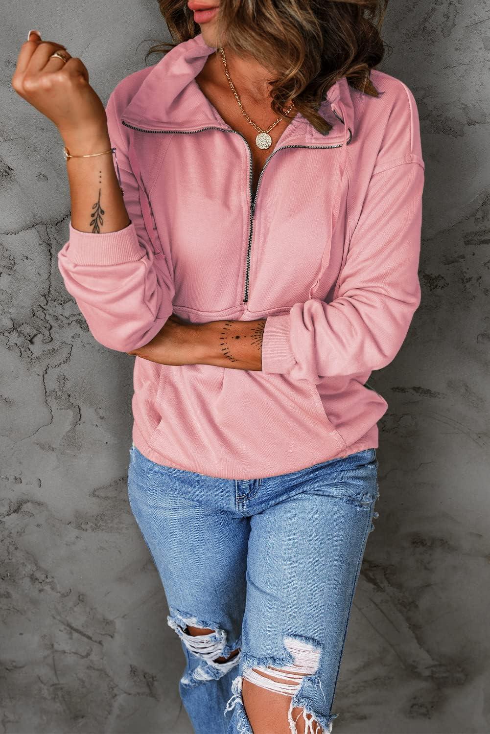 PRETTYGARDEN Women's Casual Long Sleeve Lapel Zipper Sweatshirt Drawstring Loose Pullover Tops(Light Pink)