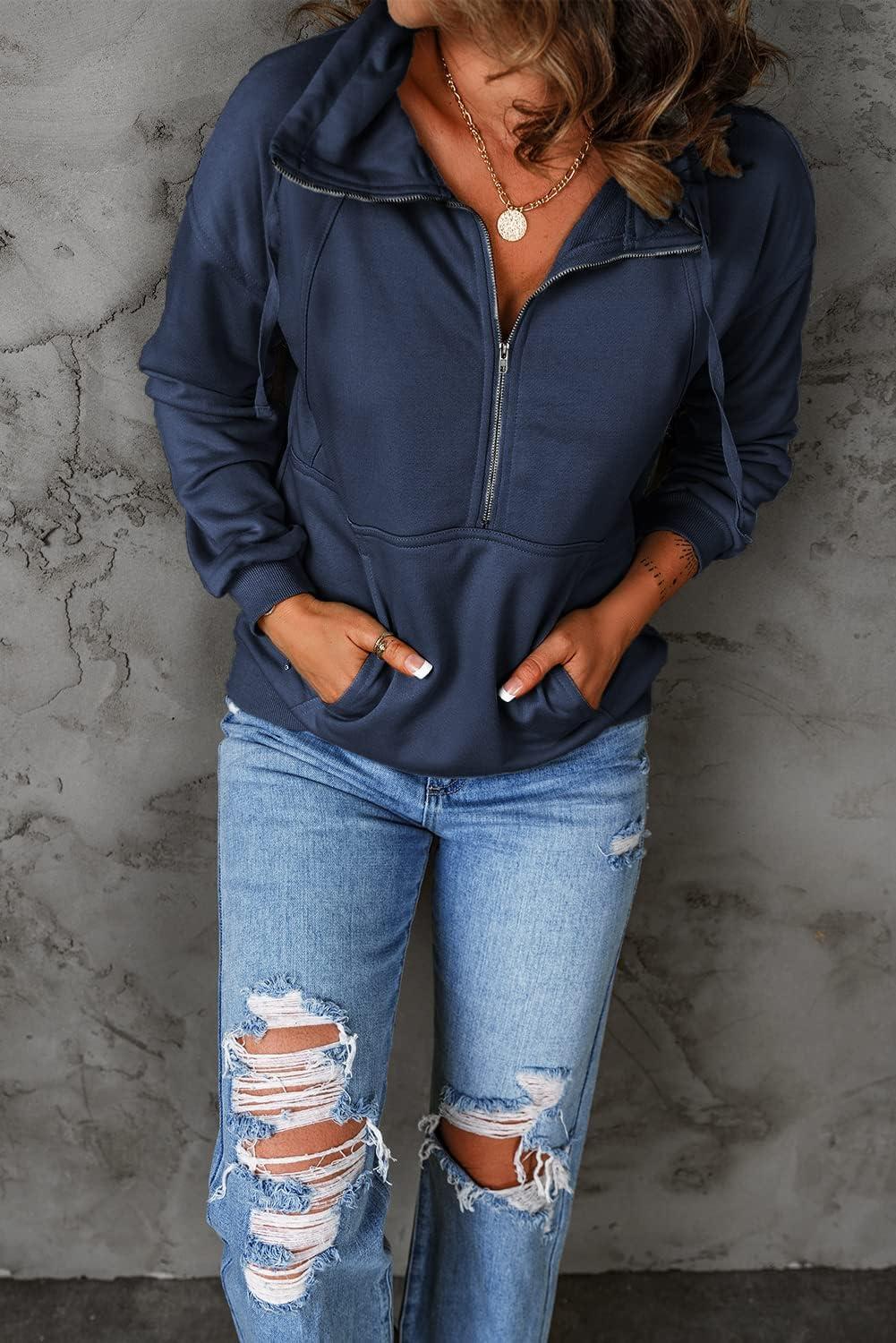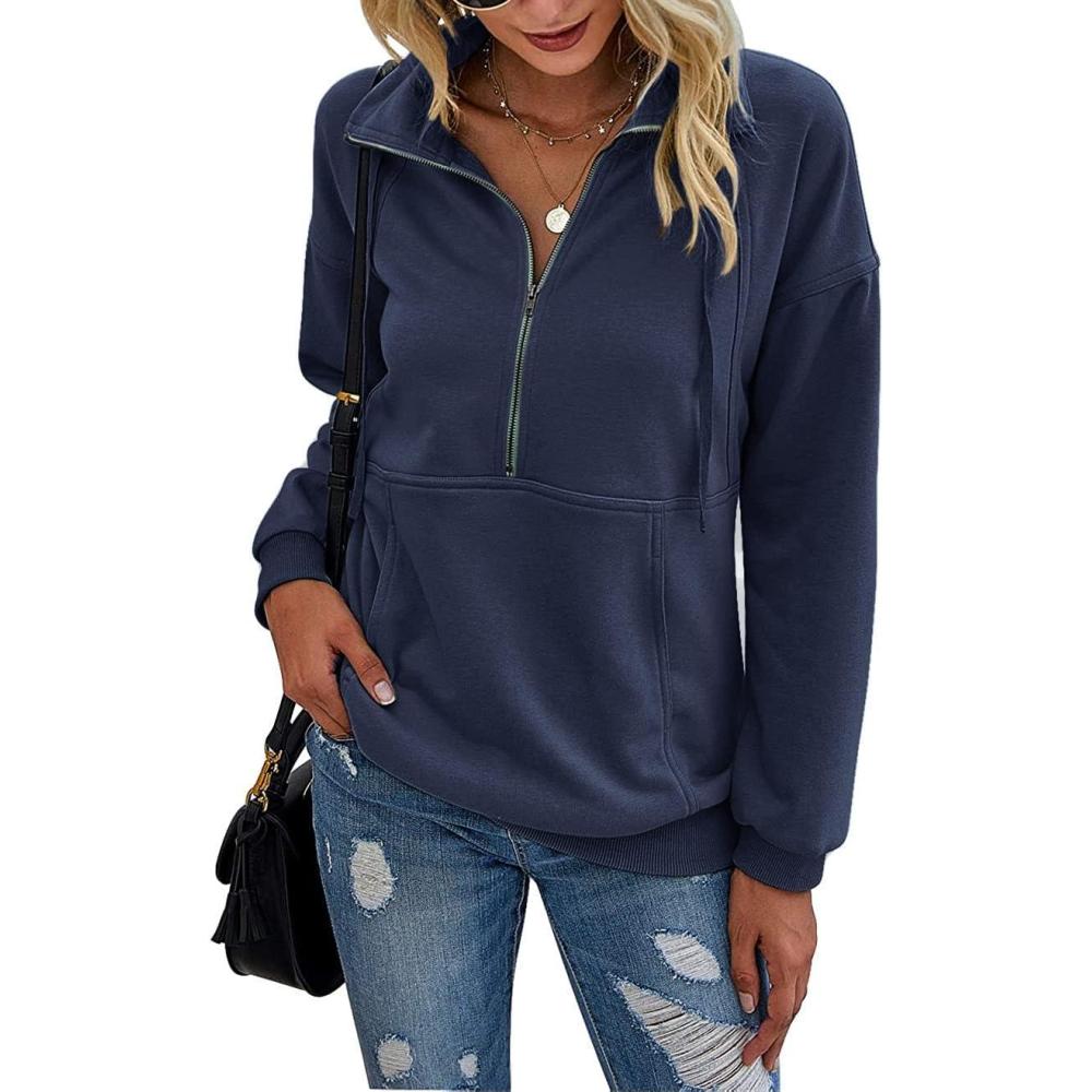 PRETTYGARDEN Women's Casual Long Sleeve Lapel Zipper Sweatshirt Drawstring Loose Pullover Tops(Navy)