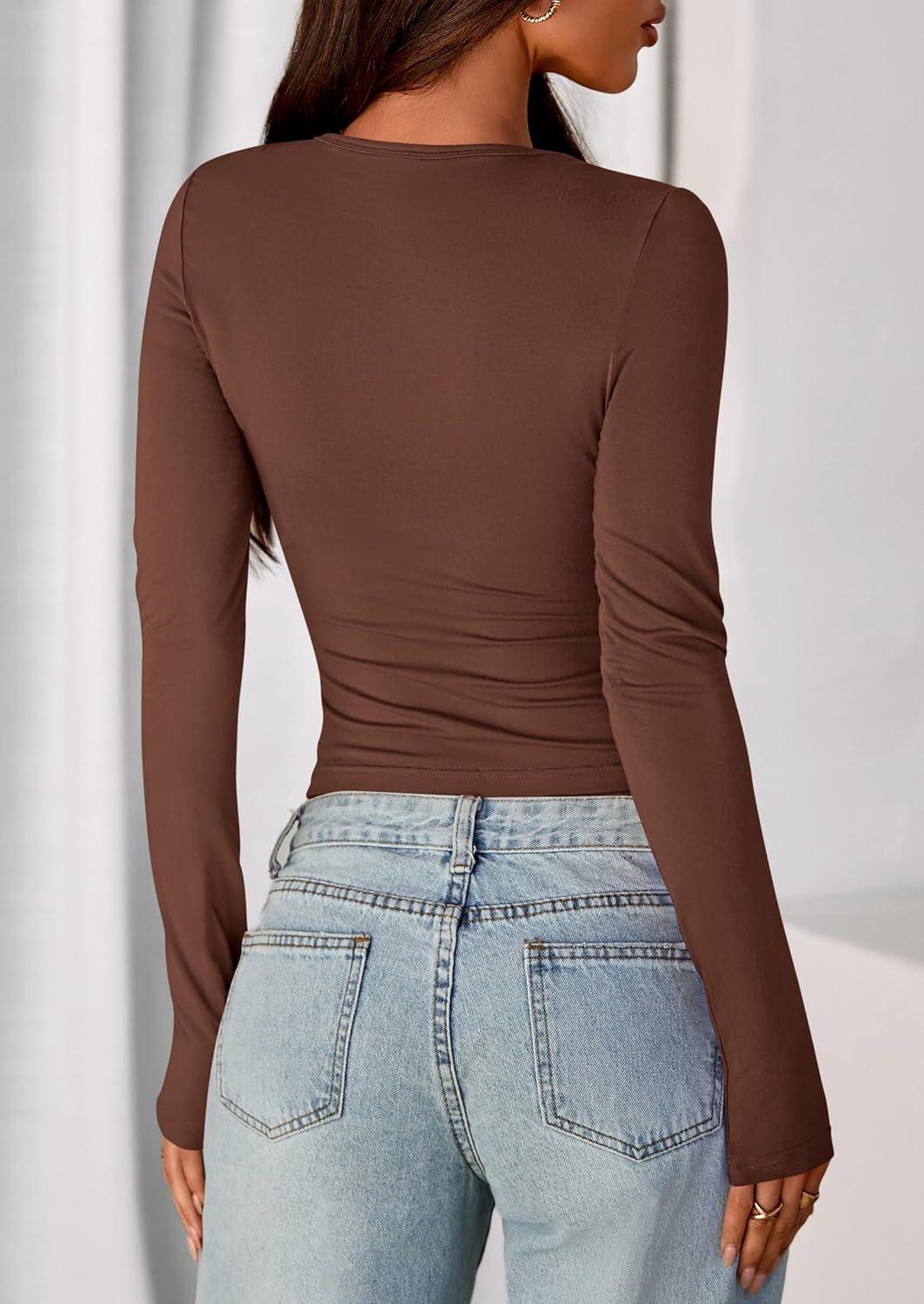 PRETTYGARDEN Womens Casual Long Sleeve Tops 2025 Fall Crew Neck Fitted Henley Shirts Basic Tee Blouse Knit Going Out Outfits(Brown)