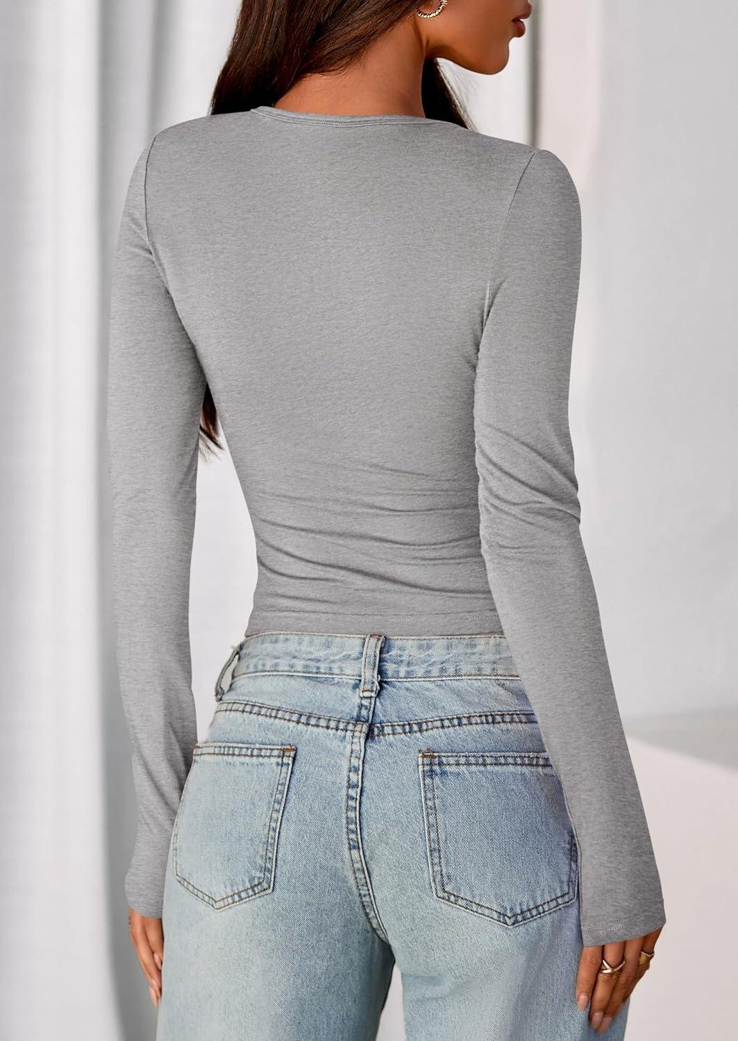 PRETTYGARDEN Womens Casual Long Sleeve Tops 2025 Fall Crew Neck Fitted Henley Shirts Basic Tee Blouse Knit Going Out Outfits(Grey)