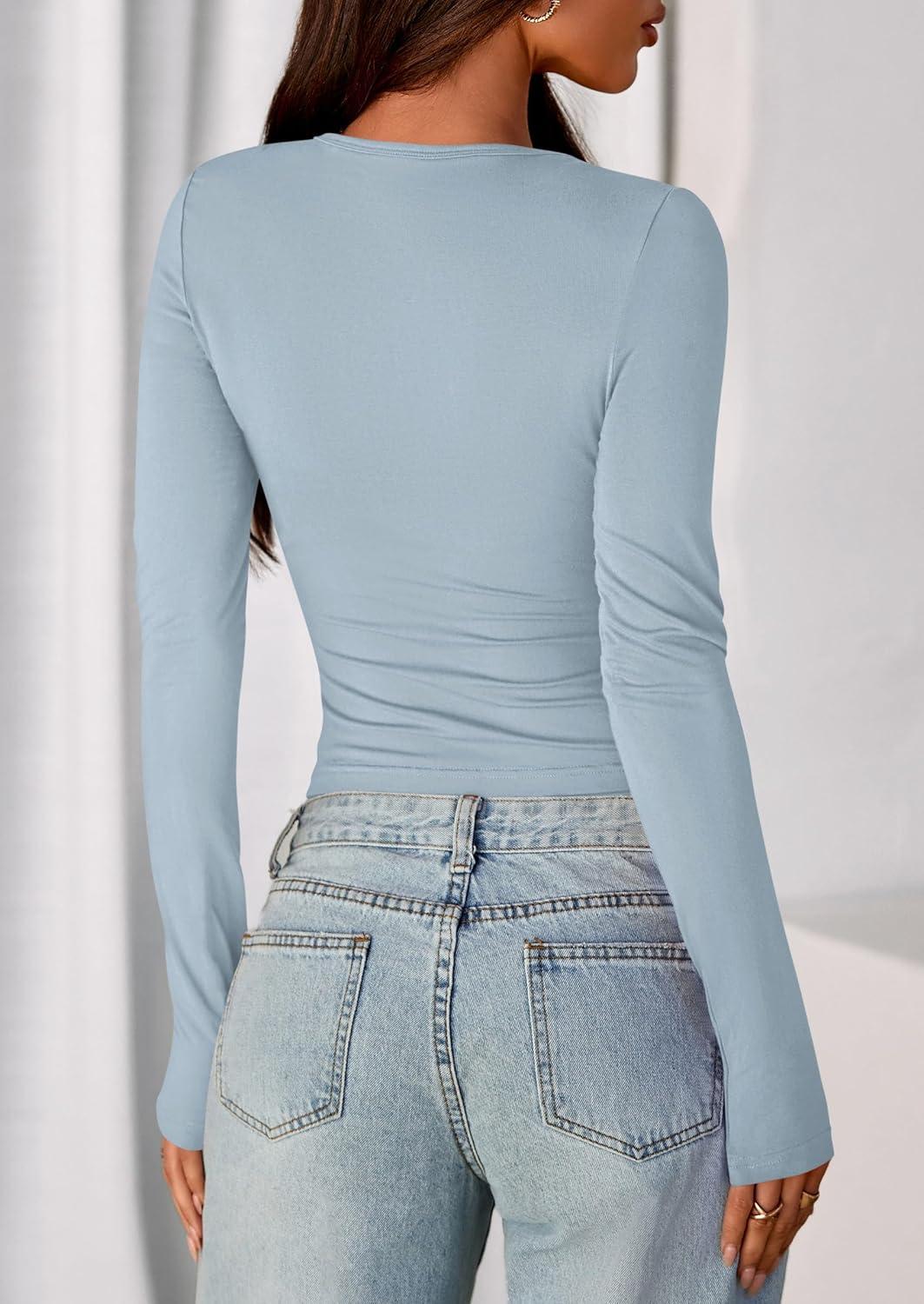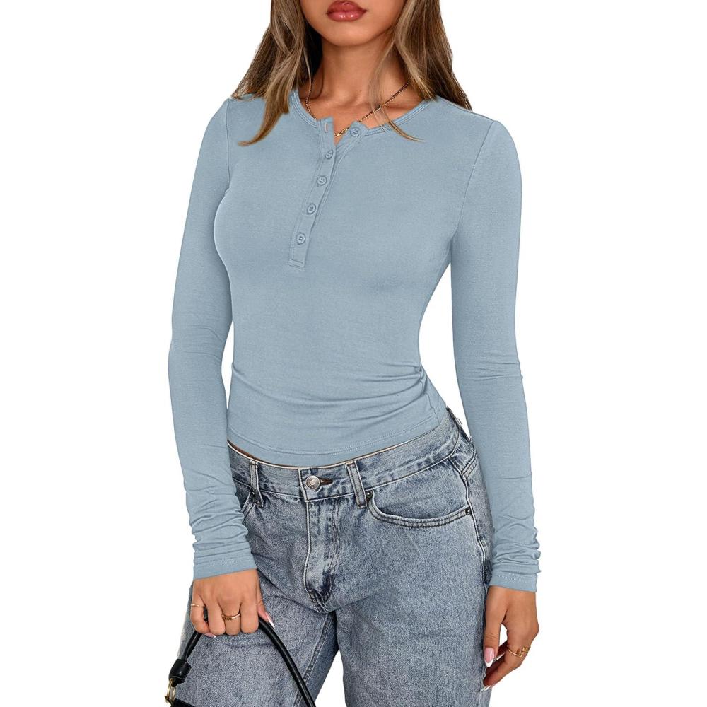 PRETTYGARDEN Womens Casual Long Sleeve Tops 2025 Fall Crew Neck Fitted Henley Shirts Basic Tee Blouse Knit Going Out Outfits(Sky Blue)