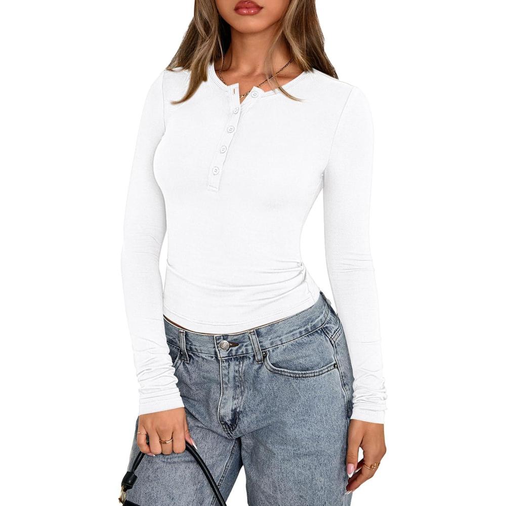 PRETTYGARDEN Womens Casual Long Sleeve Tops 2025 Fall Crew Neck Fitted Henley Shirts Basic Tee Blouse Knit Going Out Outfits(White)