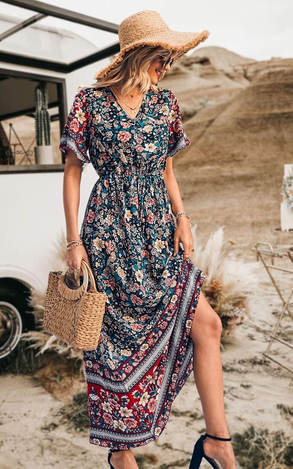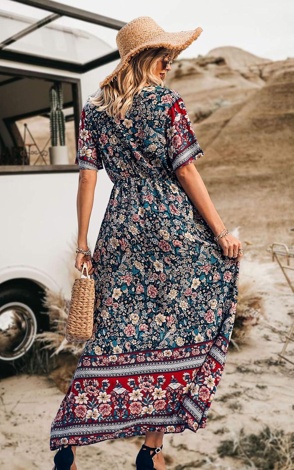 PRETTYGARDEN Women's Casual Summer Boho Floral Print Dress V Neck Short Sleeve High Waist Long Maxi Beach Dresses(Black)