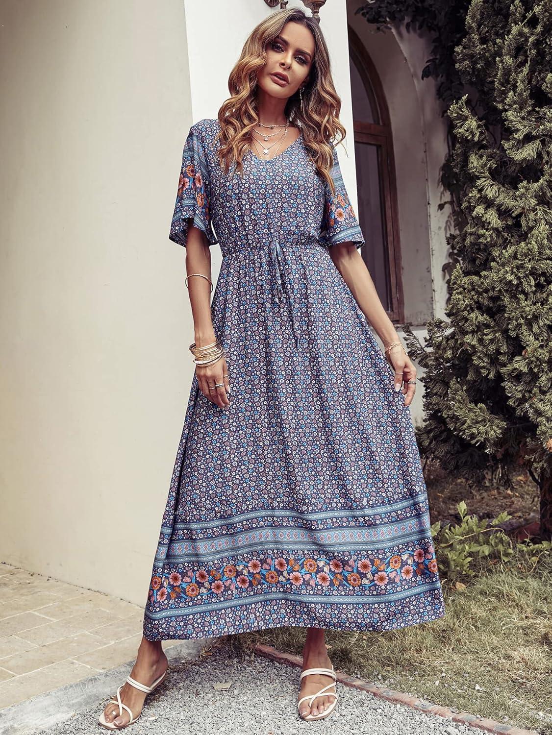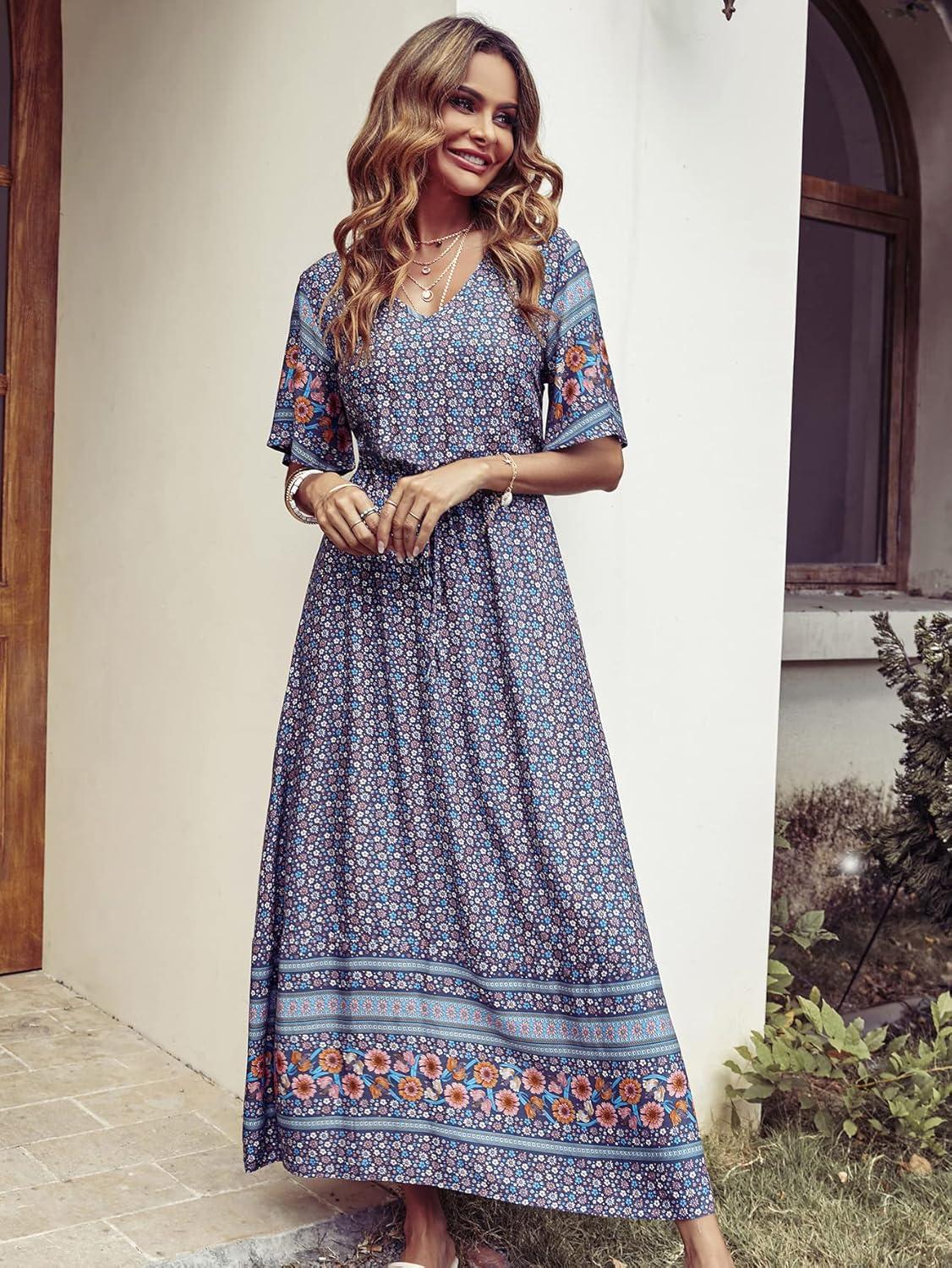 PRETTYGARDEN Women's Casual Summer Boho Floral Print Dress V Neck Short Sleeve High Waist Long Maxi Beach Dresses(Blue Grey Floral)