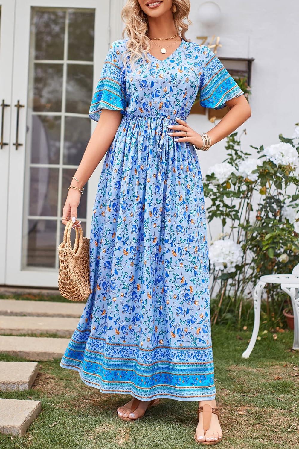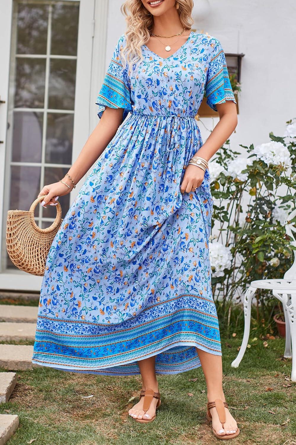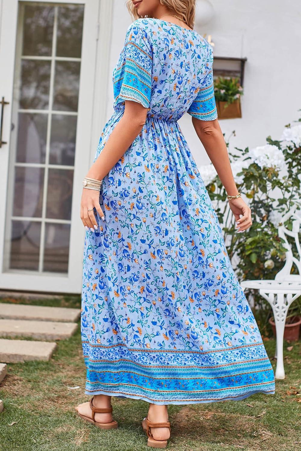PRETTYGARDEN Women’s Casual Summer Boho Floral Print Dress V Neck Short Sleeve High Waist Long Maxi Beach Dresses(Blue Floral)