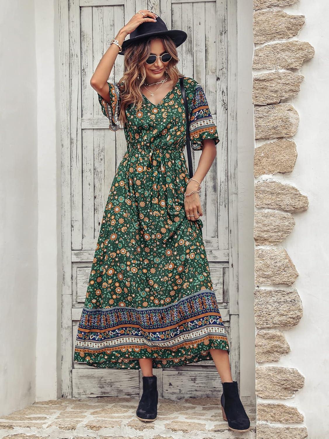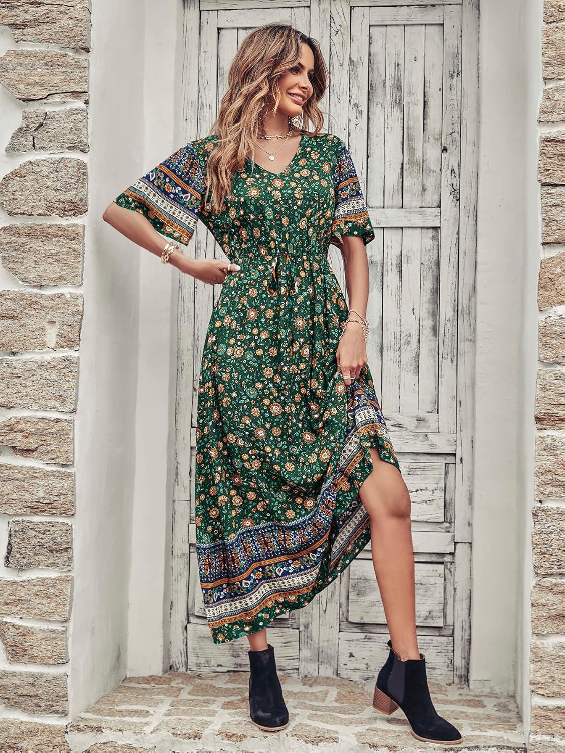 PRETTYGARDEN Women's Casual Summer Boho Floral Print Dress V Neck Short Sleeve High Waist Long Maxi Beach Dresses(Dark Green Floral)