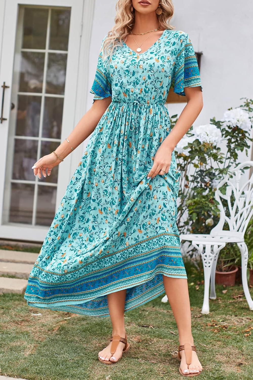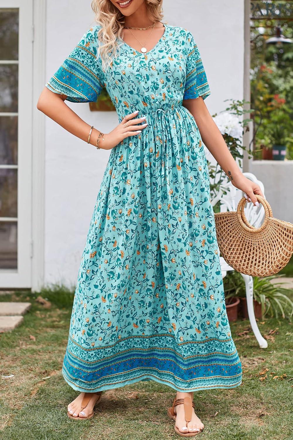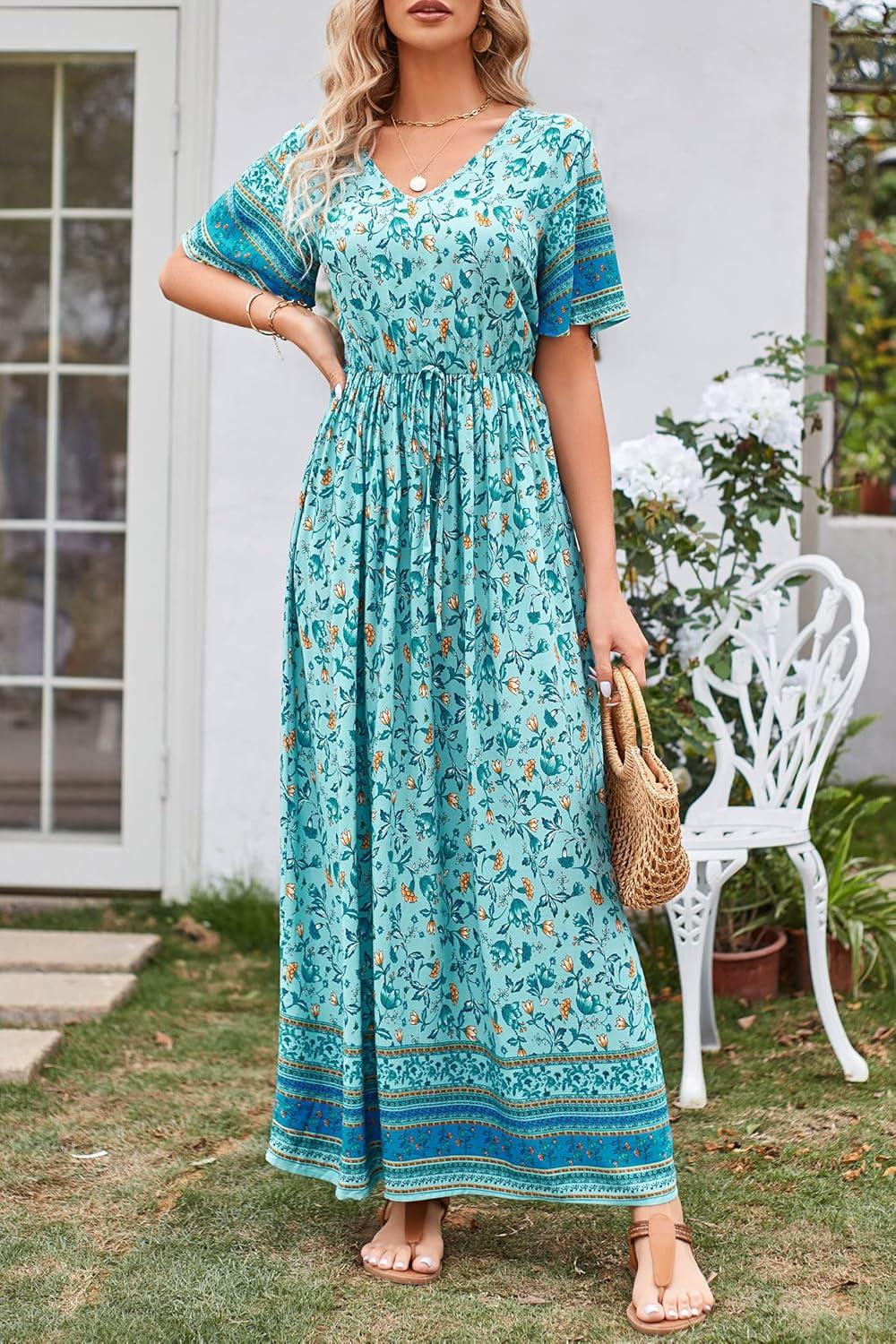 PRETTYGARDEN Women’s Casual Summer Boho Floral Print Dress V Neck Short Sleeve High Waist Long Maxi Beach Dresses(Blue Yellow Floral)