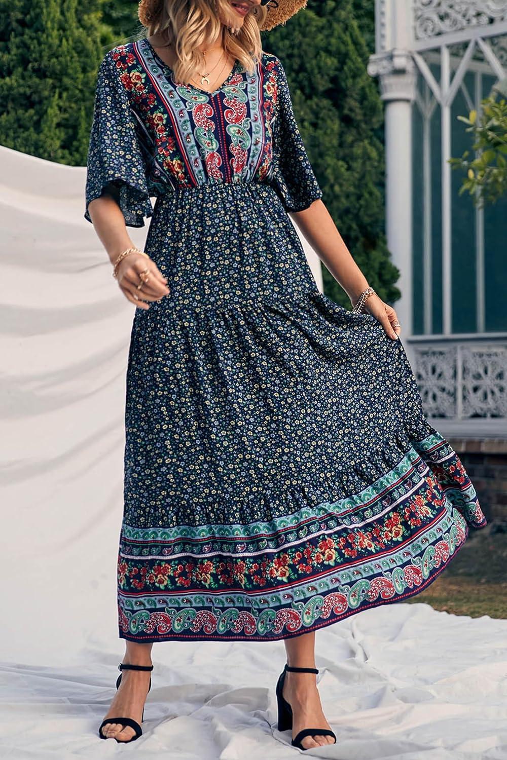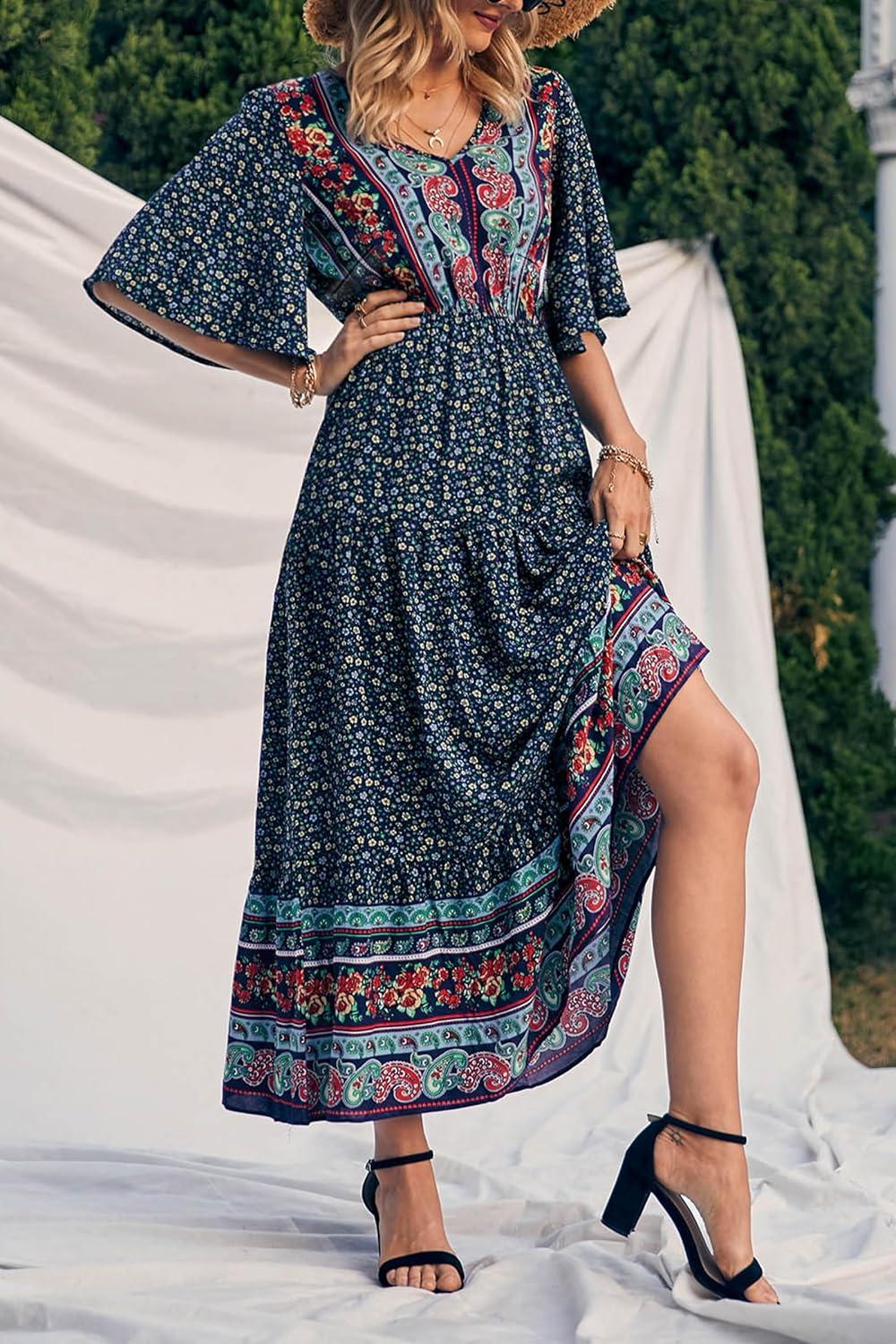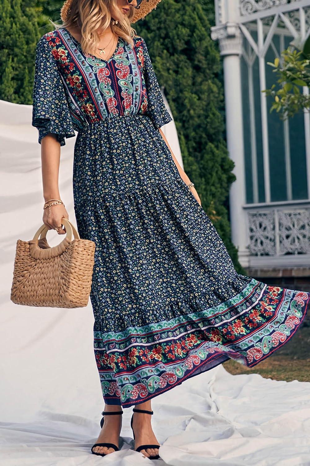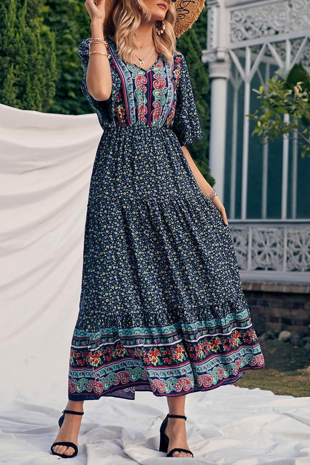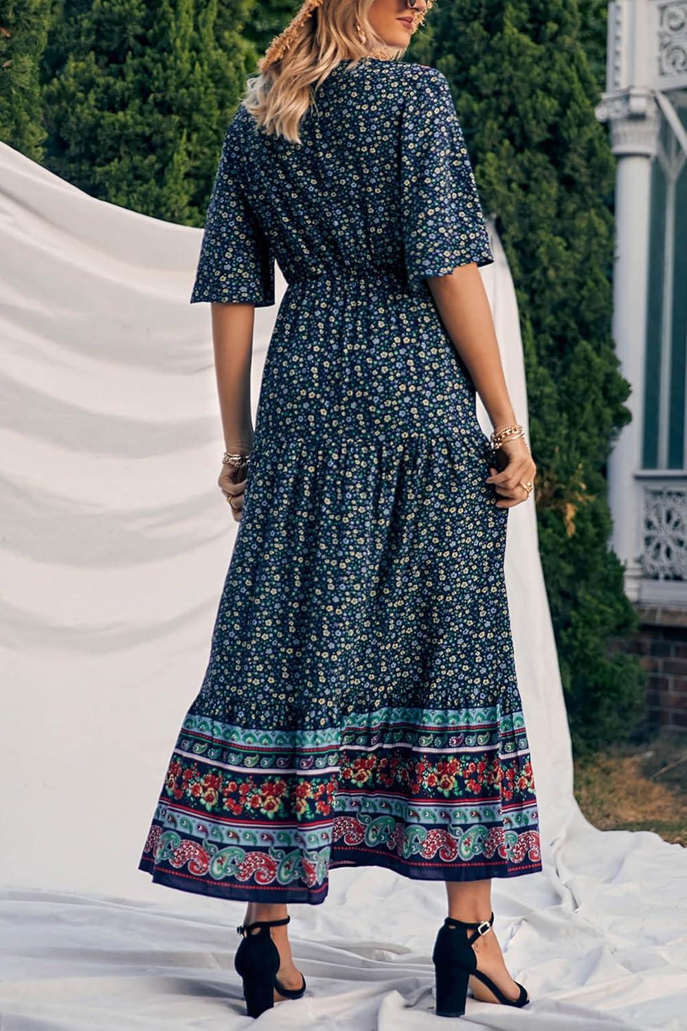 PRETTYGARDEN Women's Casual Summer Boho Floral Print Dress V Neck Short Sleeve High Waist Long Maxi Beach Dresses(Navy Floral)