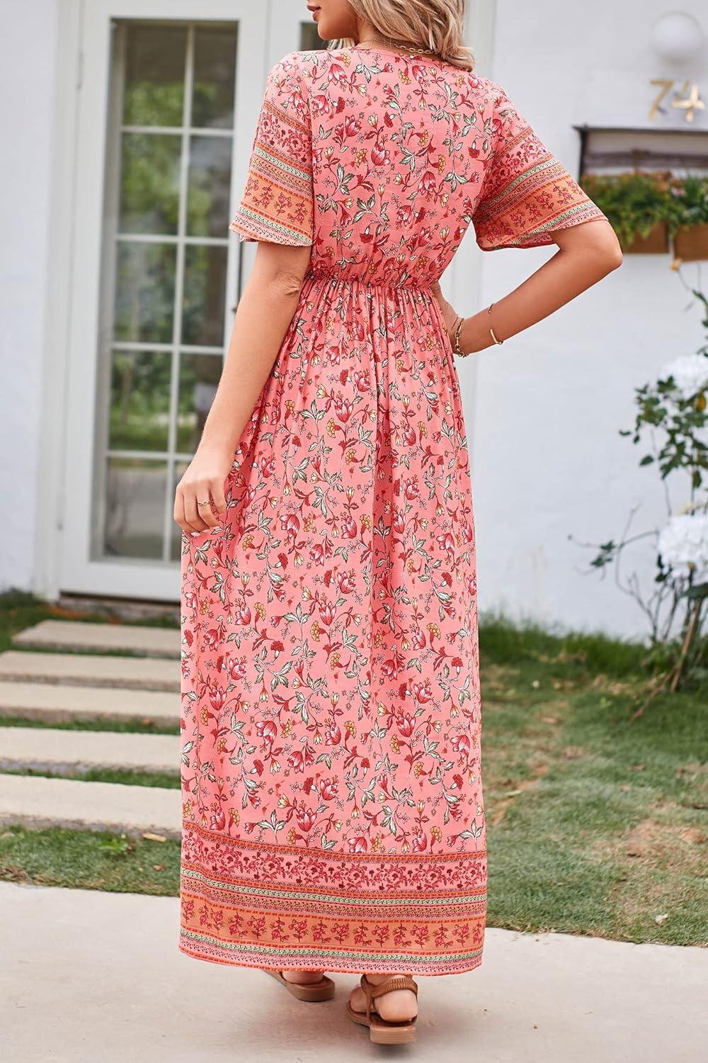 PRETTYGARDEN Women's Casual Summer Boho Floral Print Dress V Neck Short Sleeve High Waist Long Maxi Beach Dresses(Orange Red Floral)