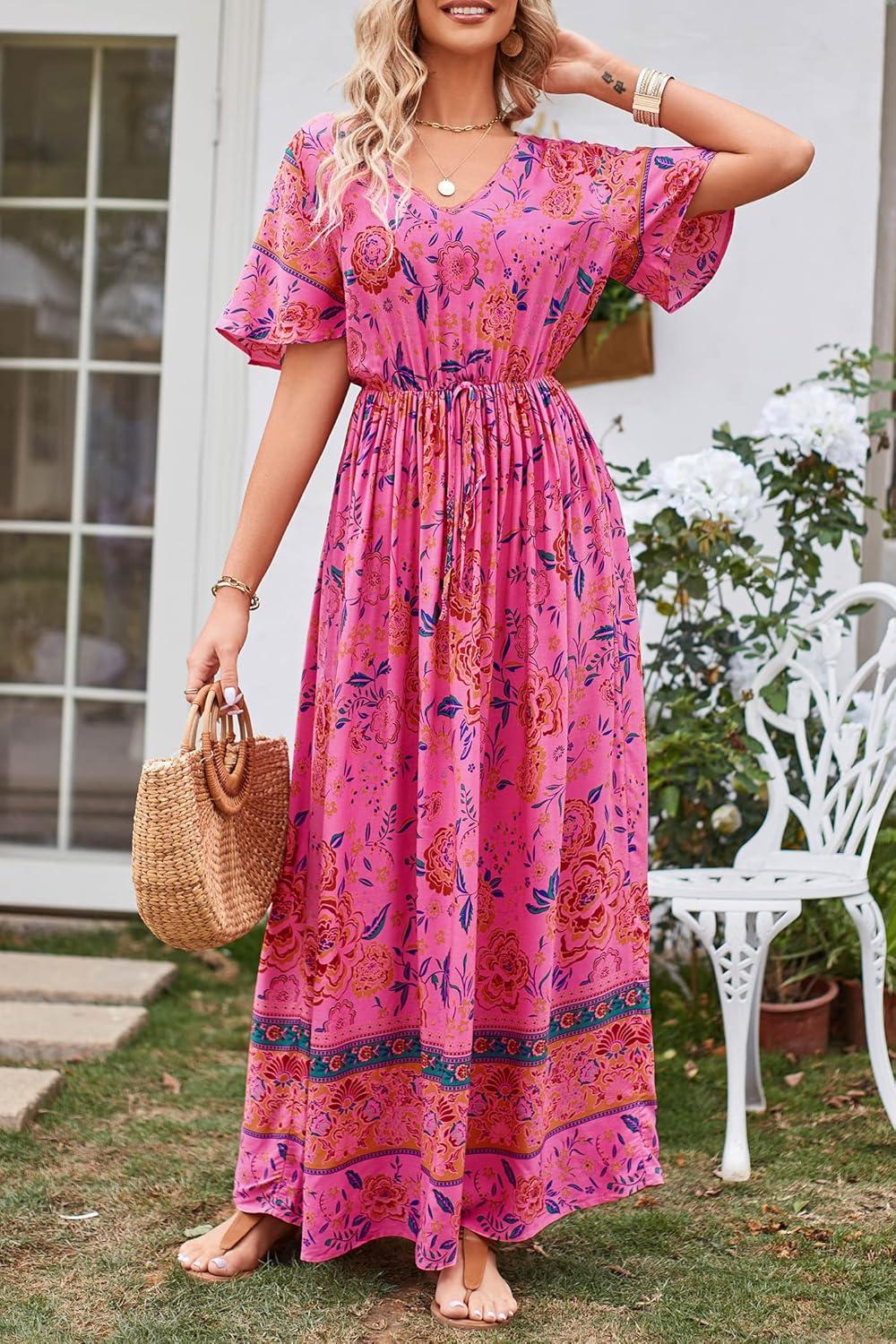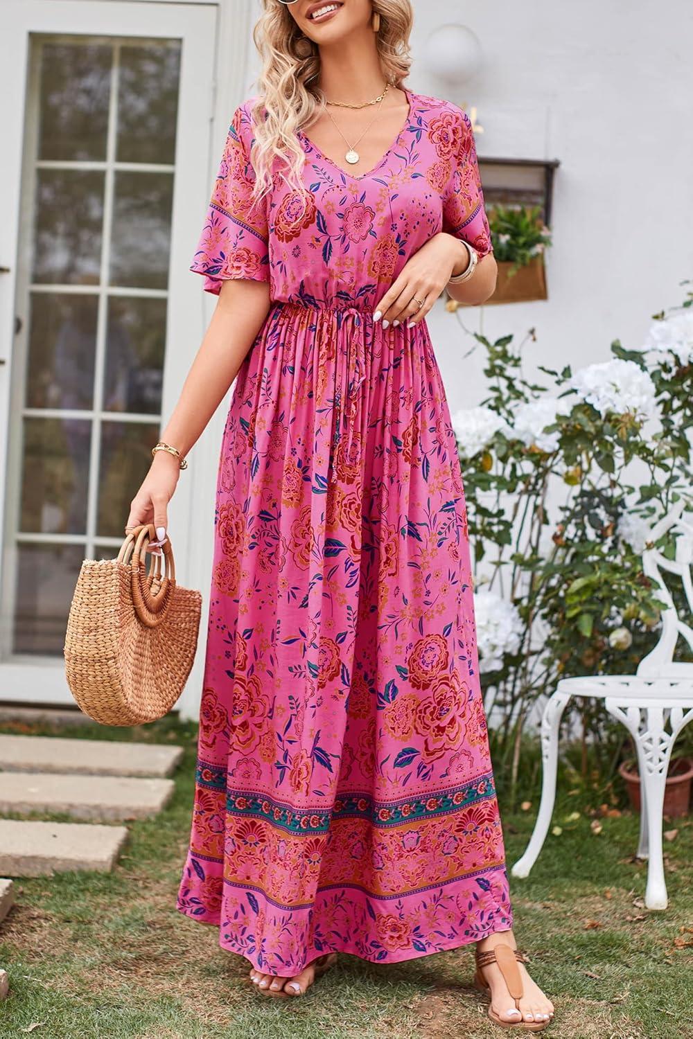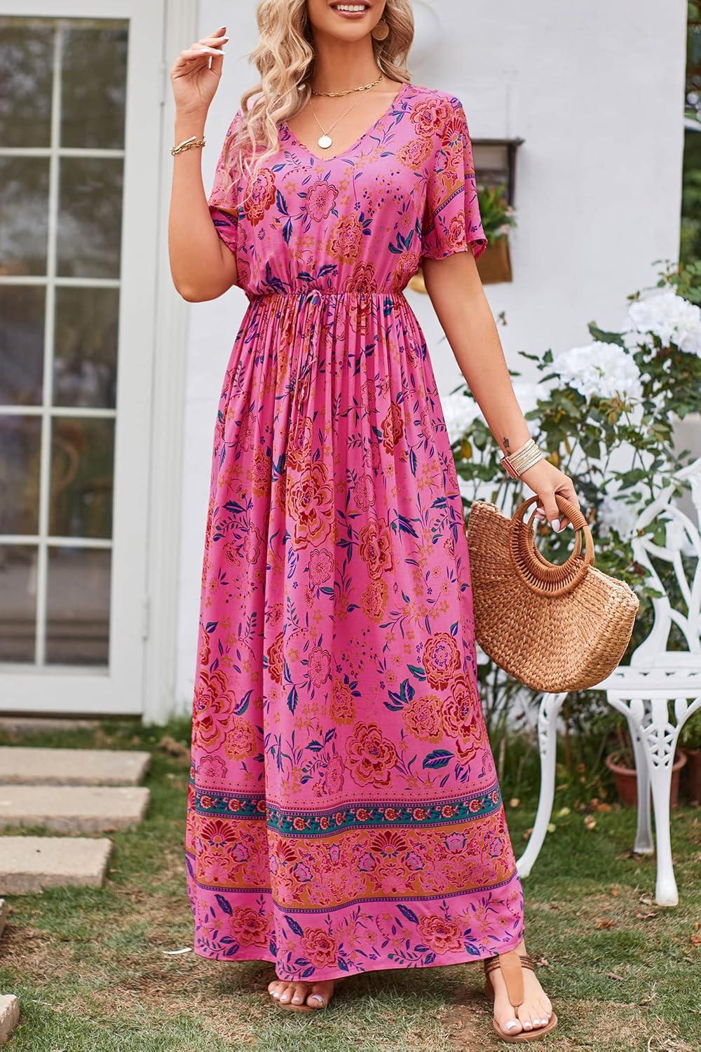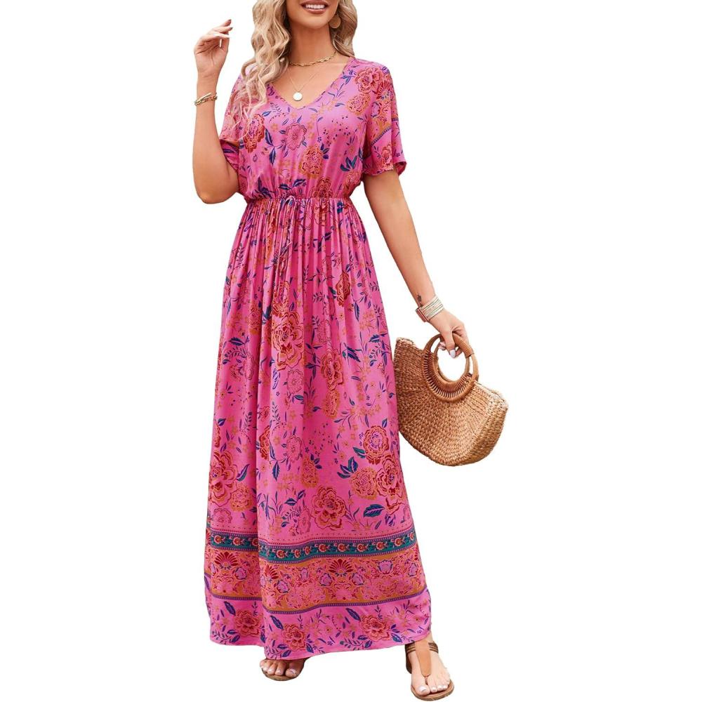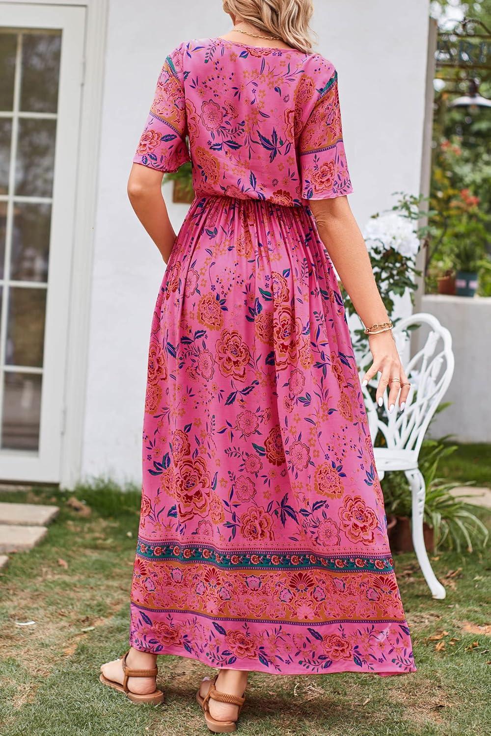 PRETTYGARDEN Women's Casual Summer Boho Floral Print Dress V Neck Short Sleeve High Waist Long Maxi Beach Dresses(Rose Red Floral)
