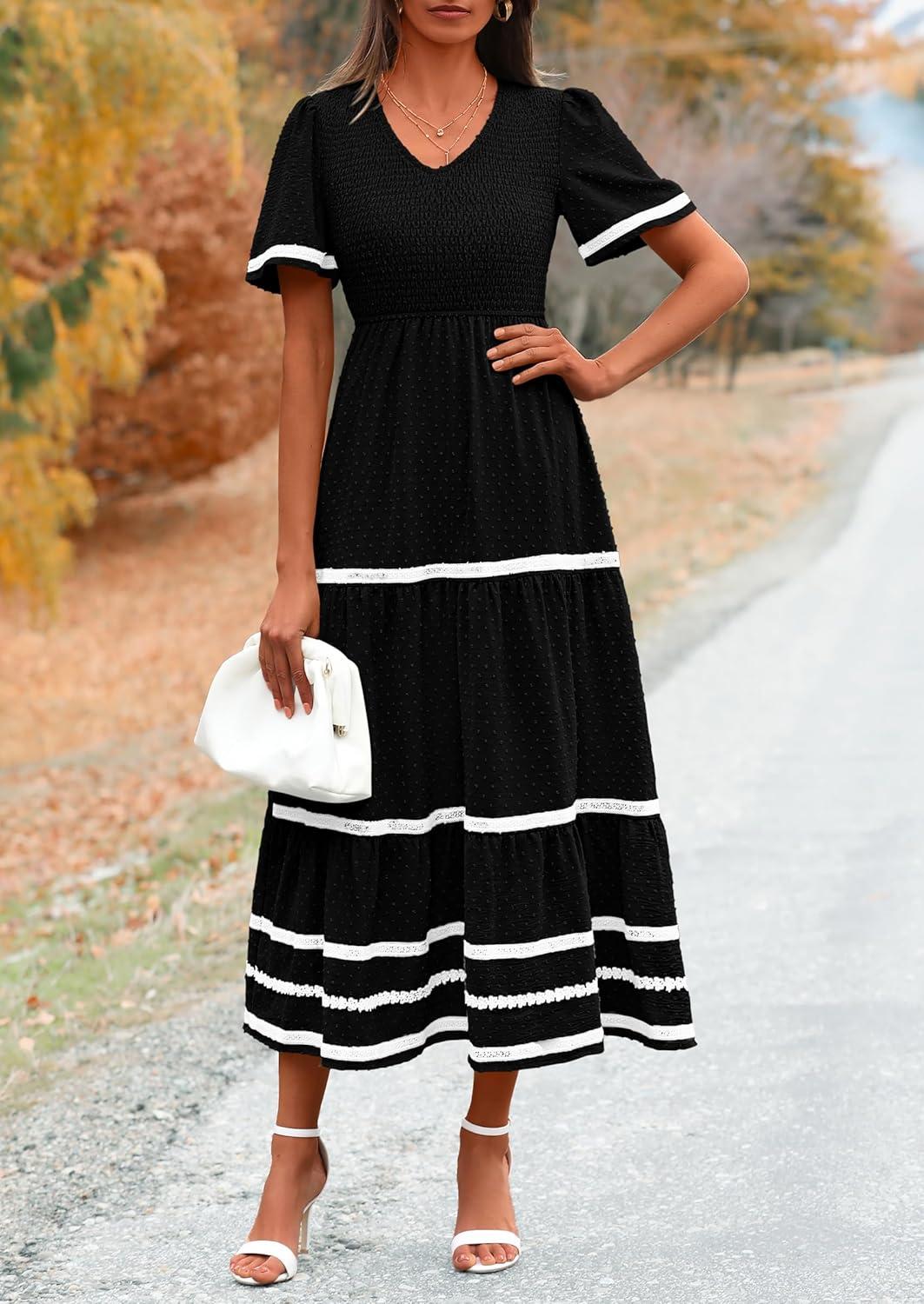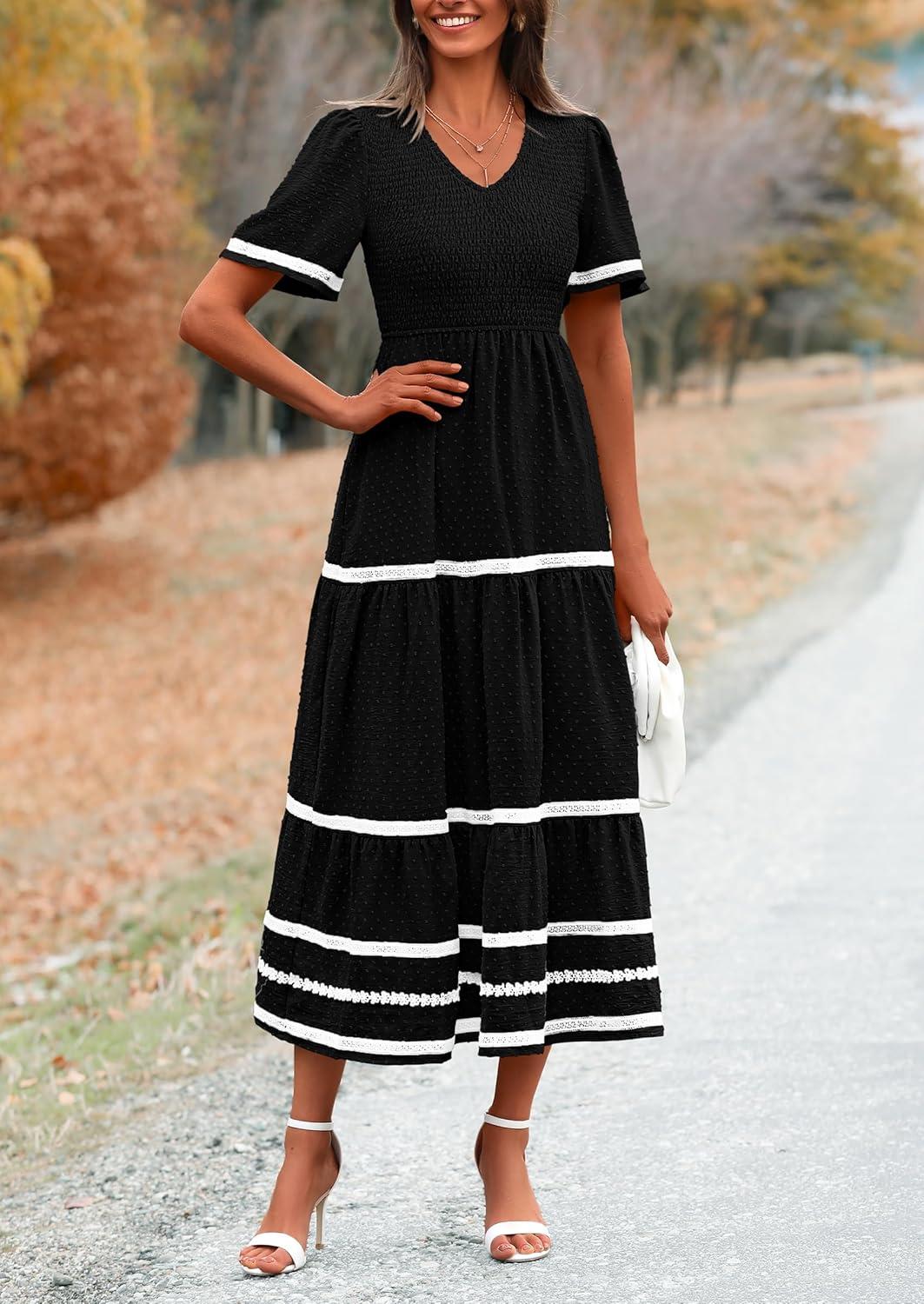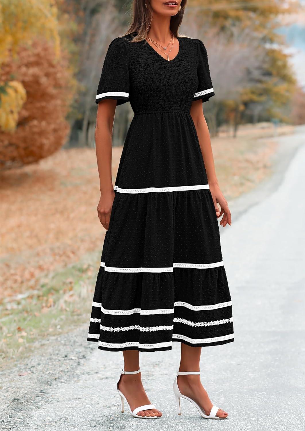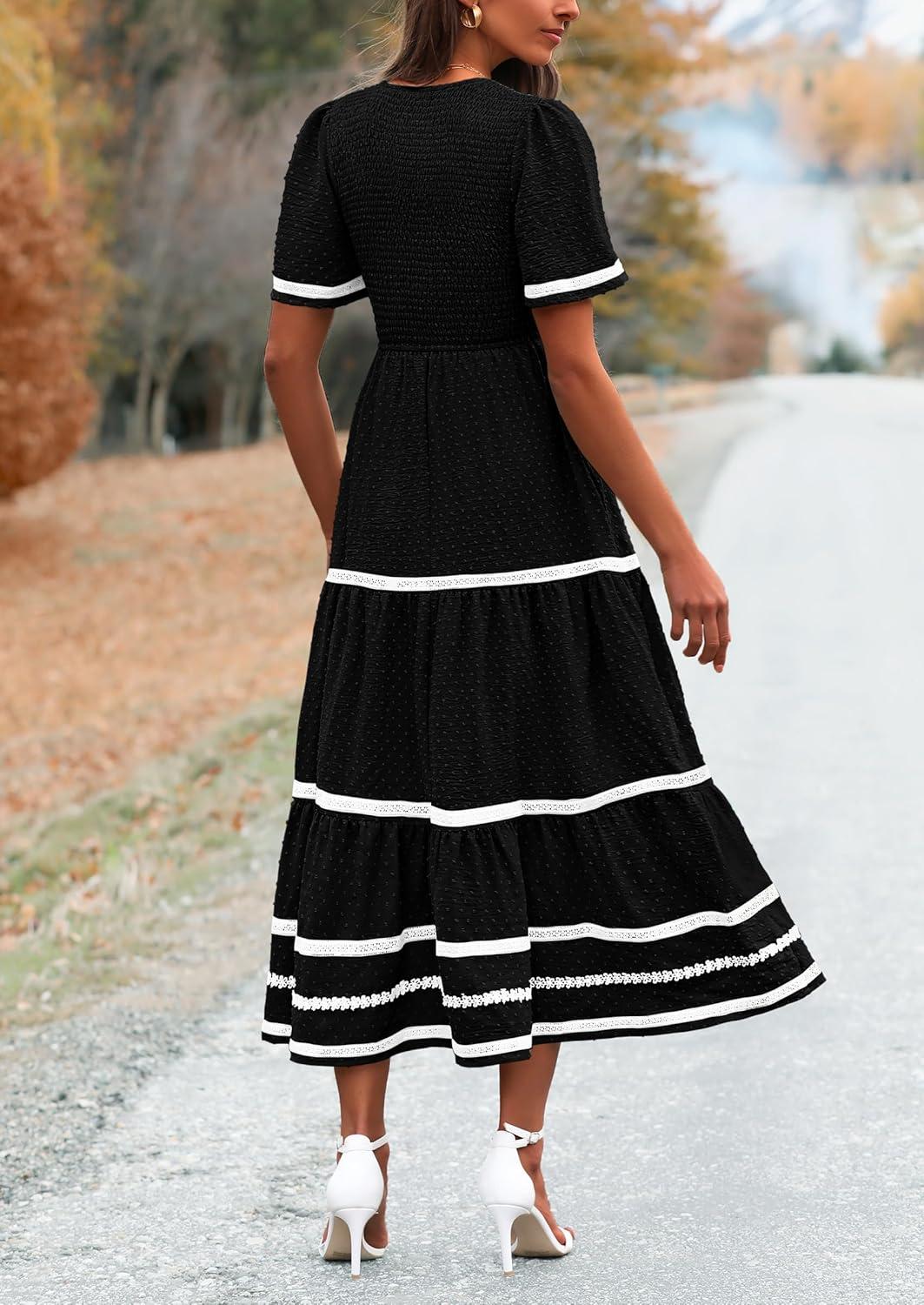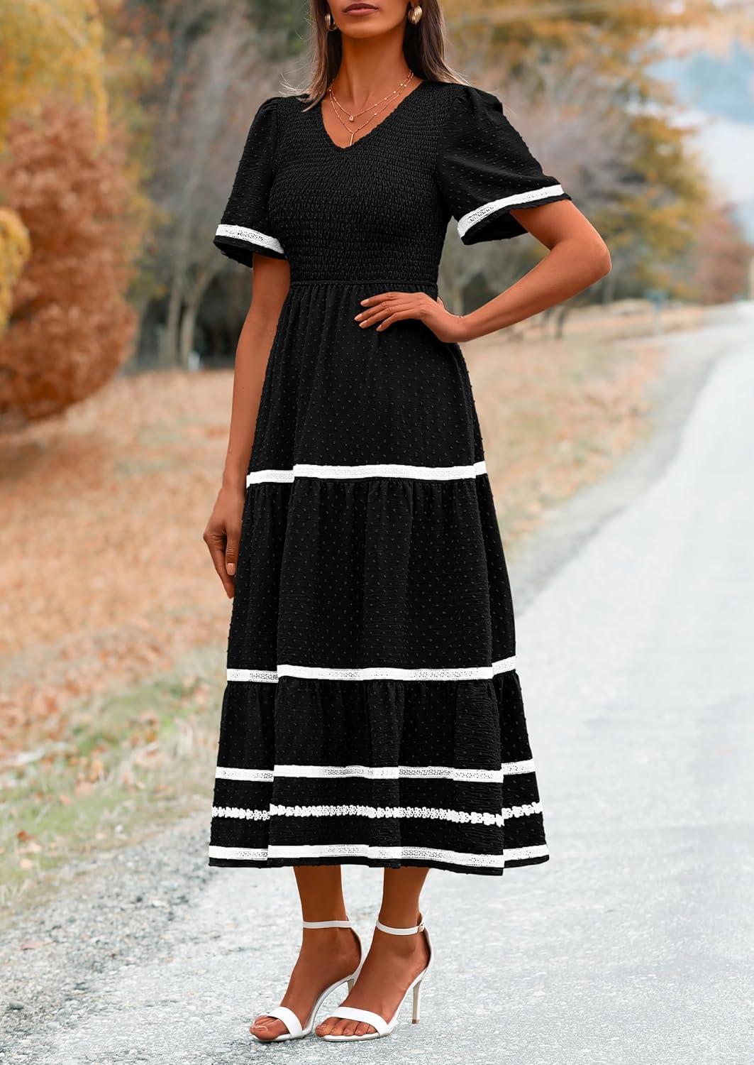 PRETTYGARDEN Women’s Casual Summer Maxi Dress Short Sleeve Swiss Dot V Neck Smocked Long Flowy Beach Dresses(Black)