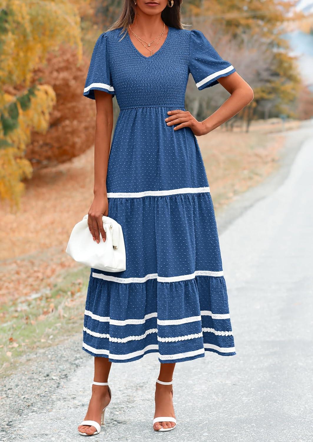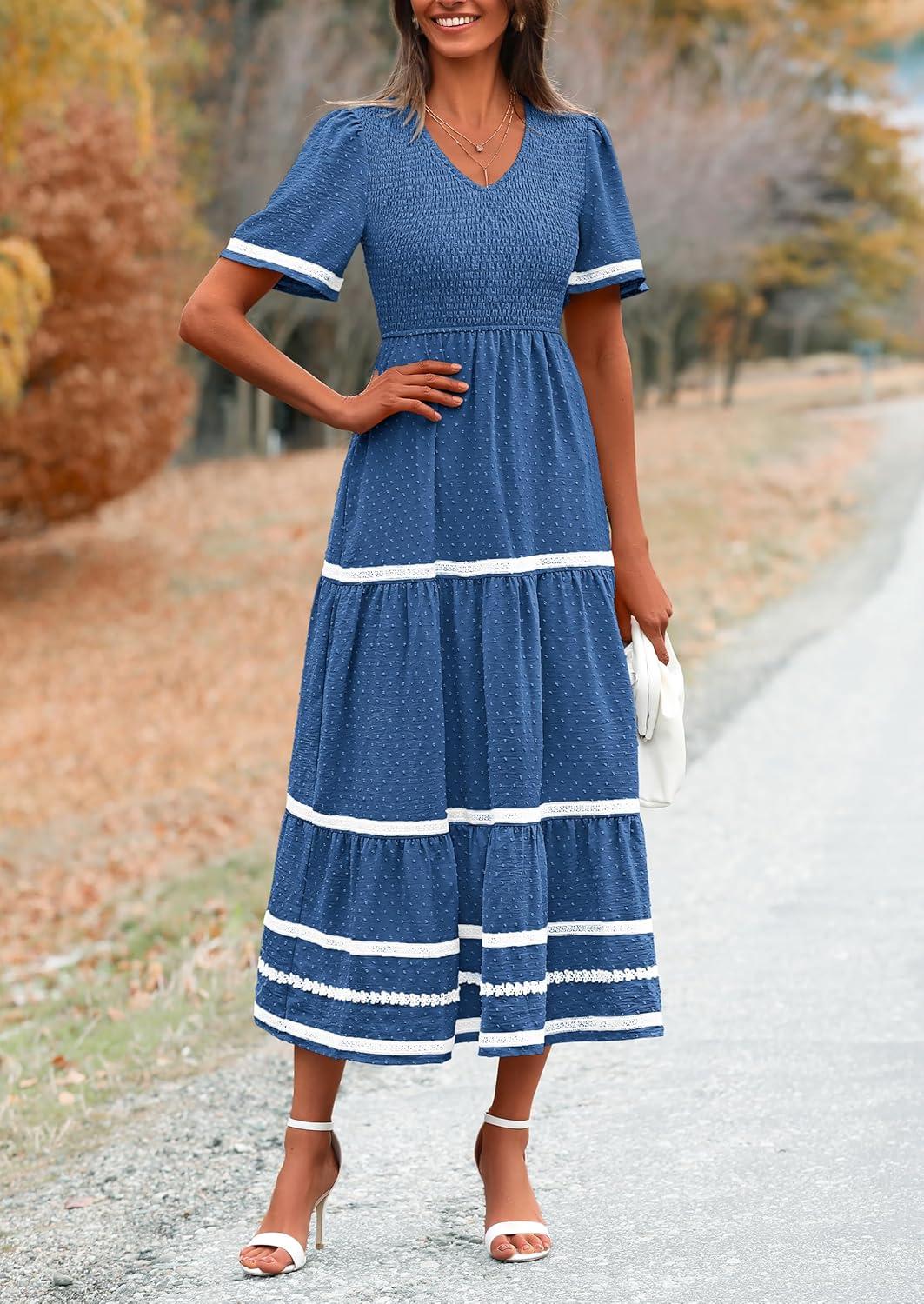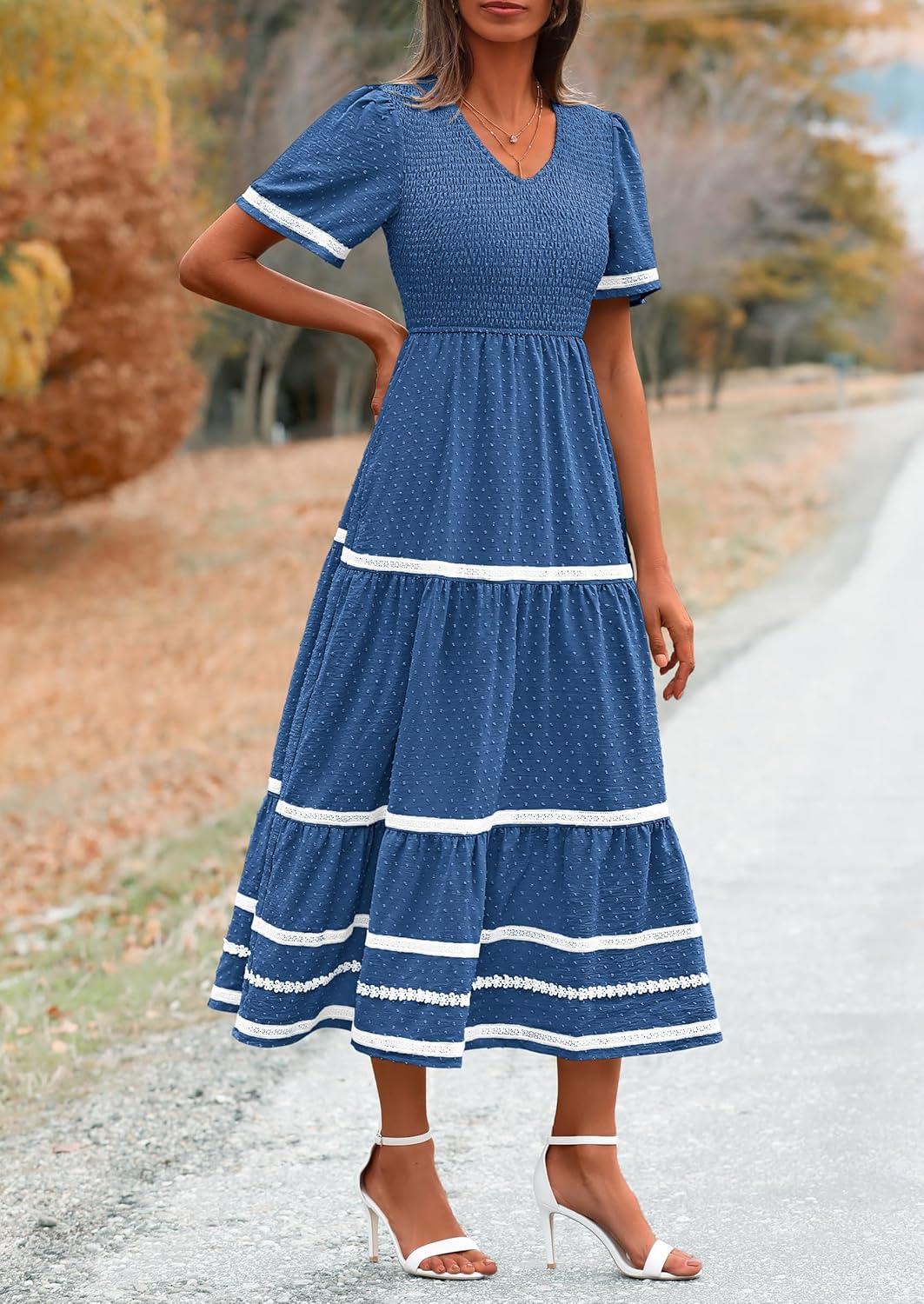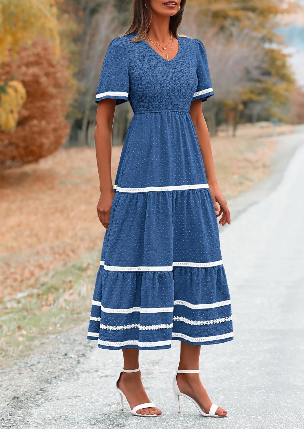 PRETTYGARDEN Women’s Casual Summer Maxi Dress Short Sleeve Swiss Dot V Neck Smocked Long Flowy Beach Dresses(Blue)