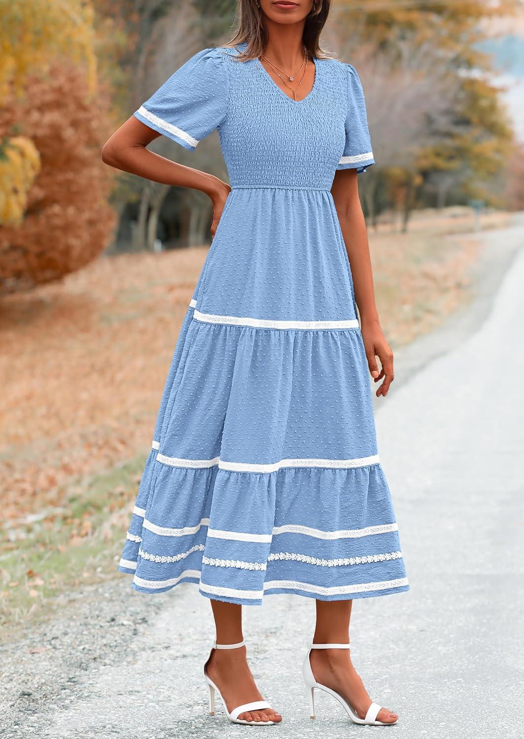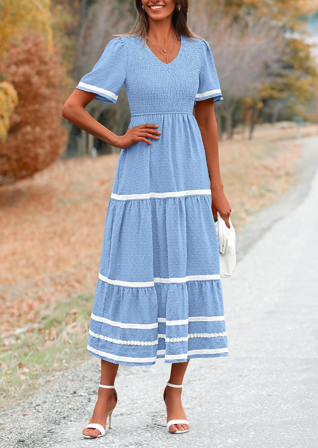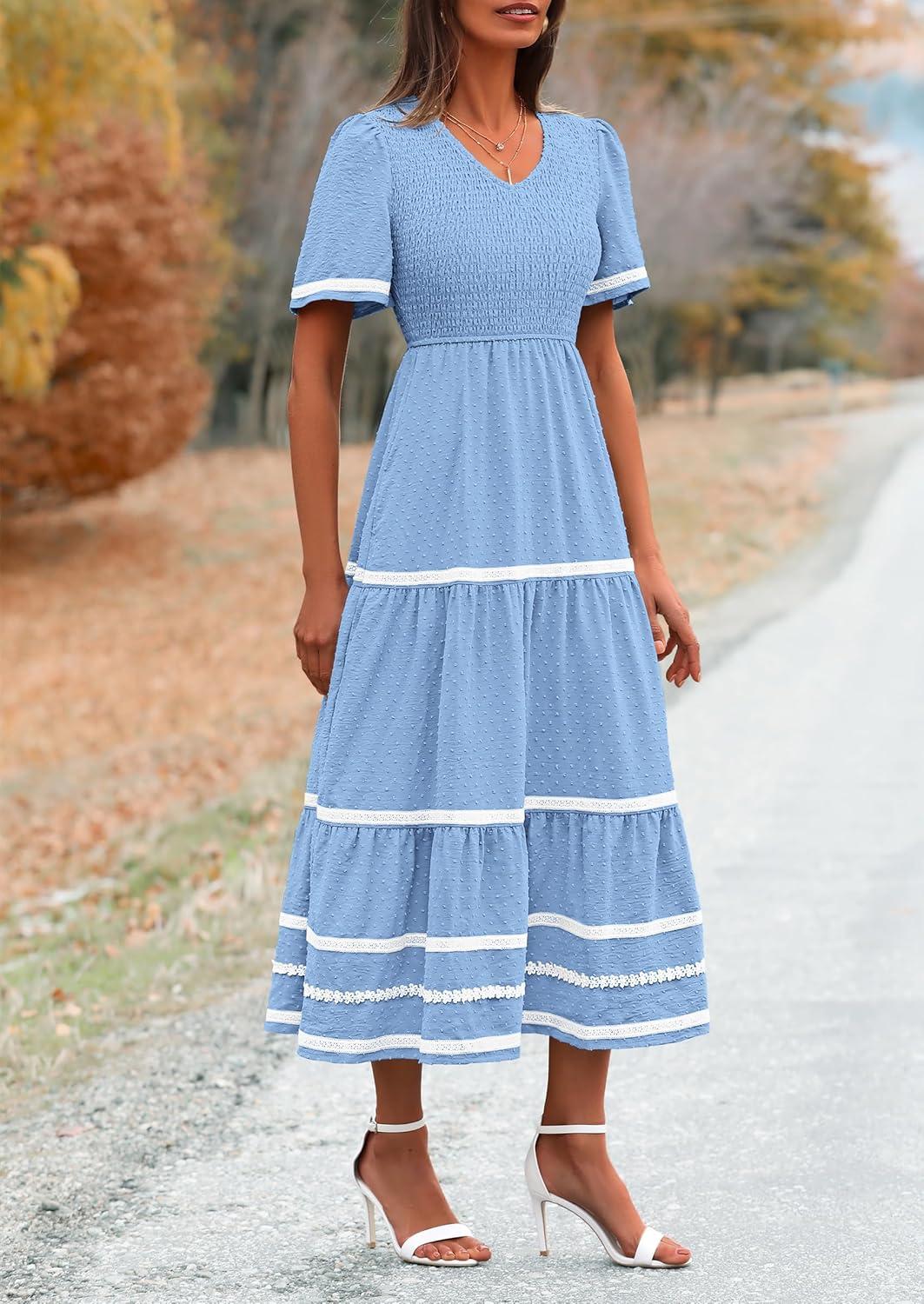 PRETTYGARDEN Women's Casual Summer Maxi Dress Short Sleeve Swiss Dot V Neck Smocked Long Flowy Beach Dresses(Light Blue)