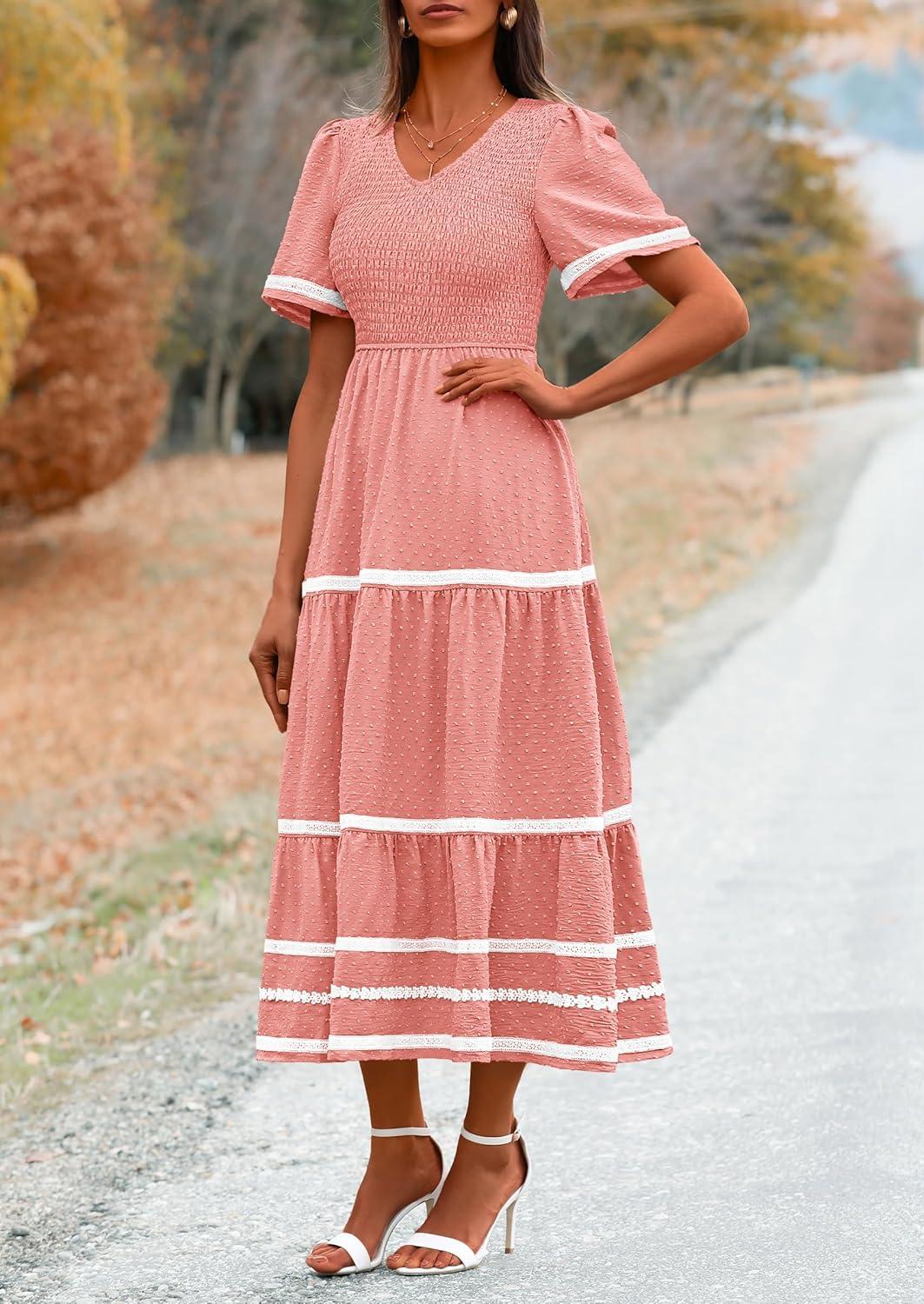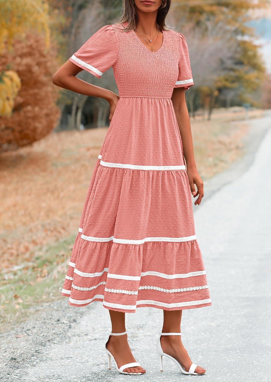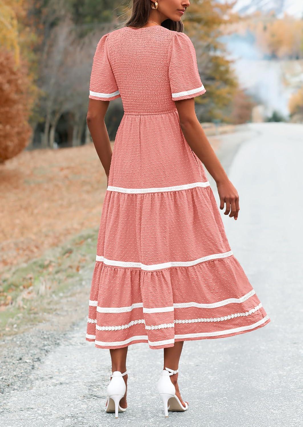 PRETTYGARDEN Women's Casual Summer Maxi Dress Short Sleeve Swiss Dot V Neck Smocked Long Flowy Beach Dresses(Pink)