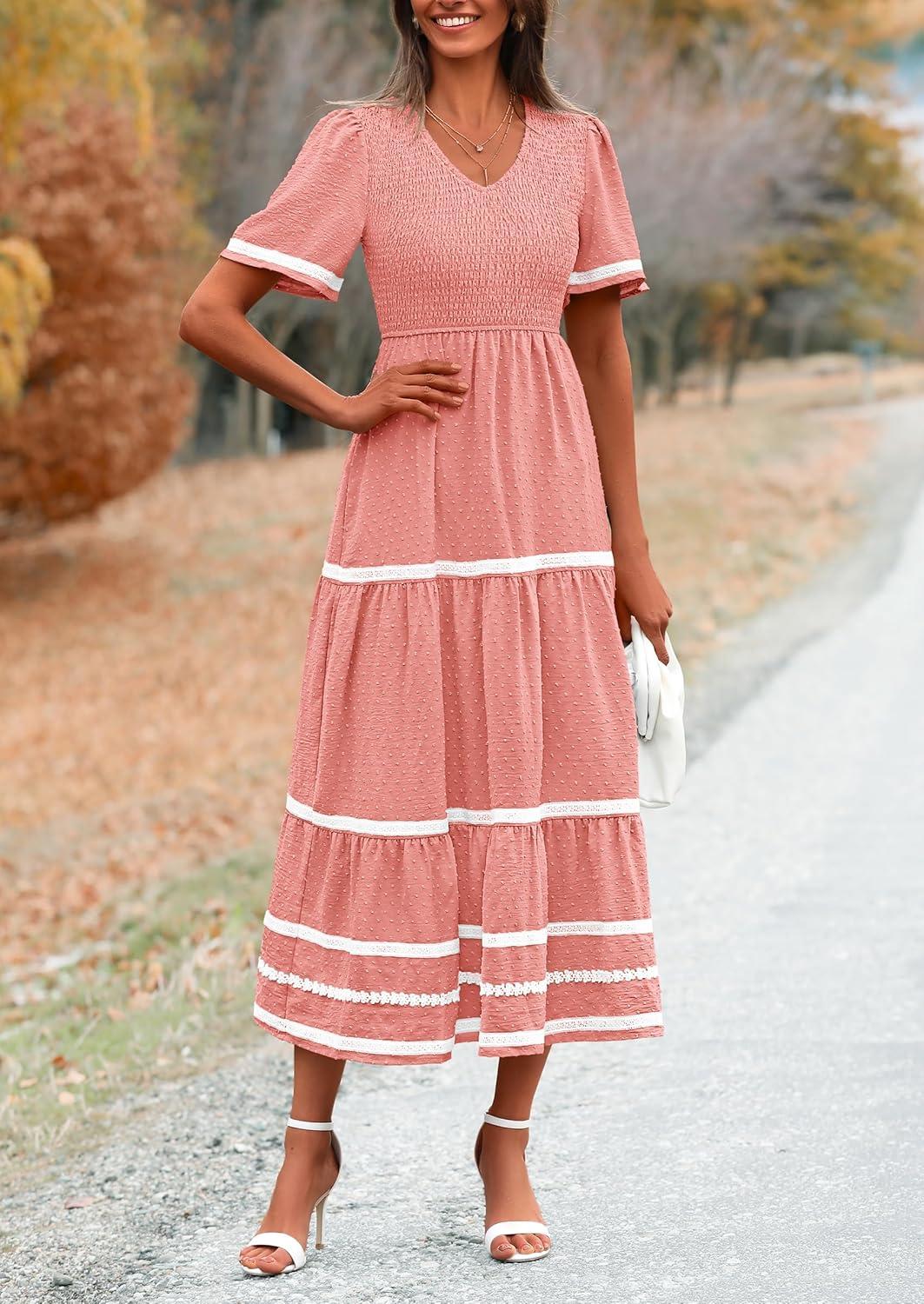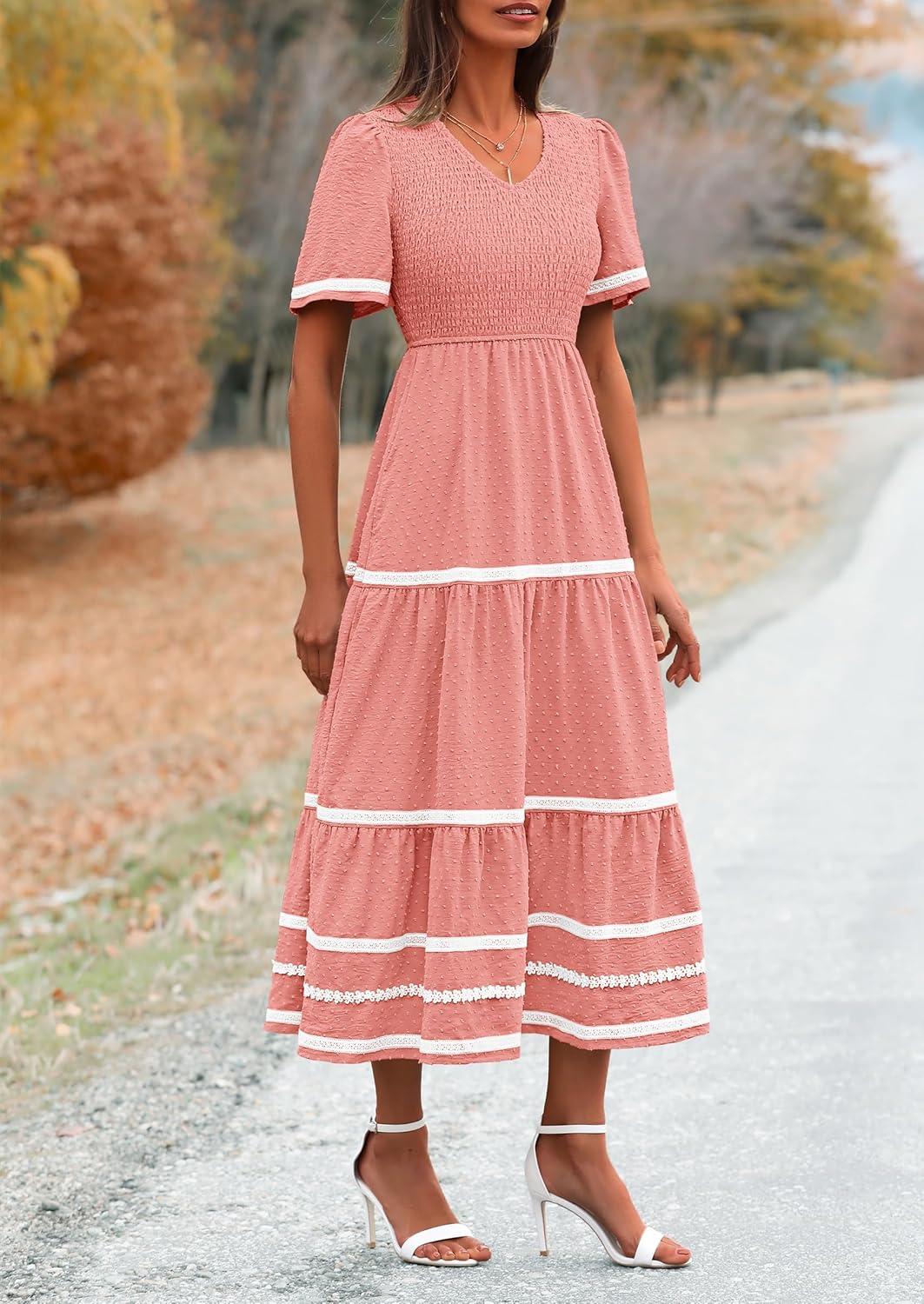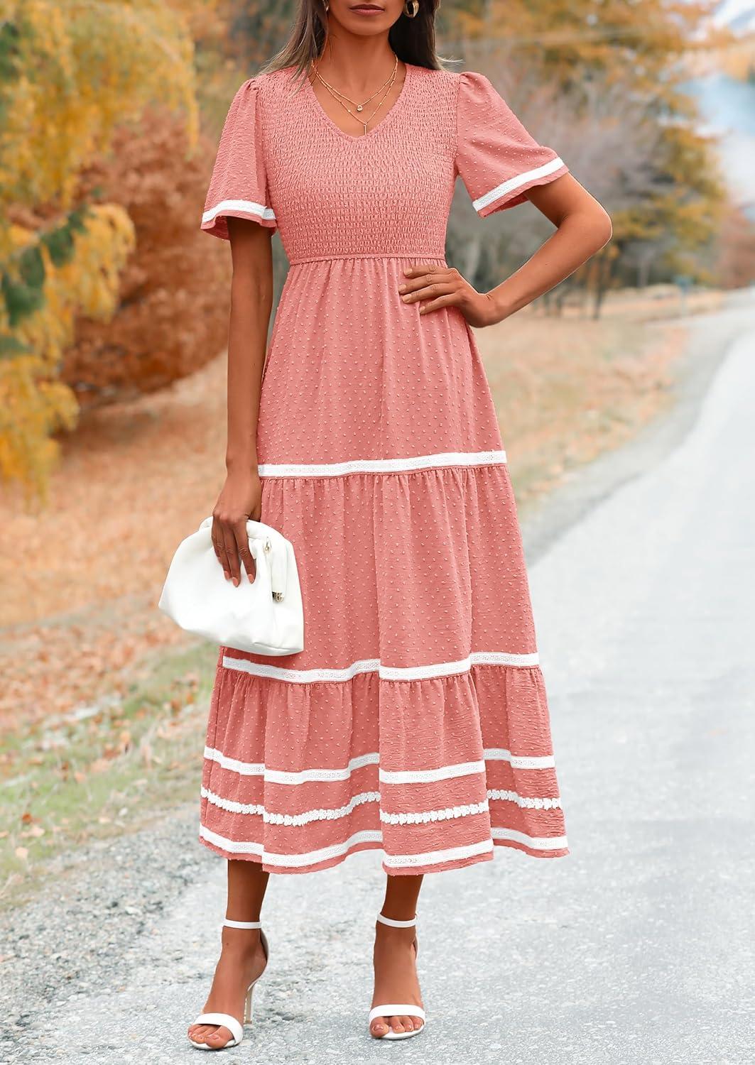 PRETTYGARDEN Women's Casual Summer Maxi Dress Short Sleeve Swiss Dot V Neck Smocked Long Flowy Beach Dresses(Pink)