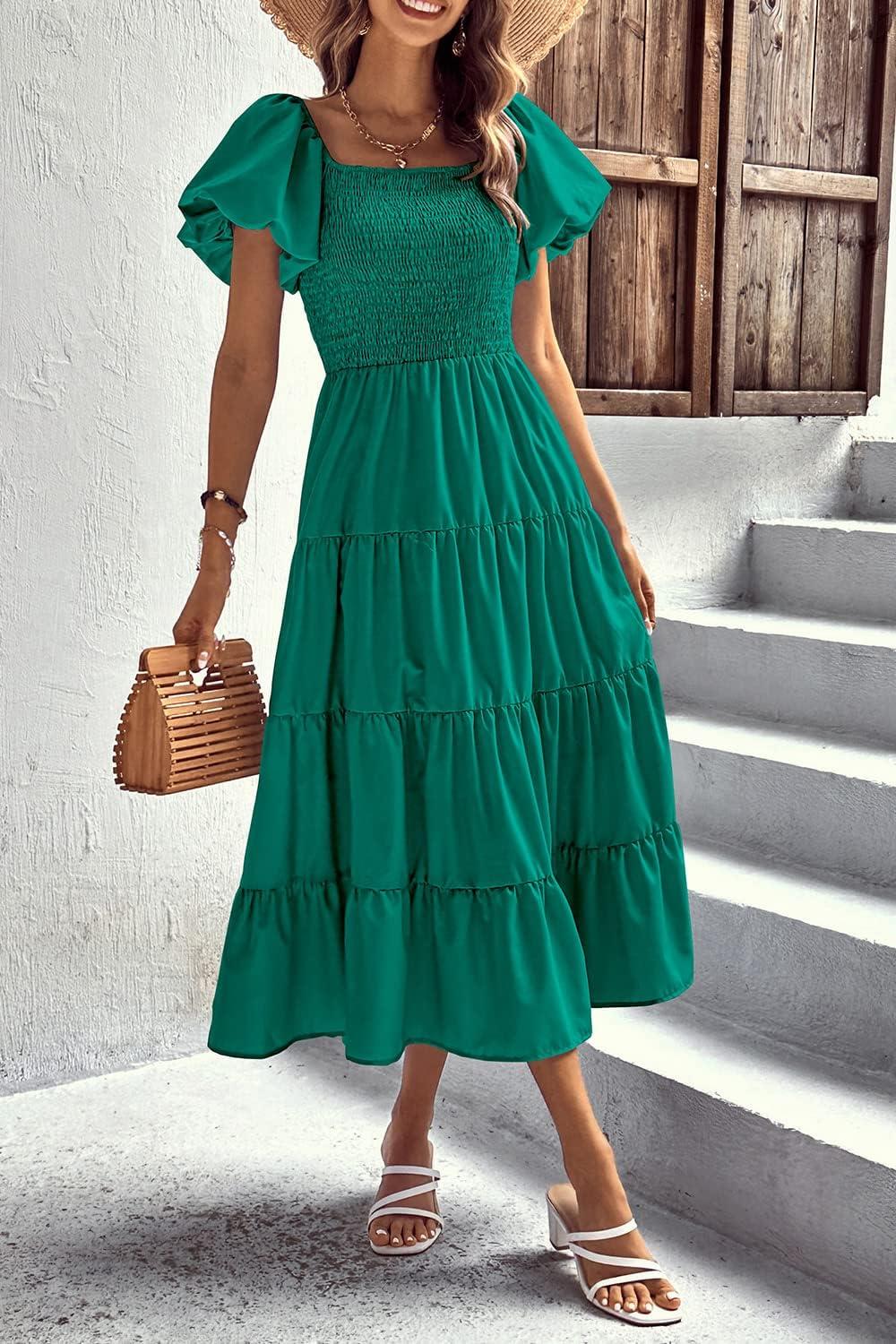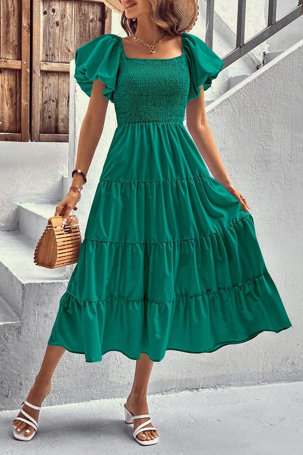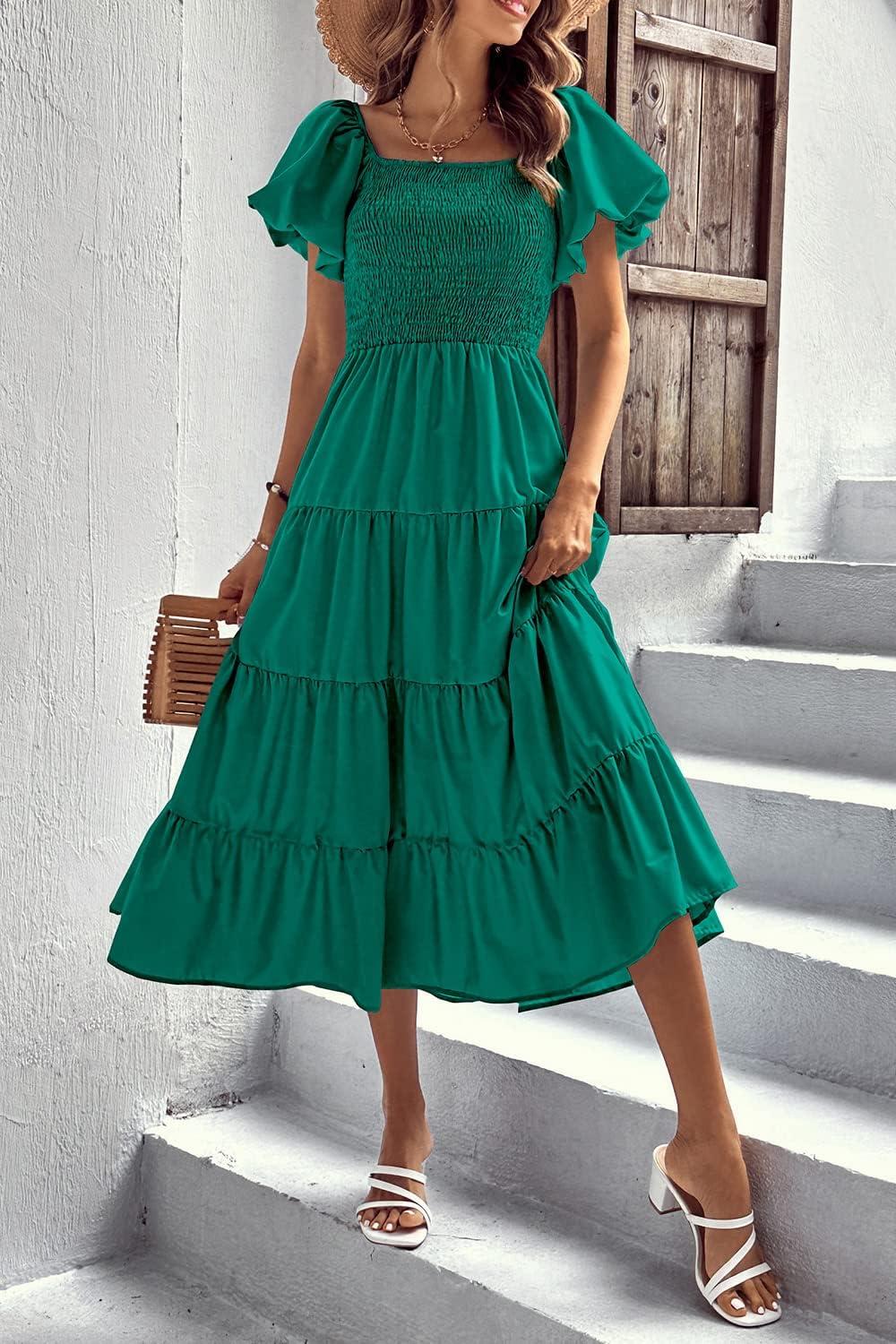 PRETTYGARDEN Women's Casual Summer Midi Dress Puffy Short Sleeve Square Neck Smocked Tiered Ruffle Dresses(Dark Green)