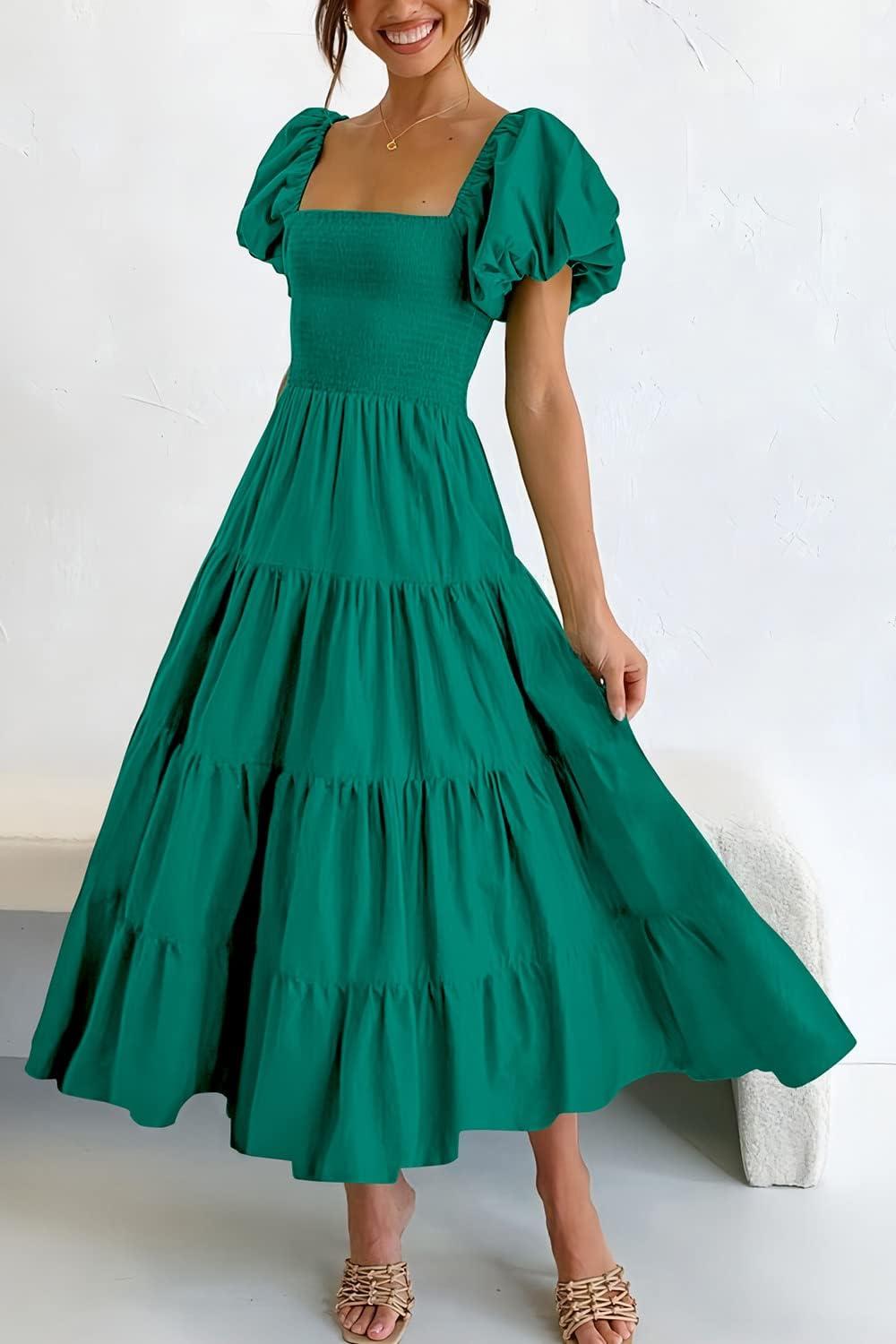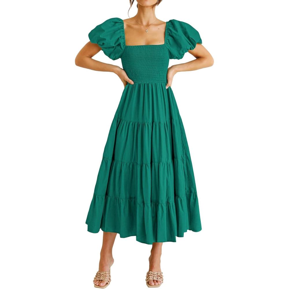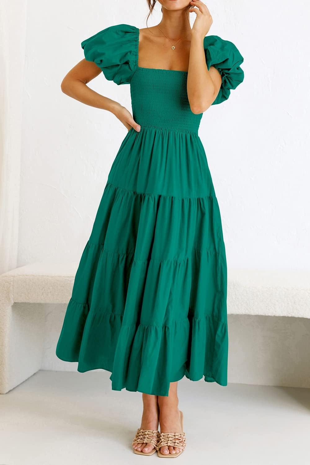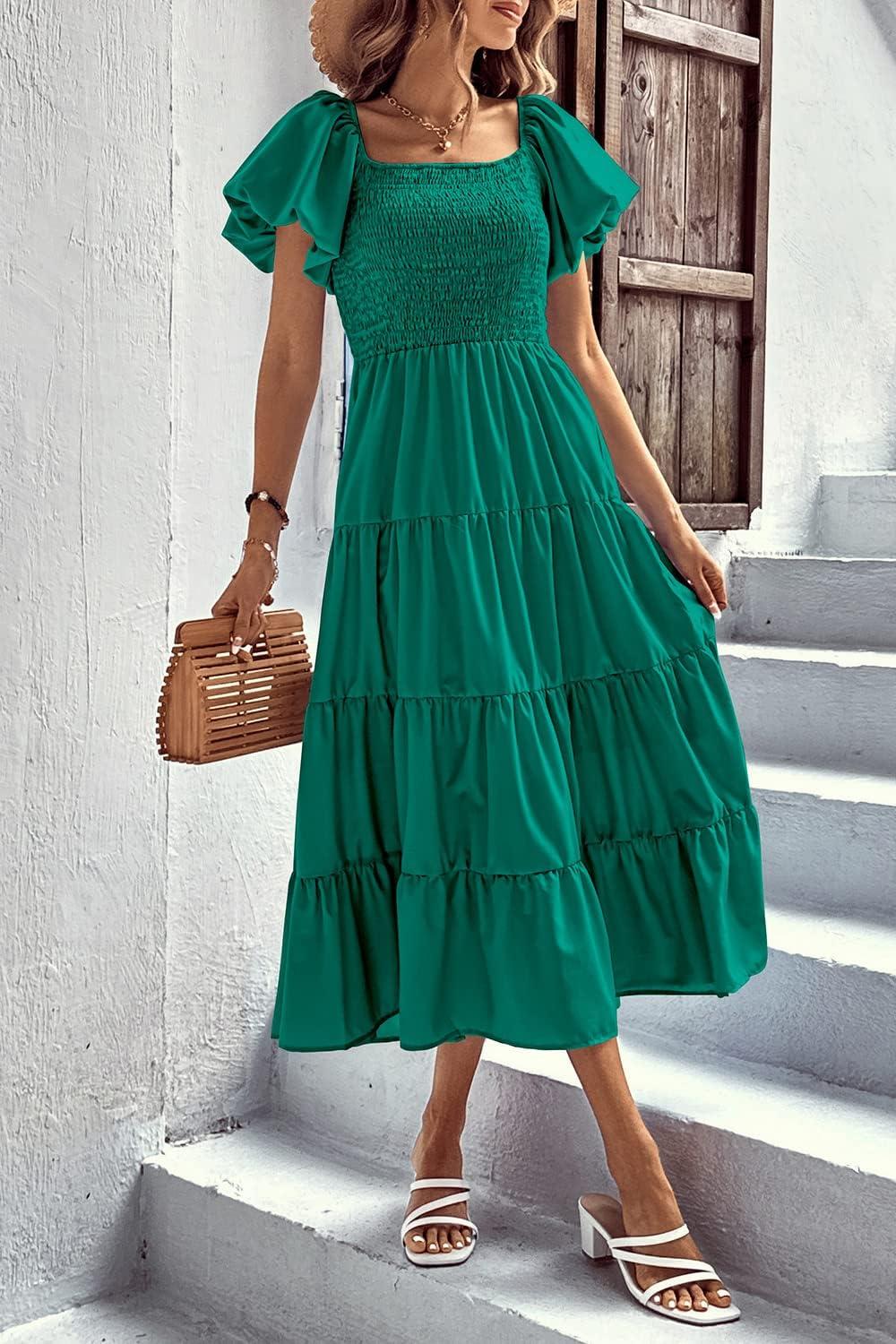 PRETTYGARDEN Women's Casual Summer Midi Dress Puffy Short Sleeve Square Neck Smocked Tiered Ruffle Dresses(Dark Green)