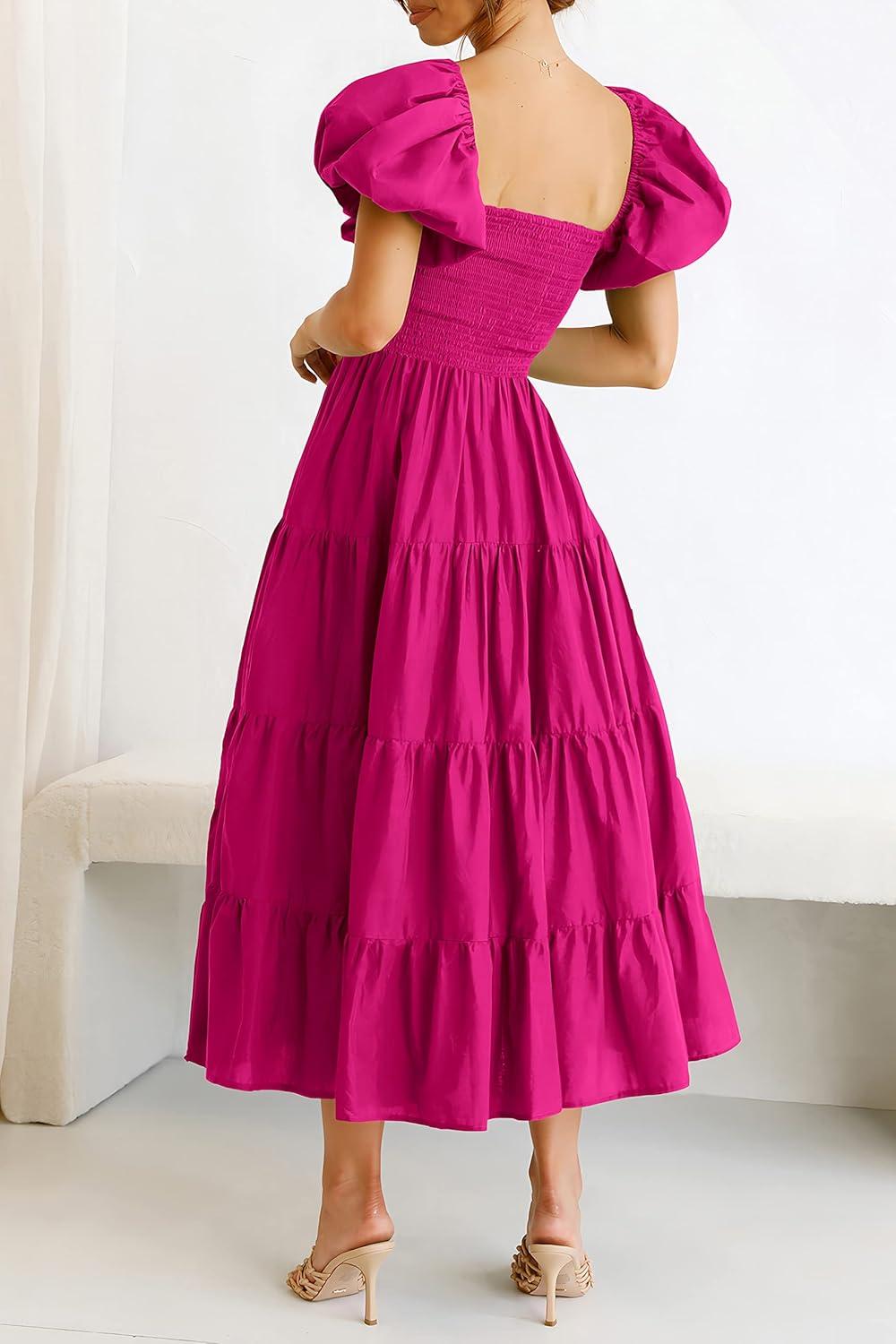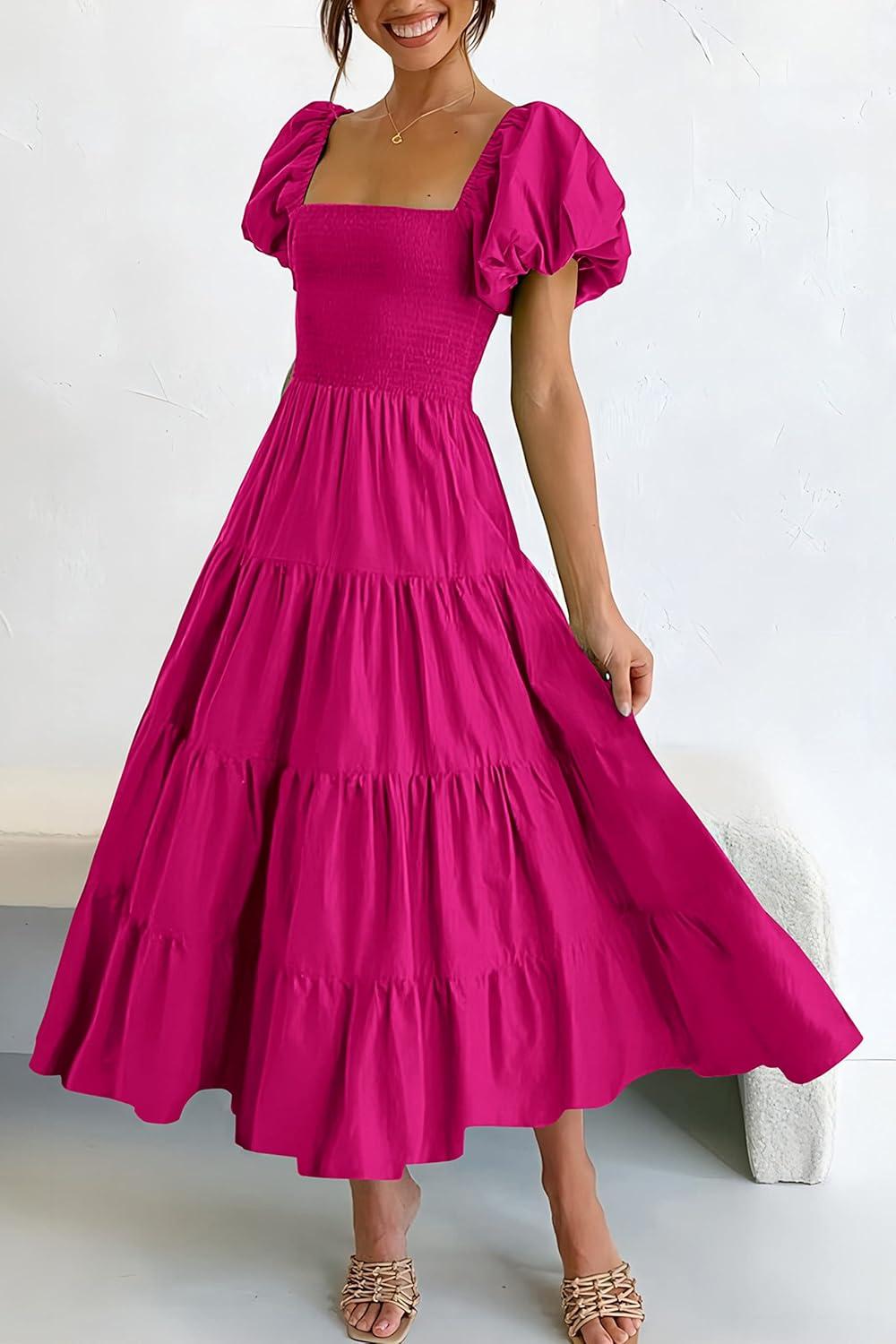 PRETTYGARDEN Women's Casual Summer Midi Dress Puffy Short Sleeve Square Neck Smocked Tiered Ruffle Dresses(Dark Rose Red)