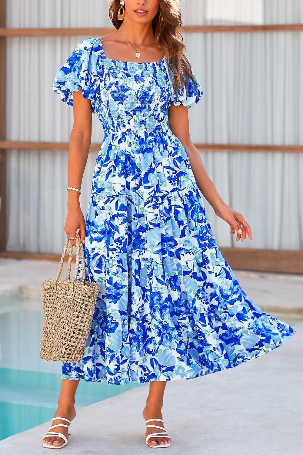 PRETTYGARDEN Women's Casual Summer Midi Dress Puffy Short Sleeve Square Neck Smocked Tiered Ruffle Dresses(Floral Blue)