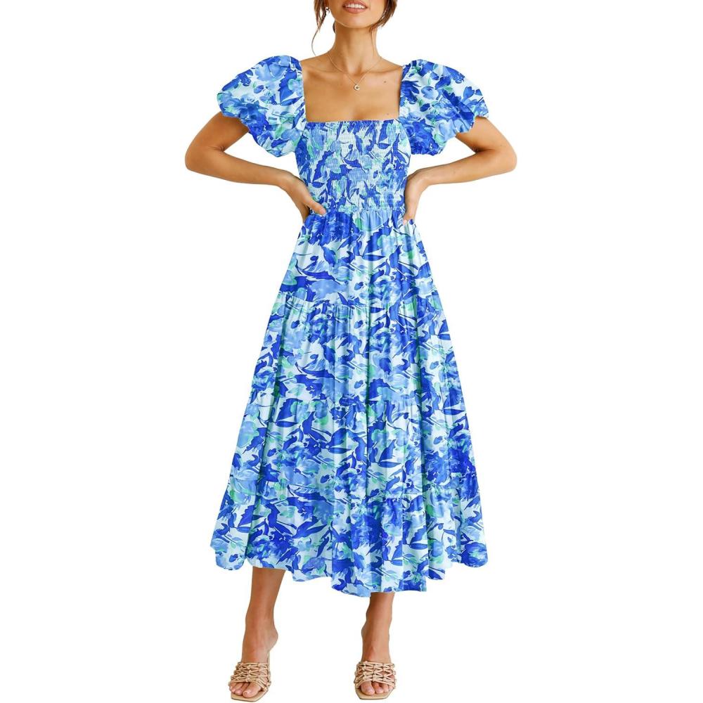 PRETTYGARDEN Women’s Casual Summer Midi Dress Puffy Short Sleeve Square Neck Smocked Tiered Ruffle Dresses(Floral Blue)
