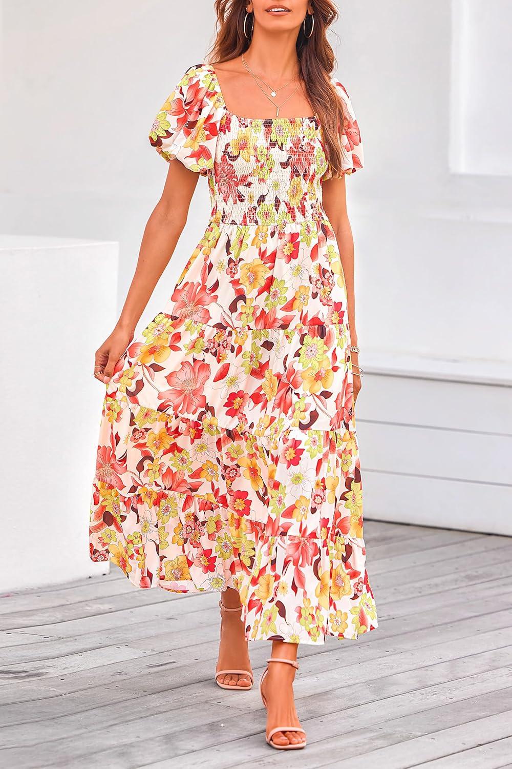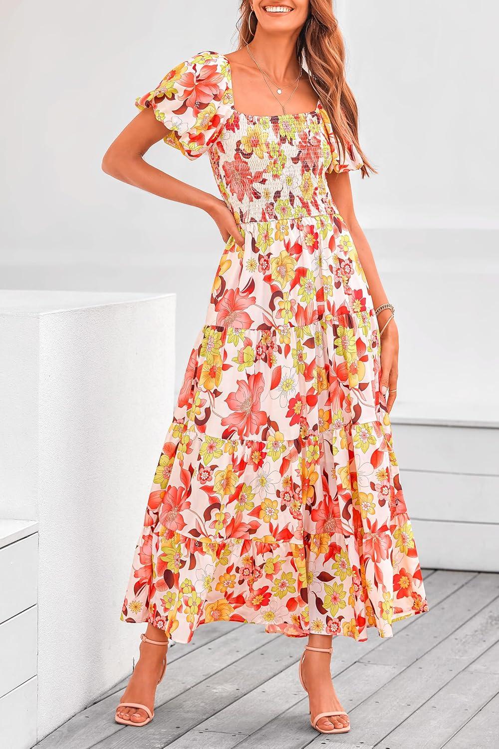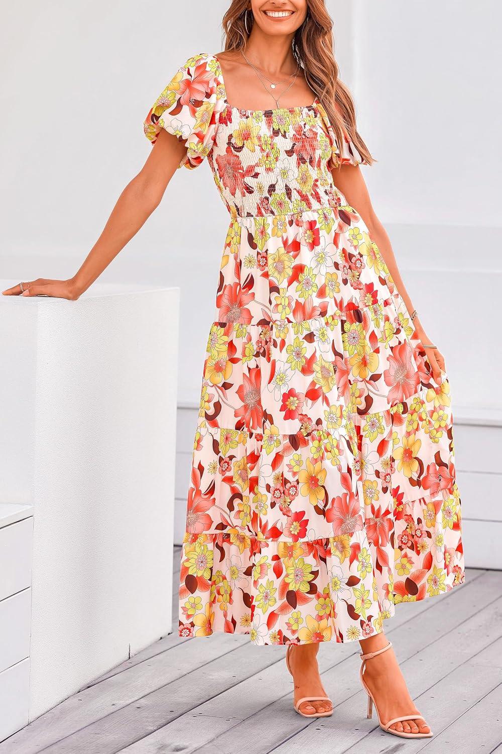 PRETTYGARDEN Women's Casual Summer Midi Dress Puffy Short Sleeve Square Neck Smocked Tiered Ruffle Dresses(Floral Orange Red)