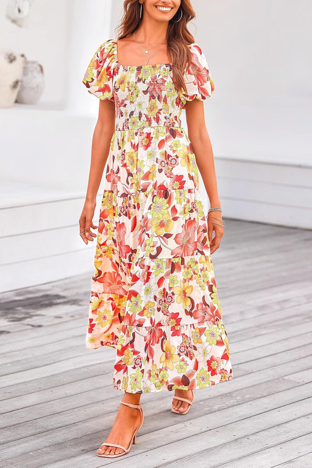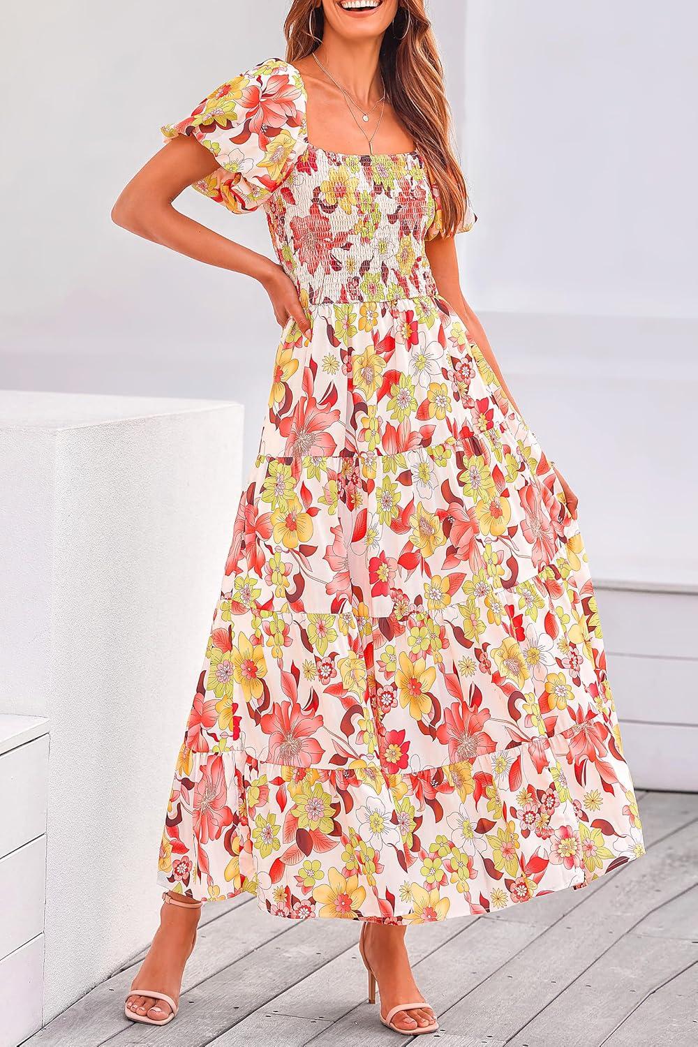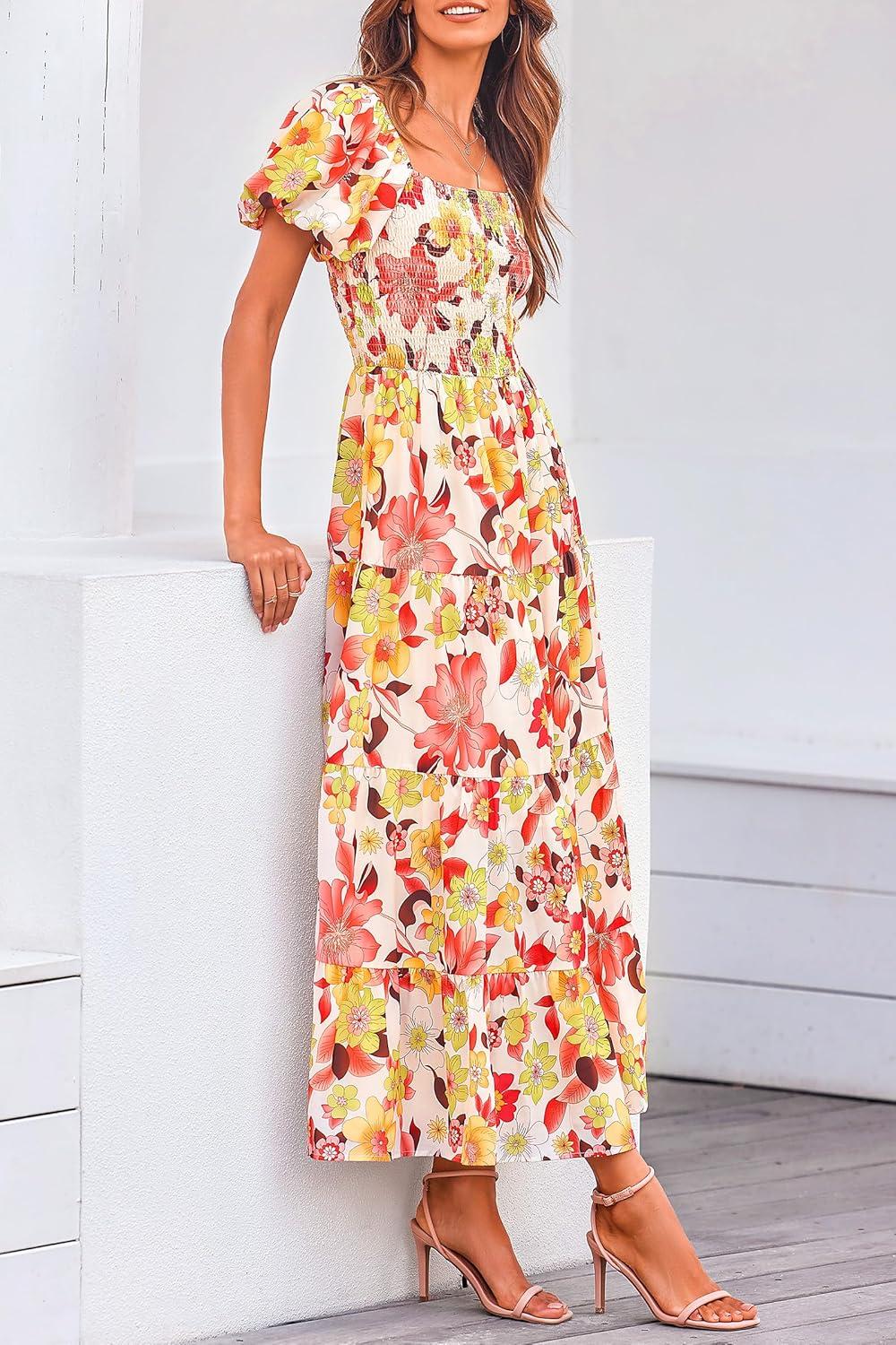 PRETTYGARDEN Women's Casual Summer Midi Dress Puffy Short Sleeve Square Neck Smocked Tiered Ruffle Dresses(Floral Orange Red)