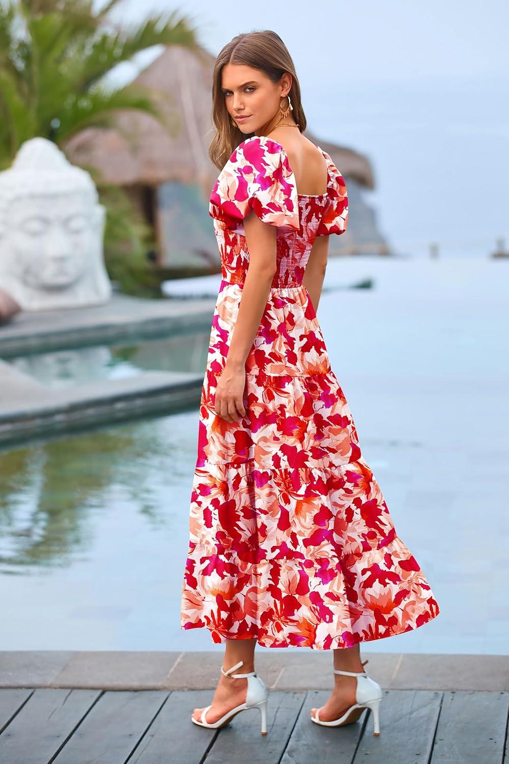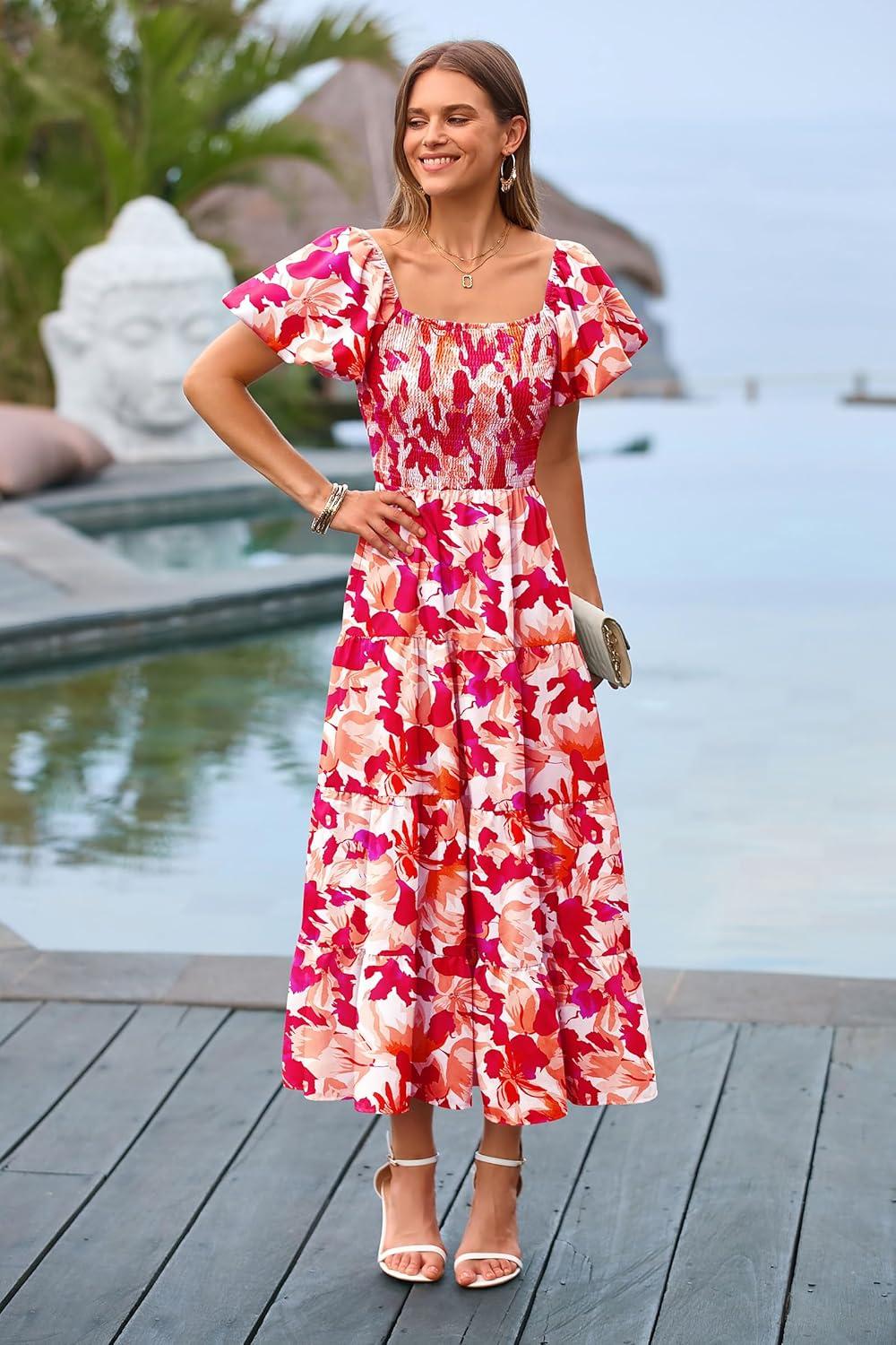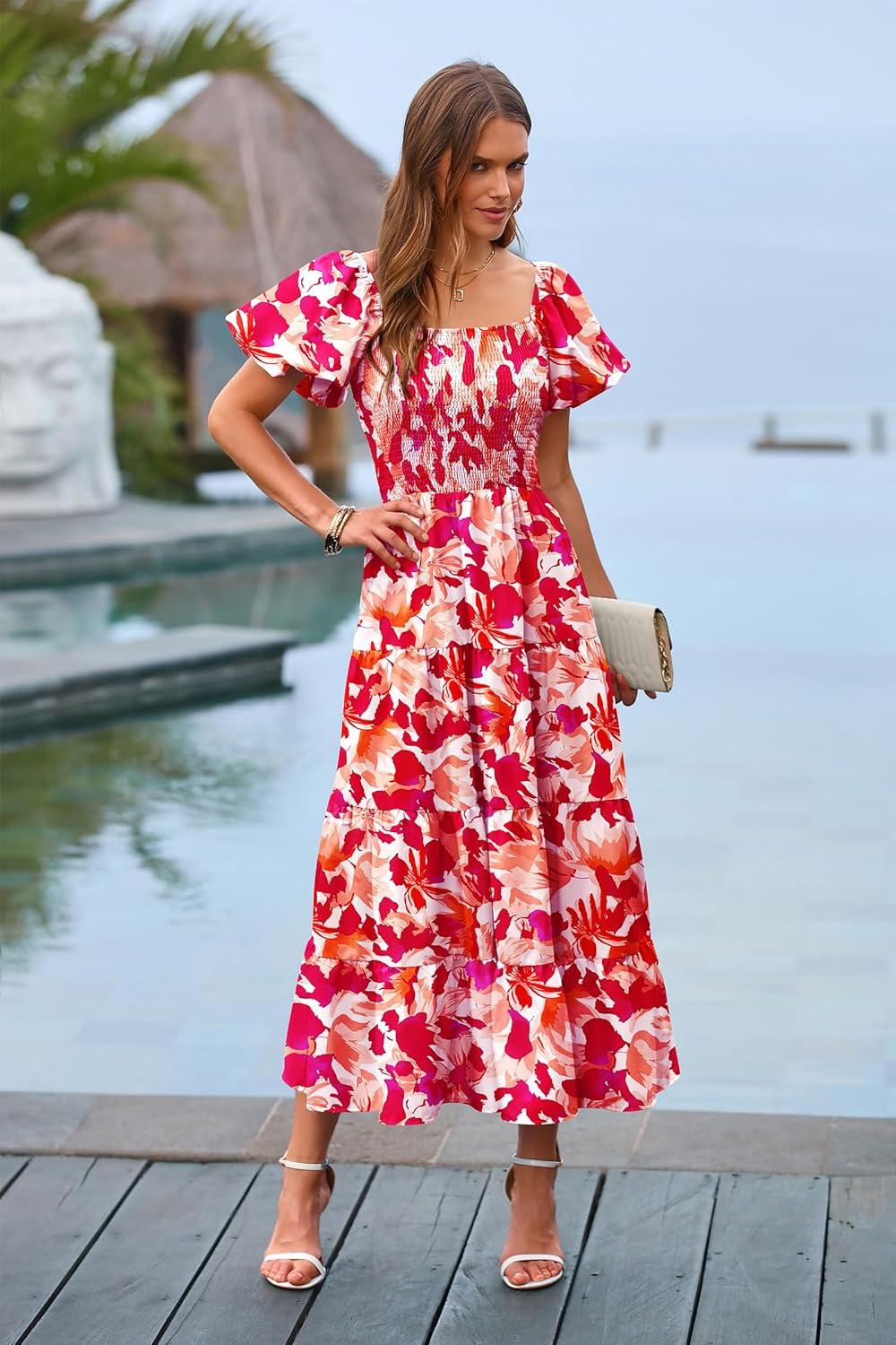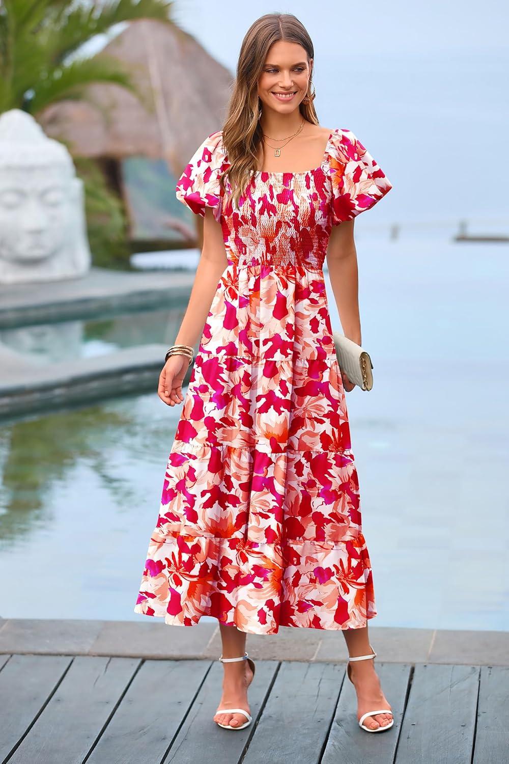 PRETTYGARDEN Women’s Casual Summer Midi Dress Puffy Short Sleeve Square Neck Smocked Tiered Ruffle Dresses(Floral Rose Red)