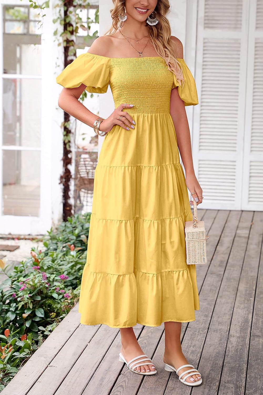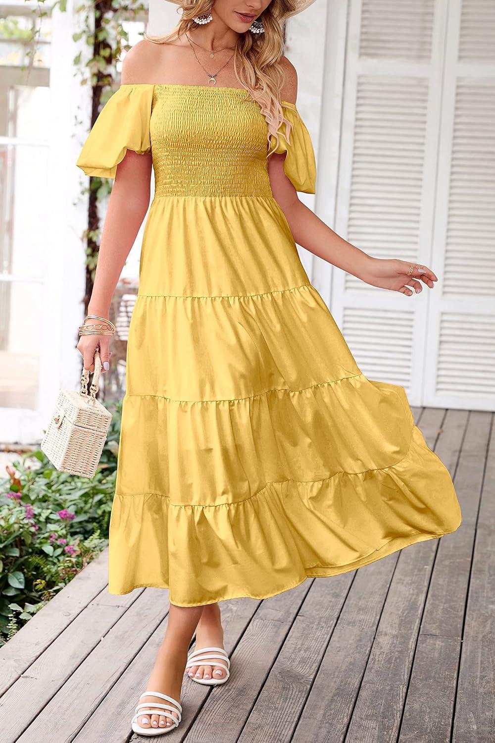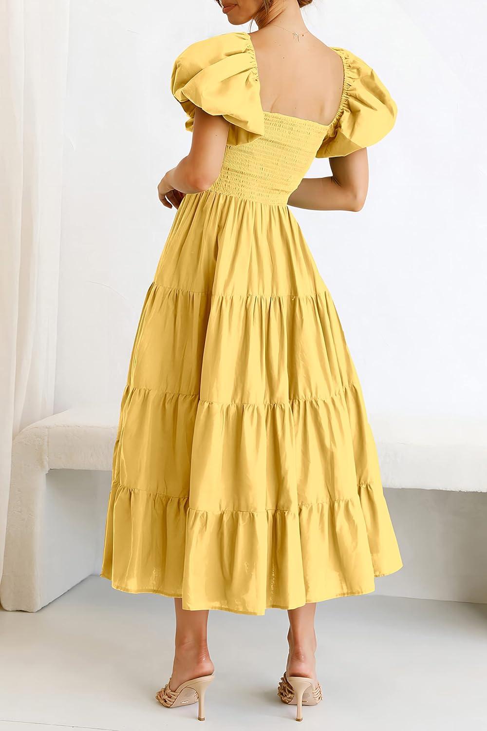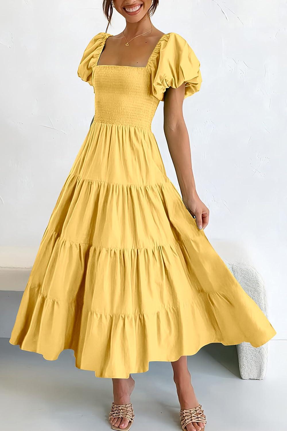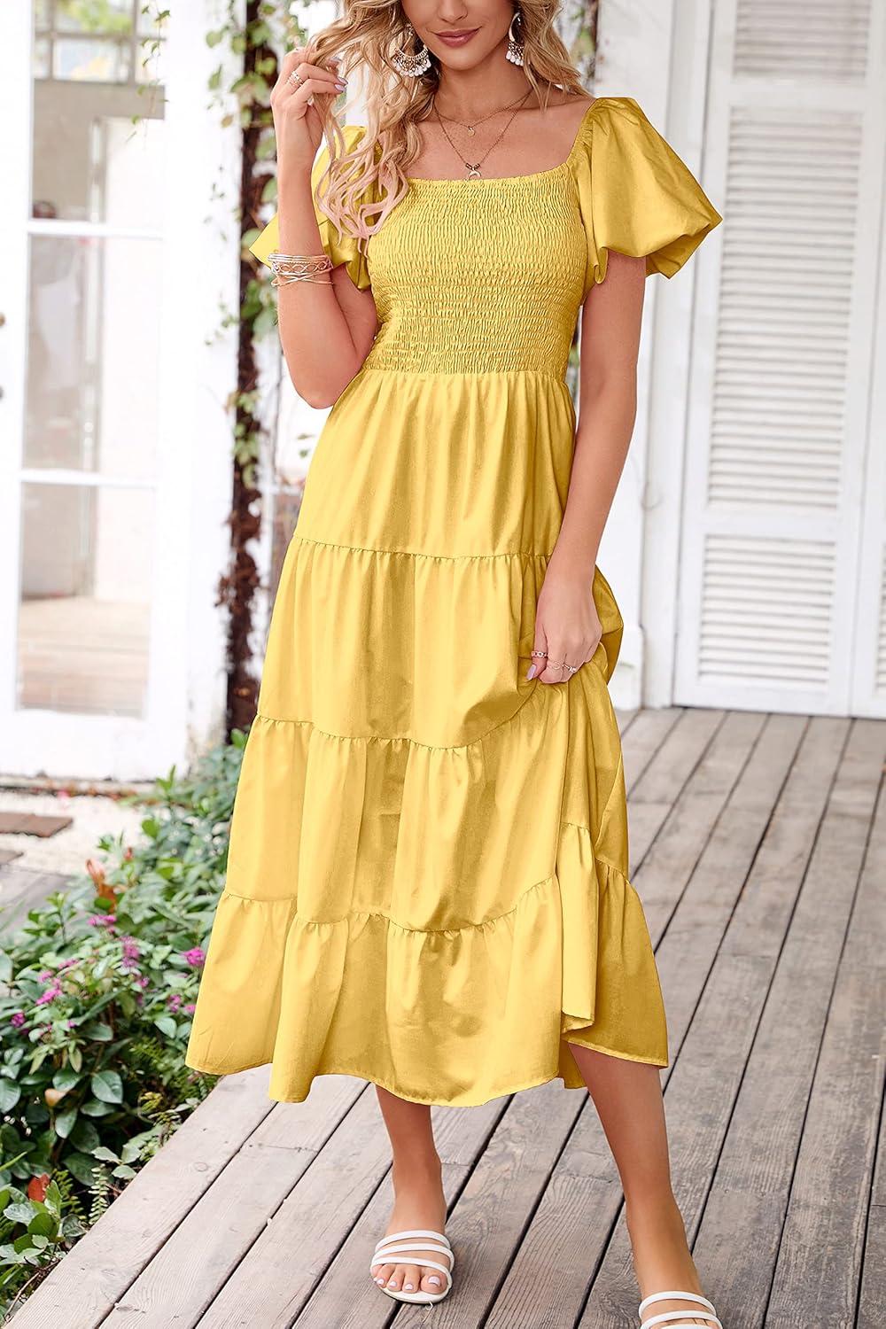 PRETTYGARDEN Women's Casual Summer Midi Dress Puffy Short Sleeve Square Neck Smocked Tiered Ruffle Dresses(Yellow)