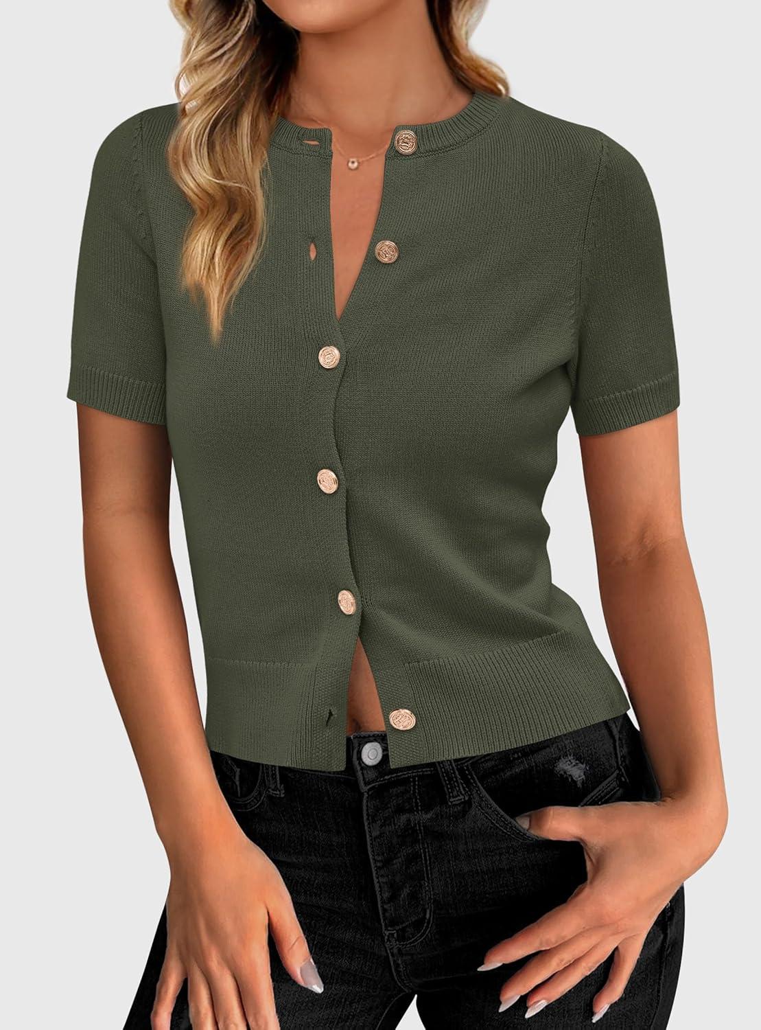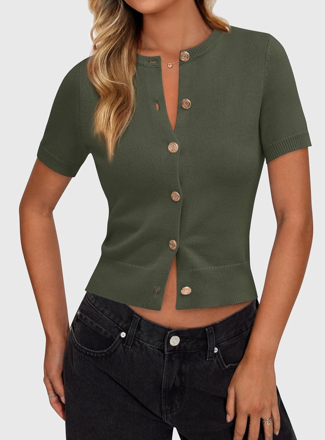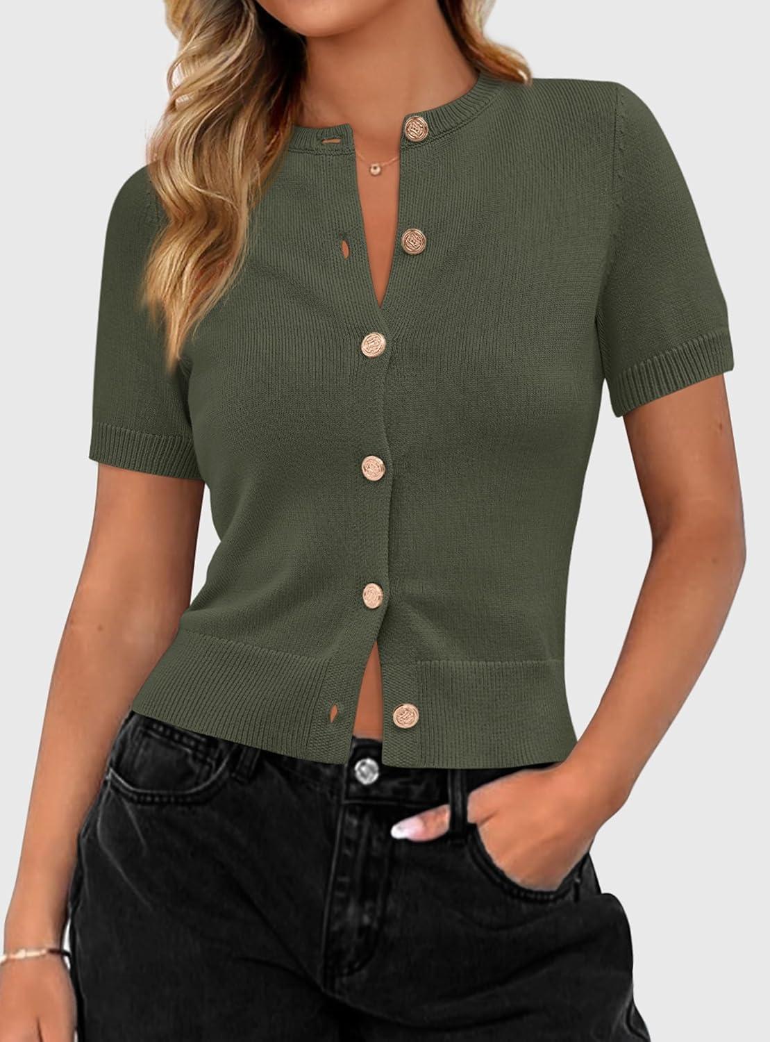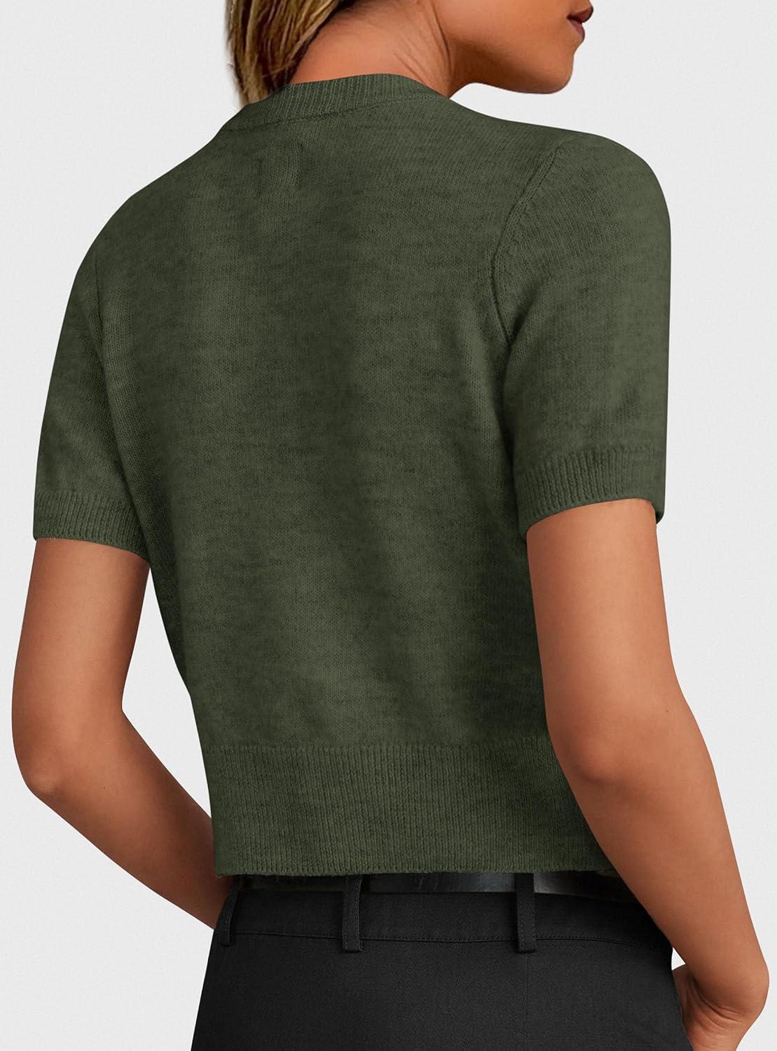 PRETTYGARDEN Womens Casual Summer Short Sleeve Cardigans 2025 Button Down Knitted Sweater Basic Crew Neck Crop Tops(Army Green)