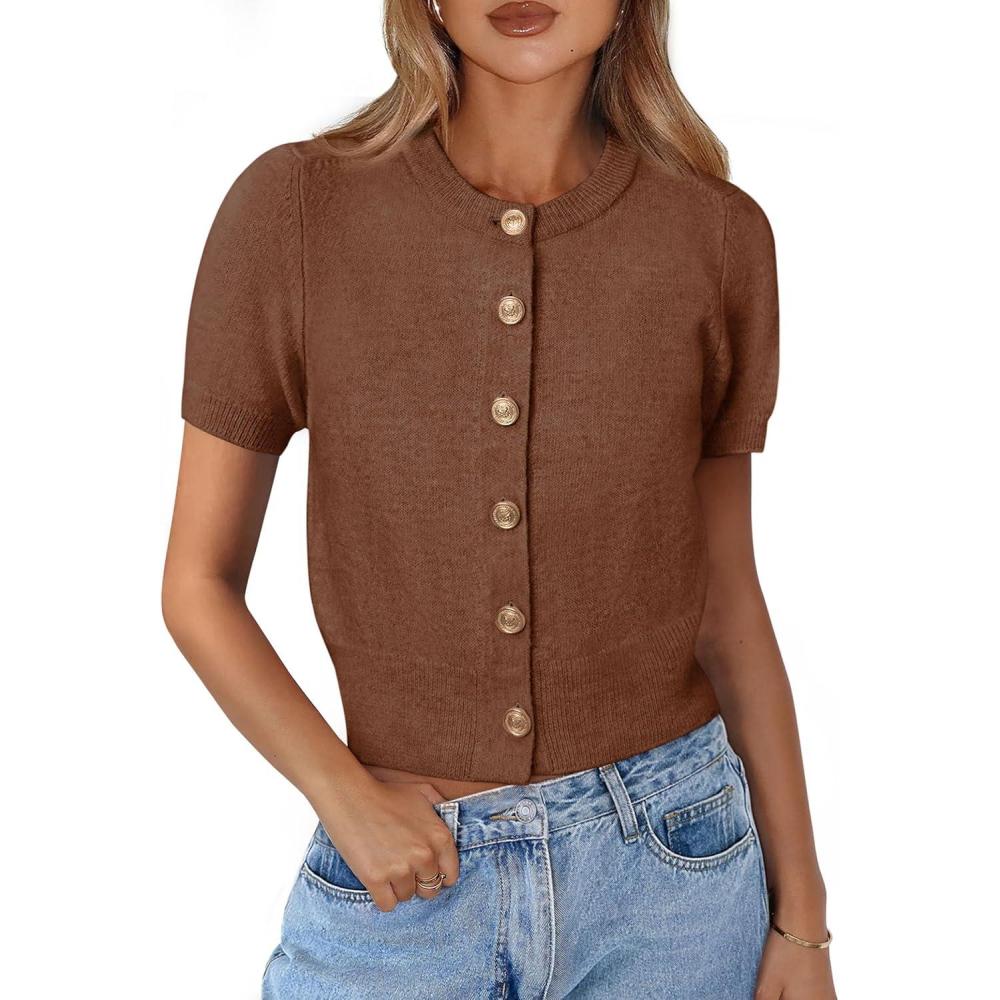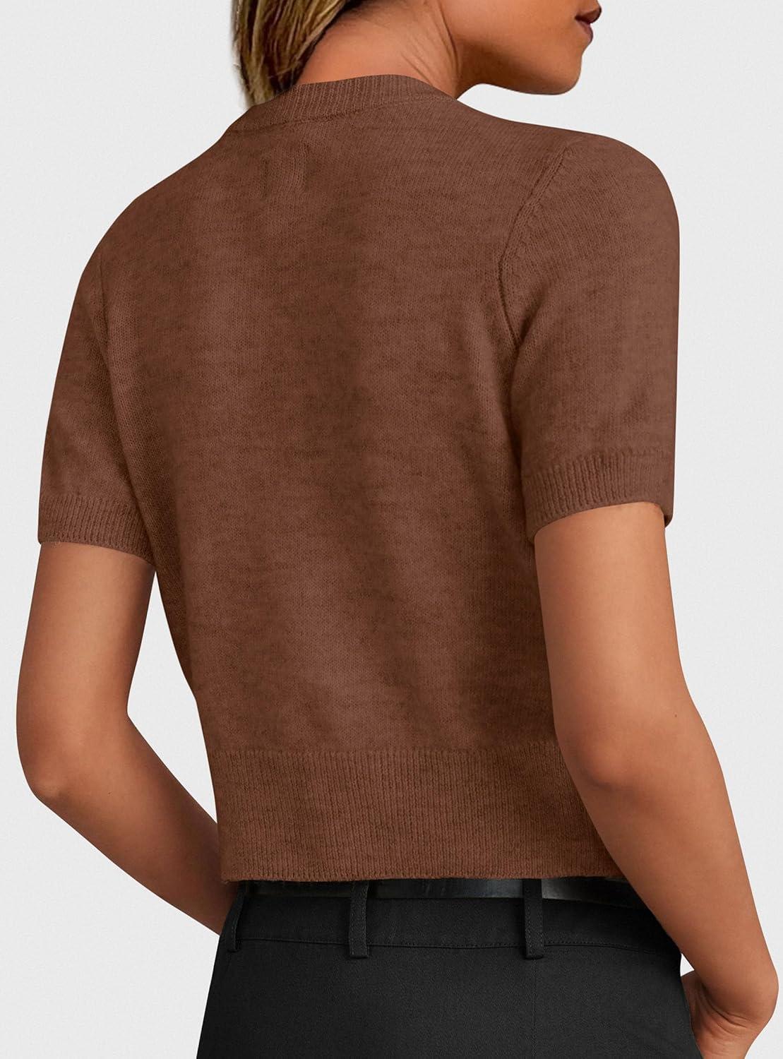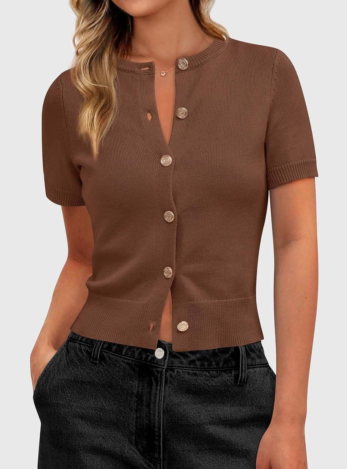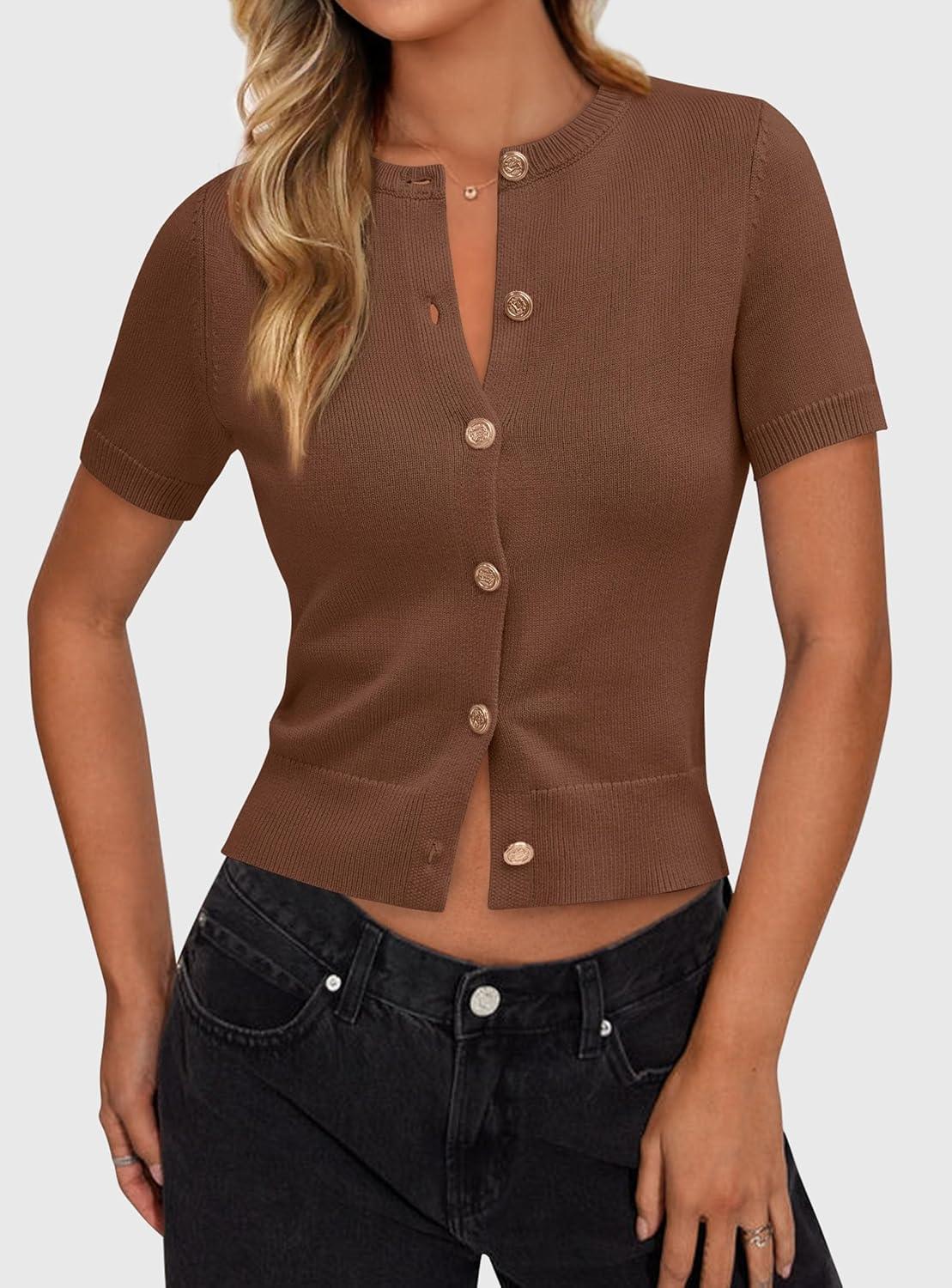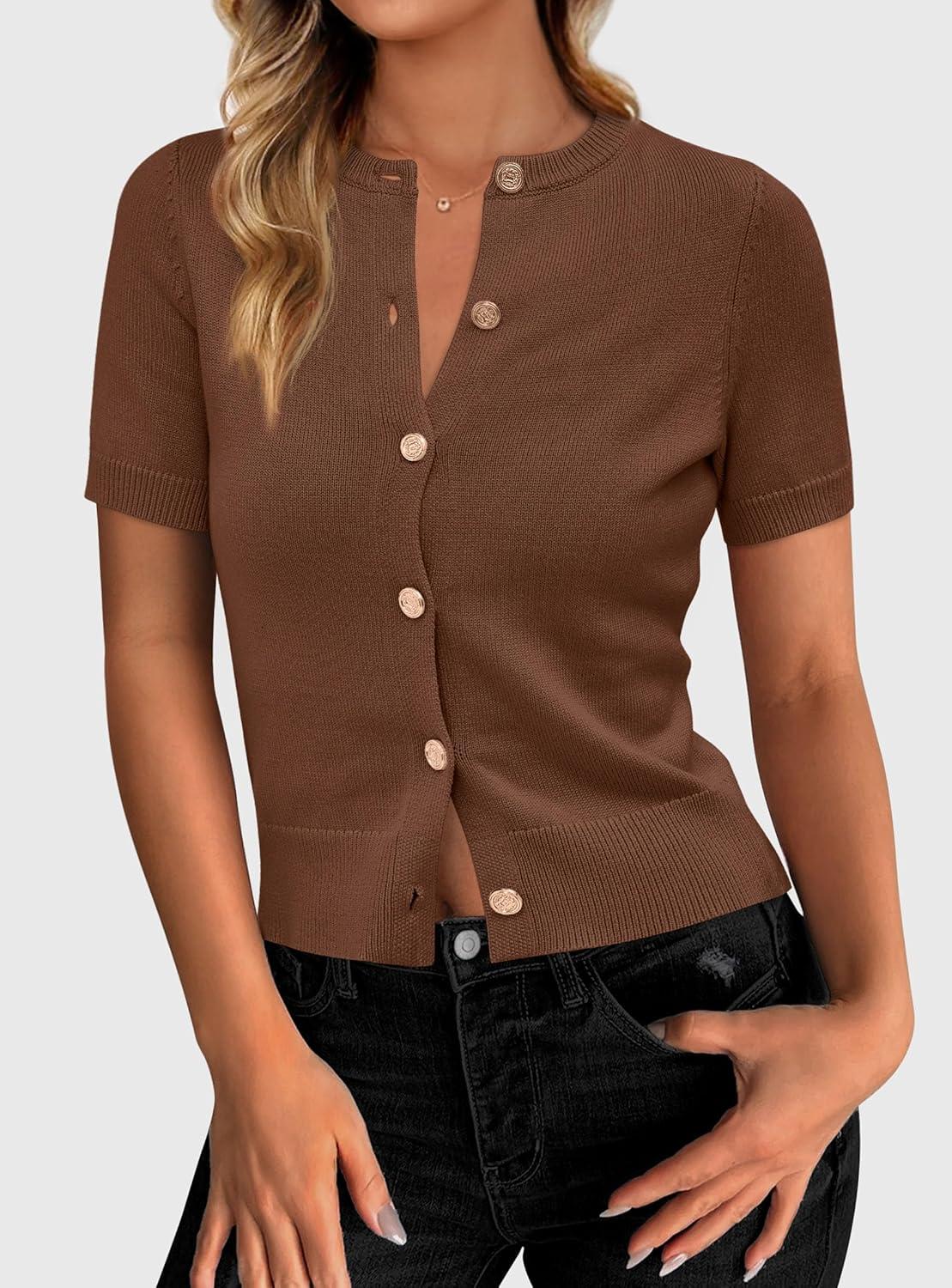 PRETTYGARDEN Womens Casual Summer Short Sleeve Cardigans 2025 Button Down Knitted Sweater Basic Crew Neck Crop Tops(Brown)