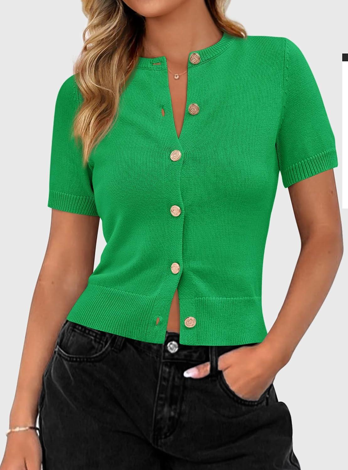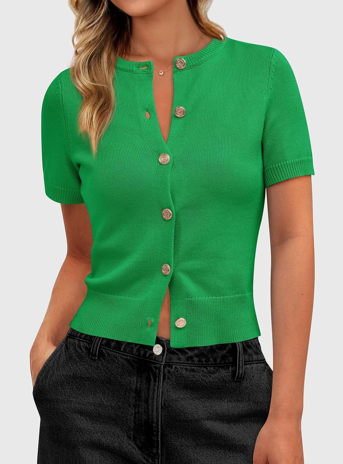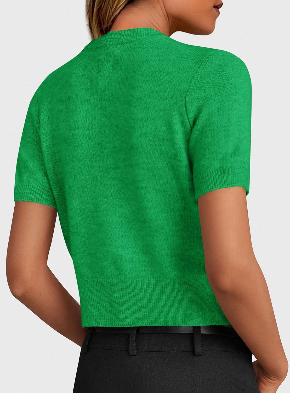 PRETTYGARDEN Womens Casual Summer Short Sleeve Cardigans 2025 Button Down Knitted Sweater Basic Crew Neck Crop Tops(Green)