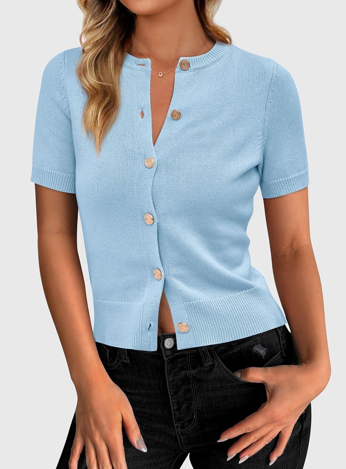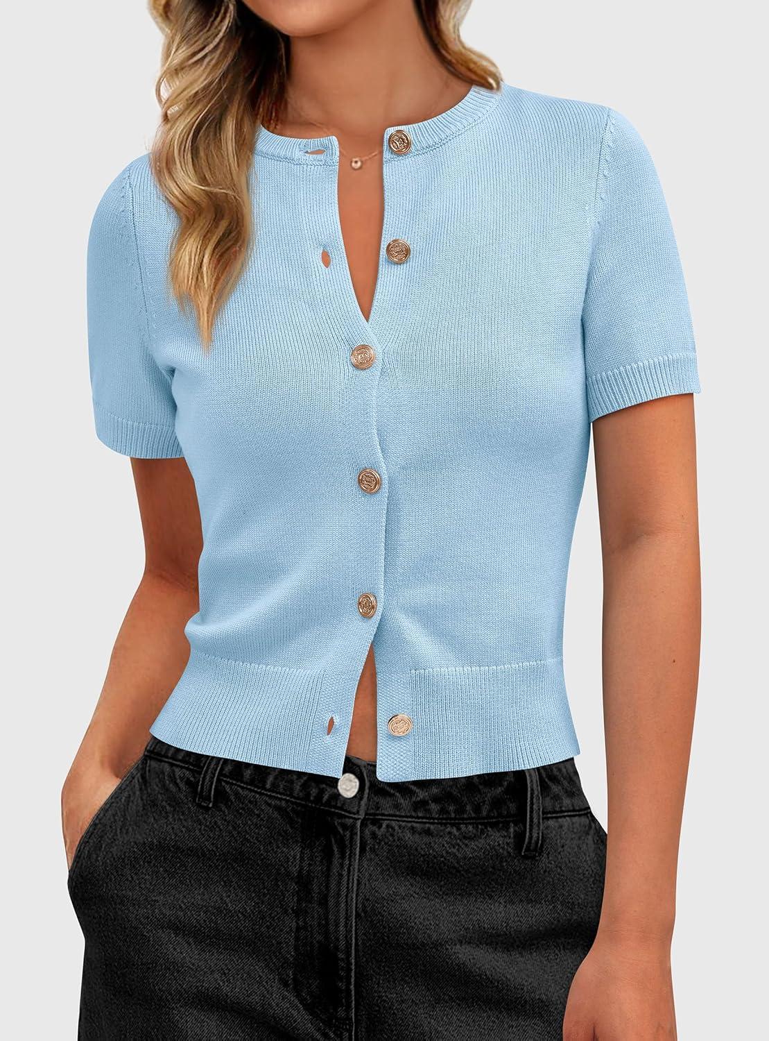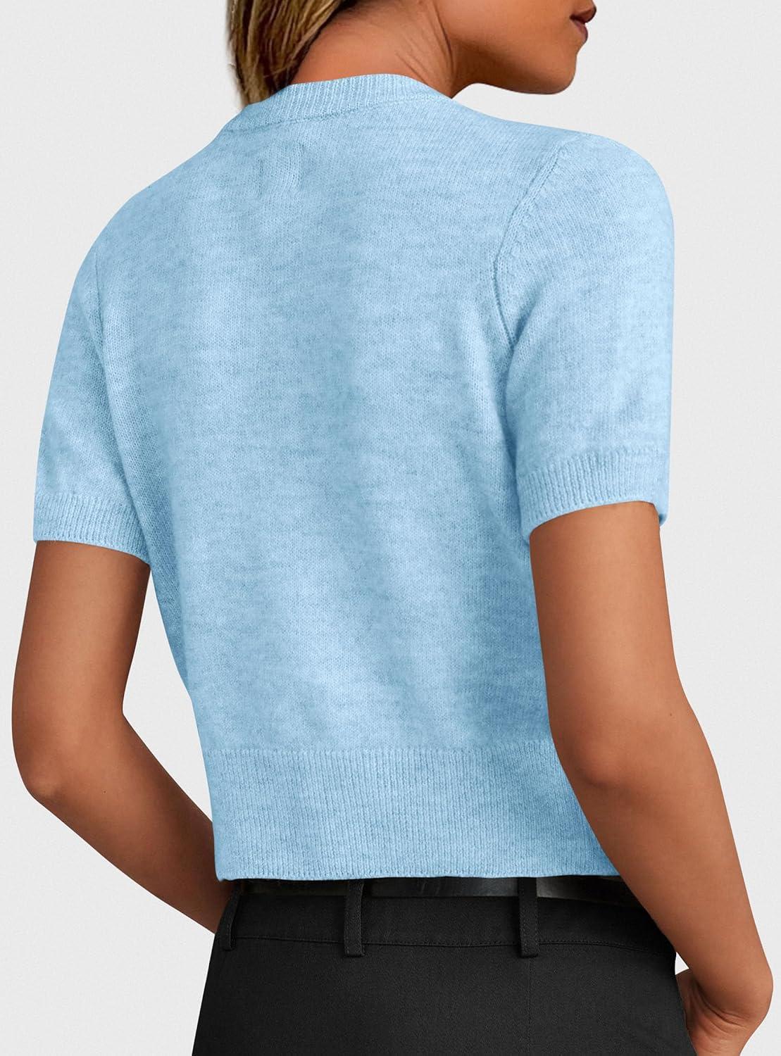 PRETTYGARDEN Womens Casual Summer Short Sleeve Cardigans 2025 Button Down Knitted Sweater Basic Crew Neck Crop Tops(Light Blue)