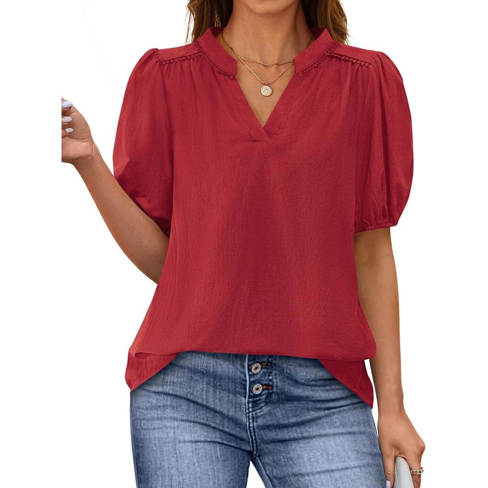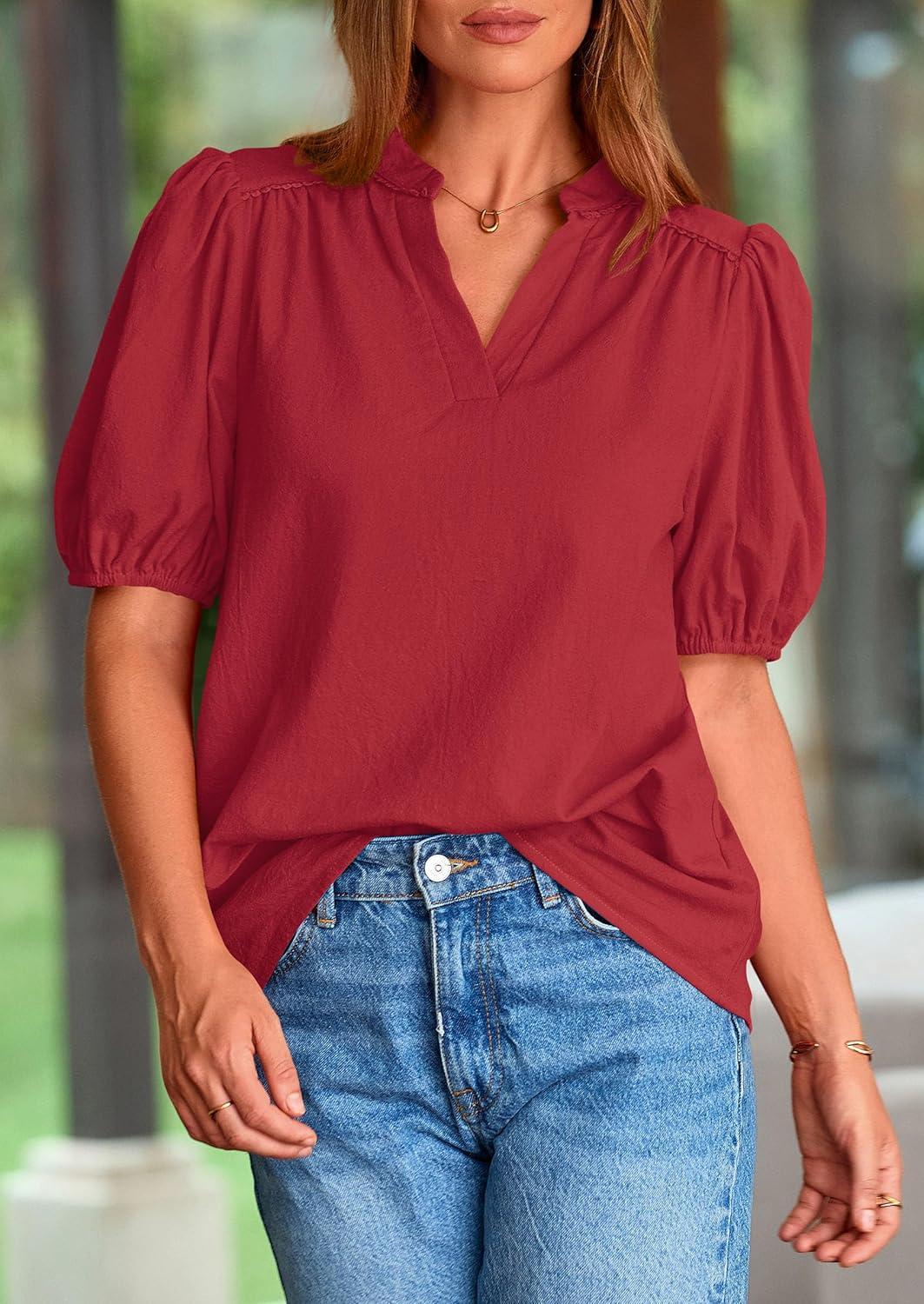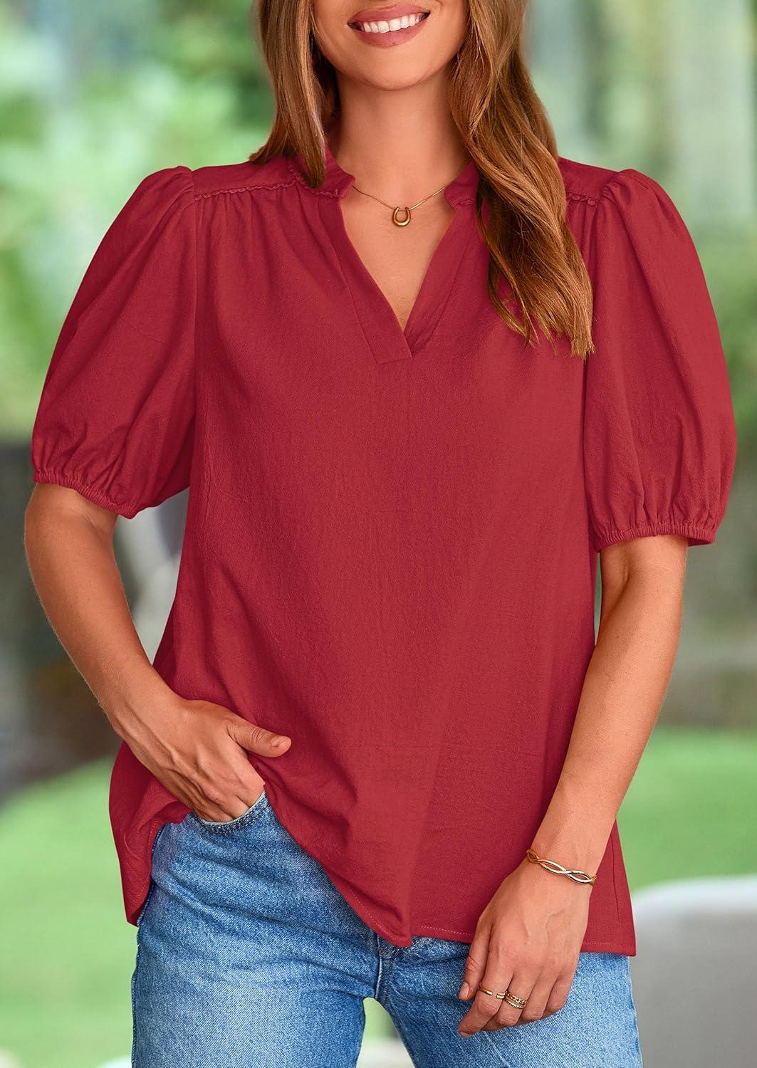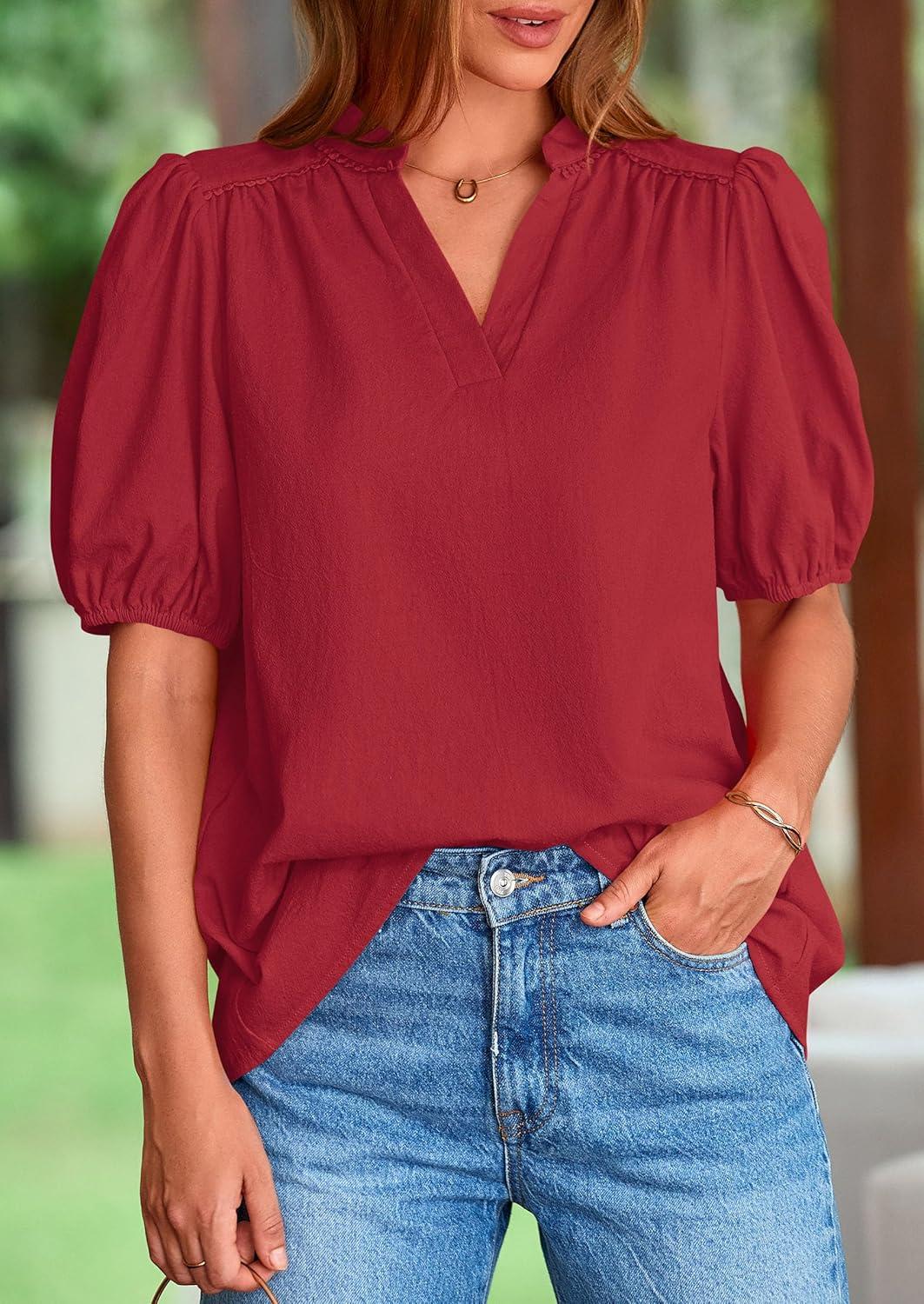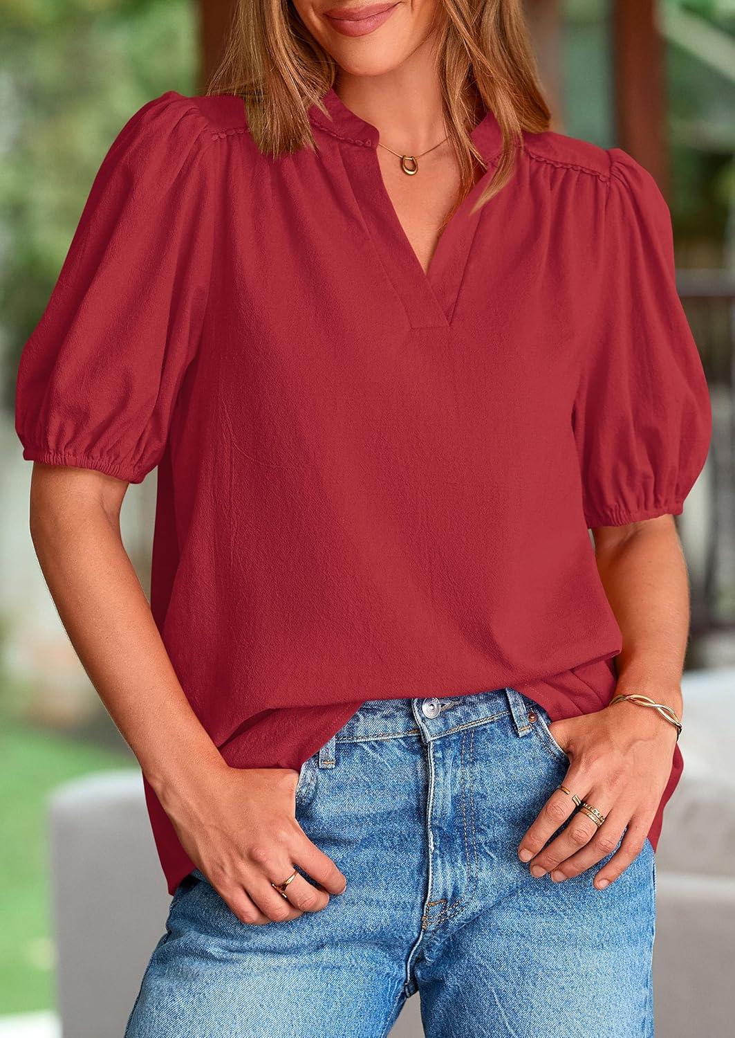 PRETTYGARDEN Womens Casual Summer Tops 2025 V Neck Short Puff Sleeve Pleated Cotton T Shirts Loose Dressy Blouses(Dark Red)