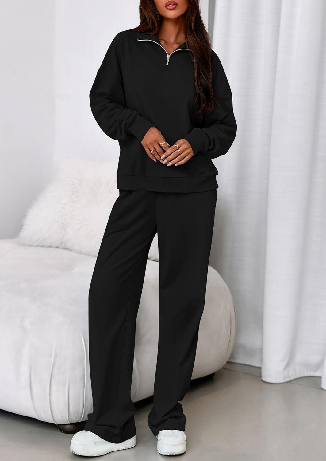 PRETTYGARDEN Womens Casual Two Piece Sets Fall 2025 Outfits Quarter Zip Sweatshirts Straight Leg Pants Sweatsuits Tracksuit(Black)