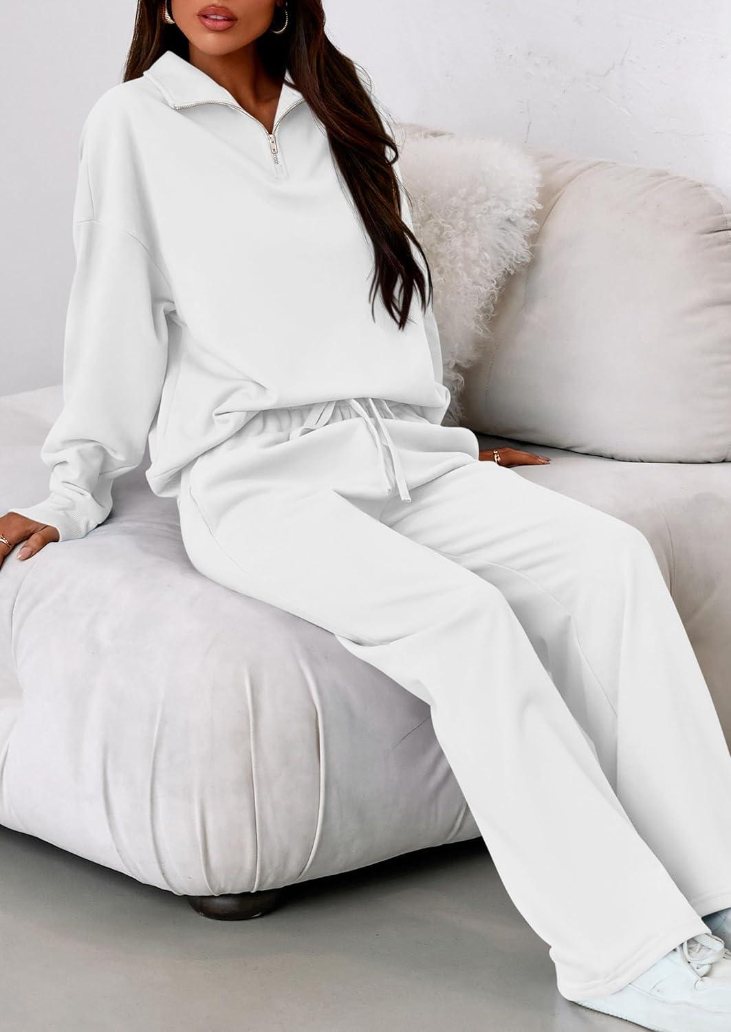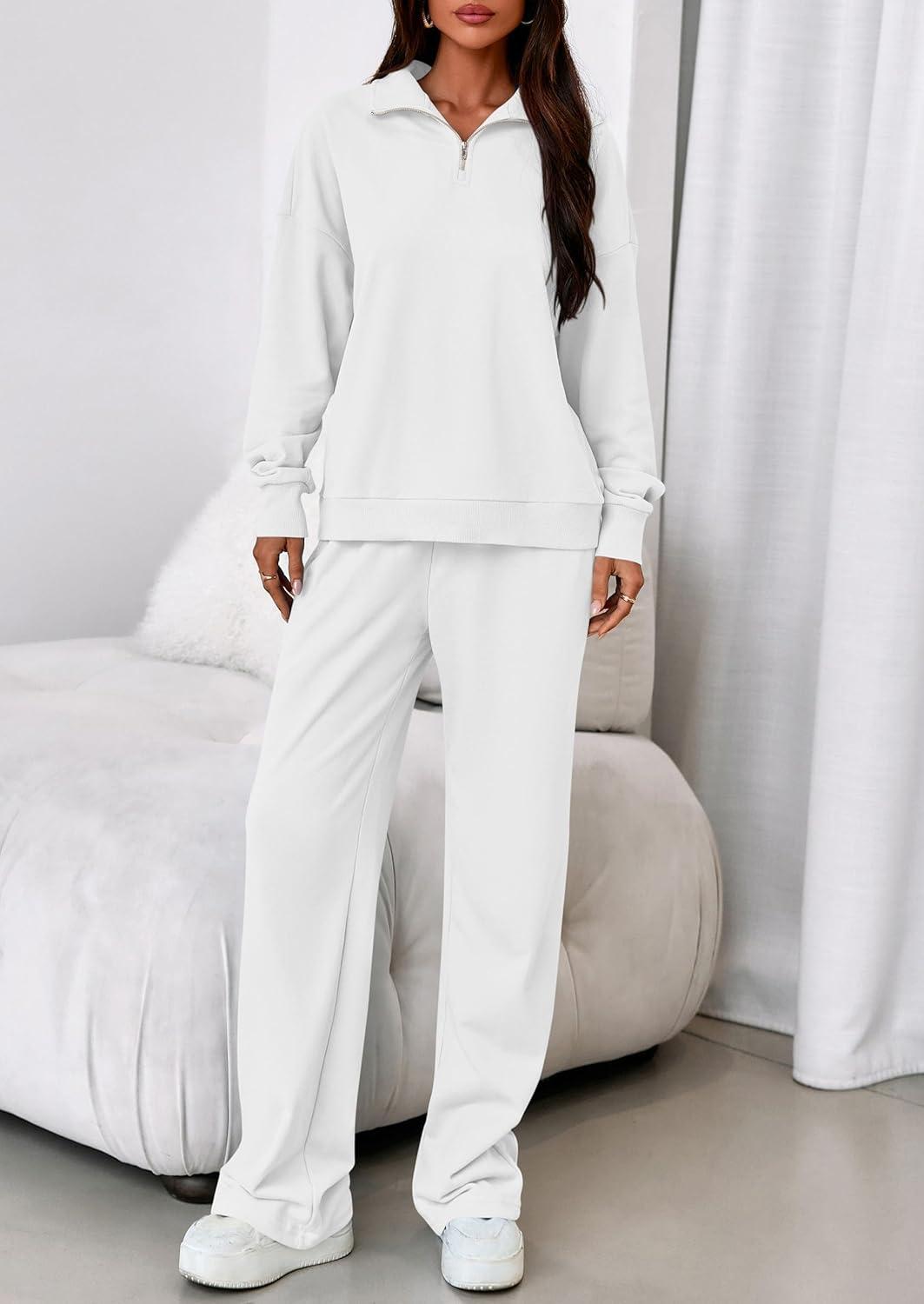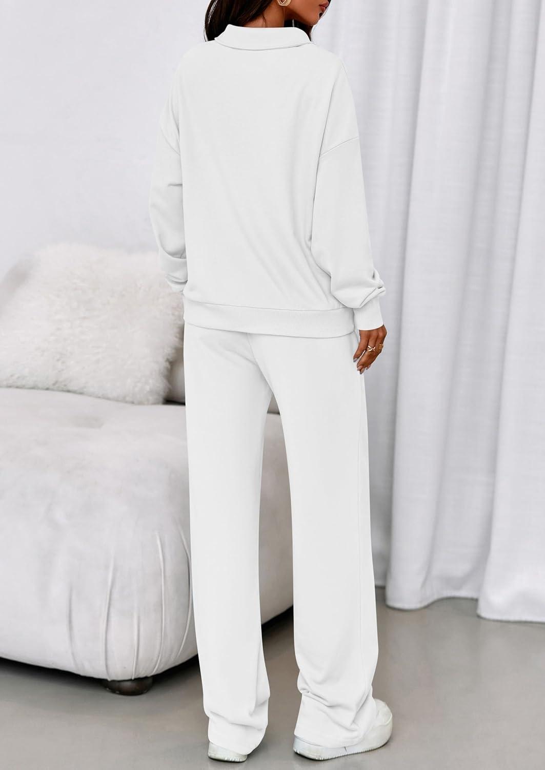 PRETTYGARDEN Womens Casual Two Piece Sets Fall 2025 Outfits Quarter Zip Sweatshirts Straight Leg Pants Sweatsuits Tracksuit(White)