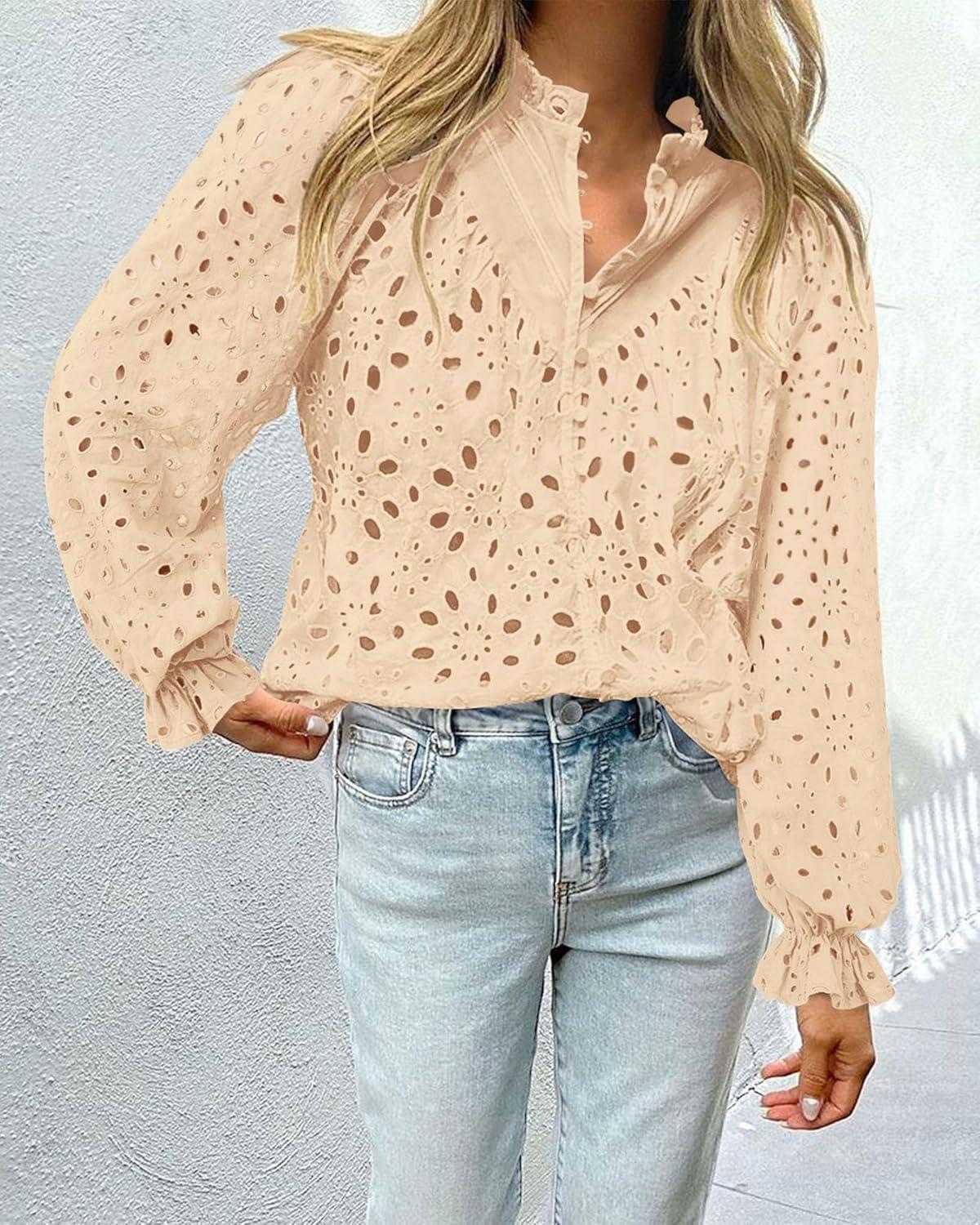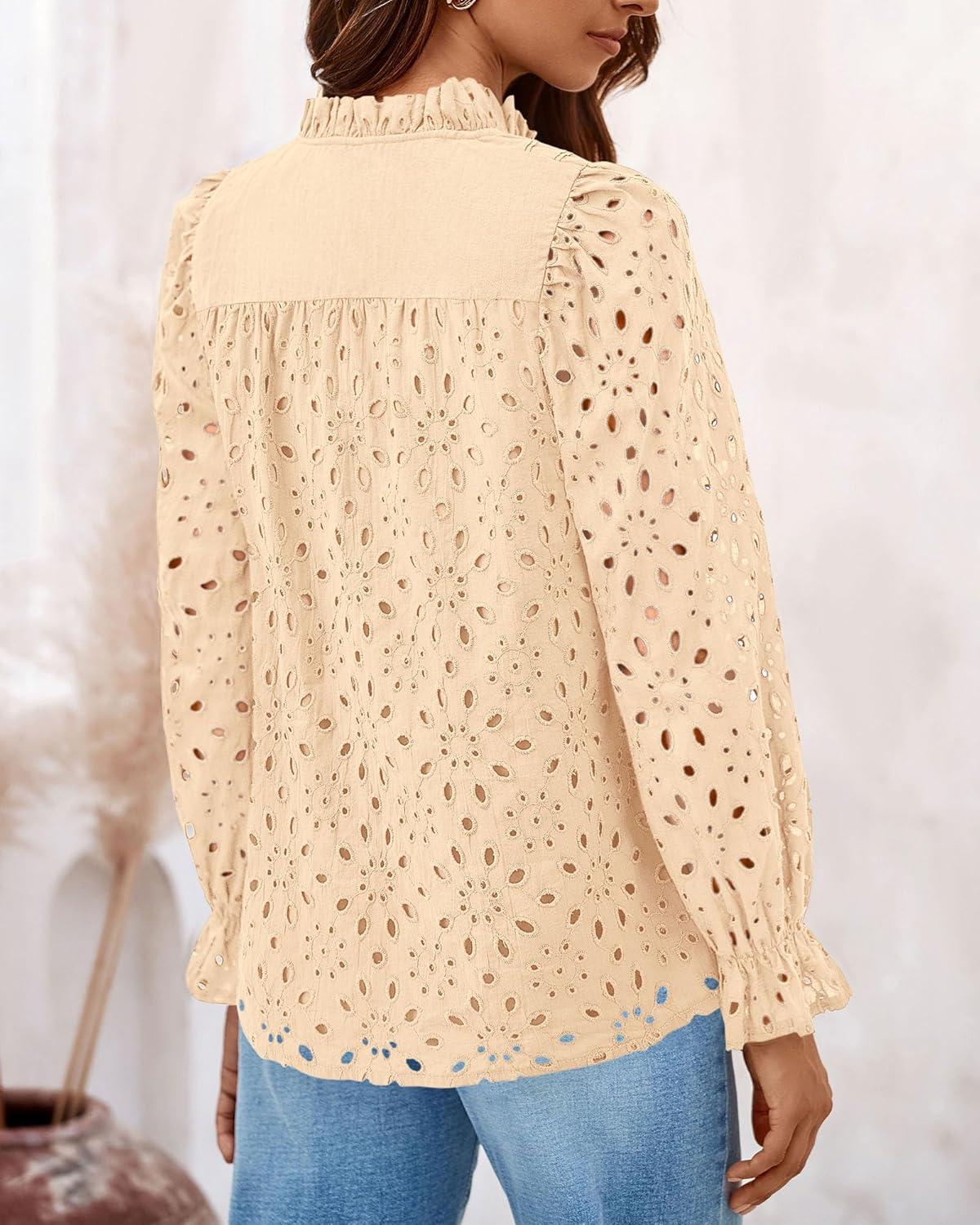 PRETTYGARDEN Women's Dressy Casual Blouse Tops Fall Spring Puff Long Sleeve Button V Neck Hollow Out Lace Embroidered Shirts(Beige)